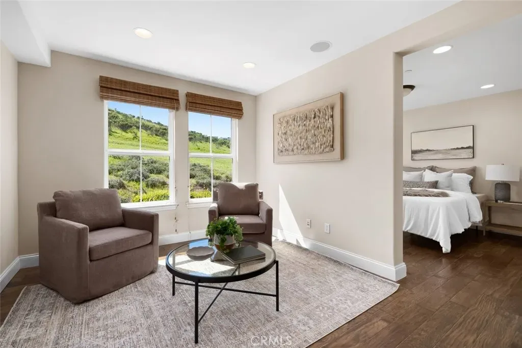 Designed for both refined entertaining and everyday comfort, the home features rich hickory wood and tile flooring throughout. A formal dining room, illuminated by a striking chandelier, is complemented by a stylish dry bar with wine storage and positioned perfectly to take in patio access and breathtaking views.