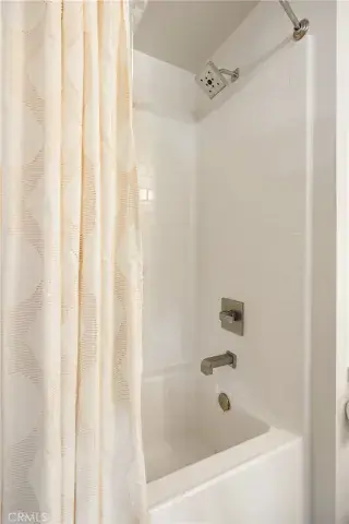 The spacious bedroom offers ample closet space, while the full bath impresses with a quartz vanity and stylish fiberglass shower surrounded by subway tile. In-unit laundry hookups (washer and electric dryer) add everyday ease.
