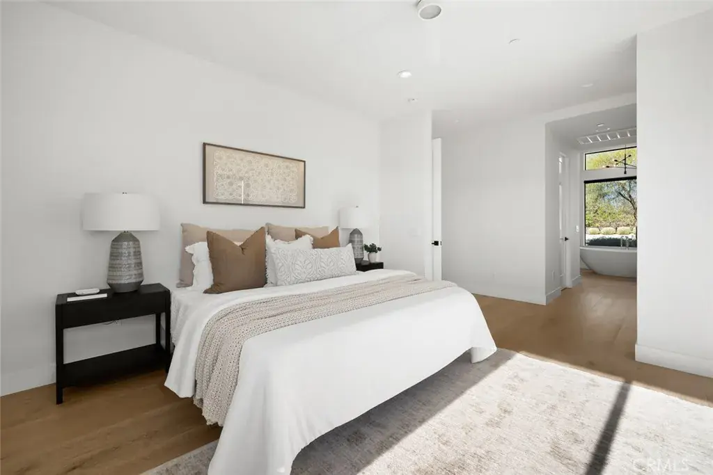 The main-level primary suite serves as a tranquil sanctuary with dual walk-in closets, a spa-inspired bath featuring a soaking tub and large walk-in shower, a two-way fireplace, and private patio access. Three additional ensuite bedrooms on the main level, one with own entrance from exterior, ensure comfort and privacy for family and friends alike.