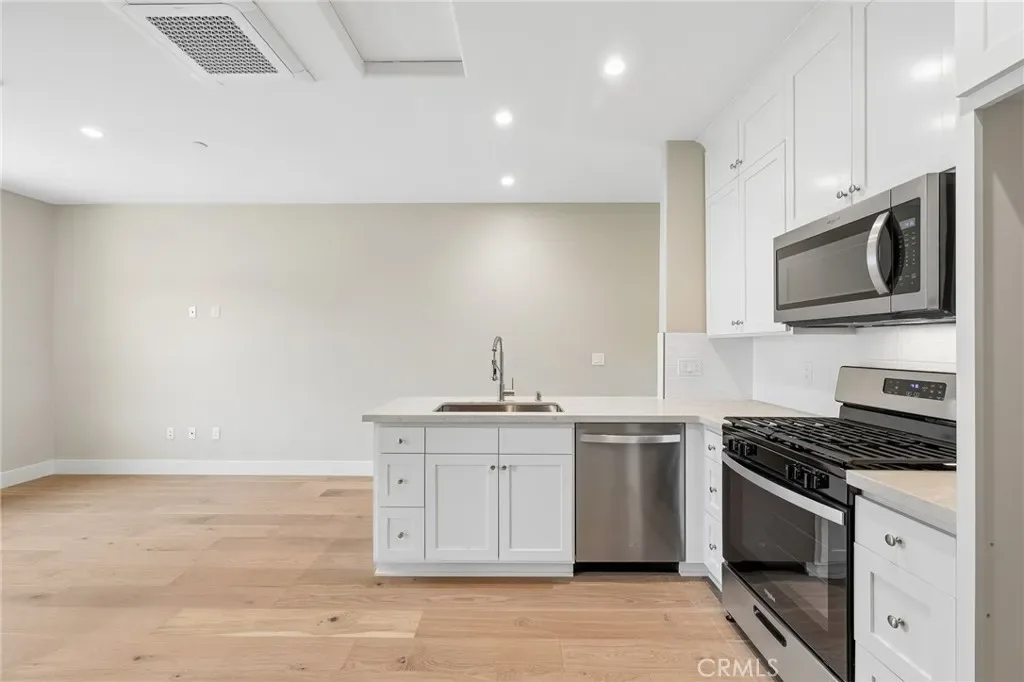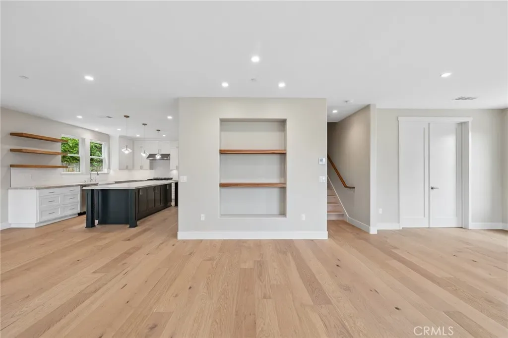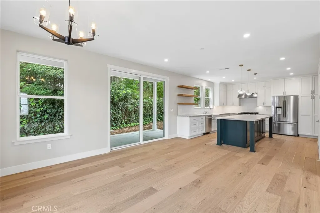 The open-concept floor plan showcases a chef’s kitchen with premium appliances, custom cabinetry, quartzite countertops, and an oversized center island, flowing seamlessly into the dining and living areas—ideal for entertaining.