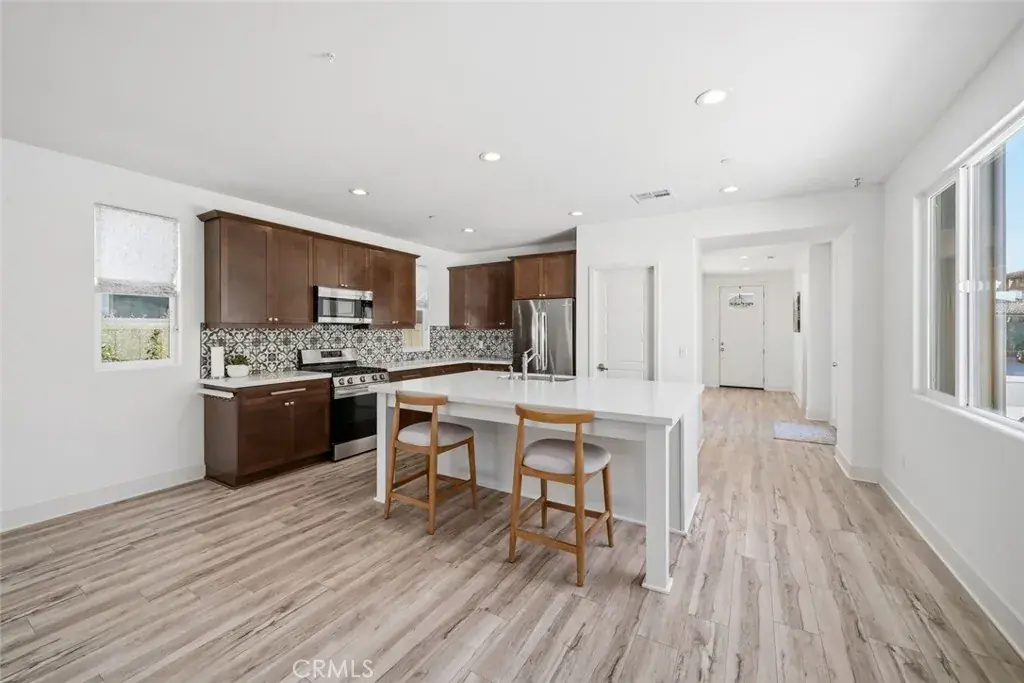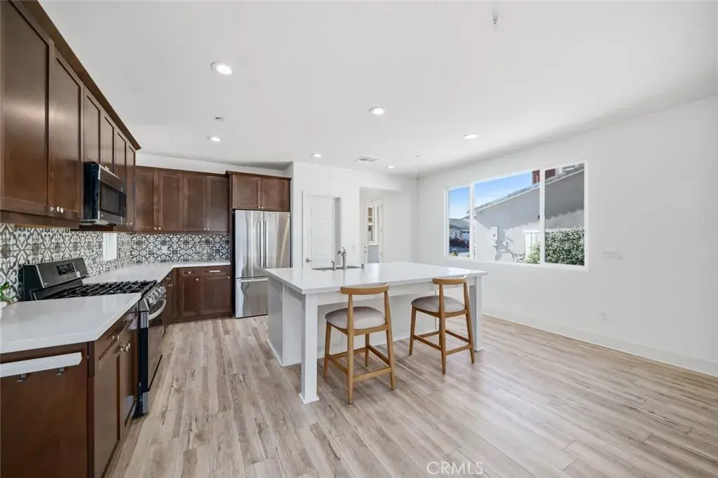 The gourmet kitchen boasts stainless steel appliances, including a dishwasher, gas range, microwave range hood combo, and refrigerator. A large kitchen island with sink and seating provides the perfect gathering space, complemented by a decorative backsplash, ample counter space, generous cabinetry, and a pantry for additional storage. Recessed lighting and designer fixtures enhance the home’s warm, inviting atmosphere.