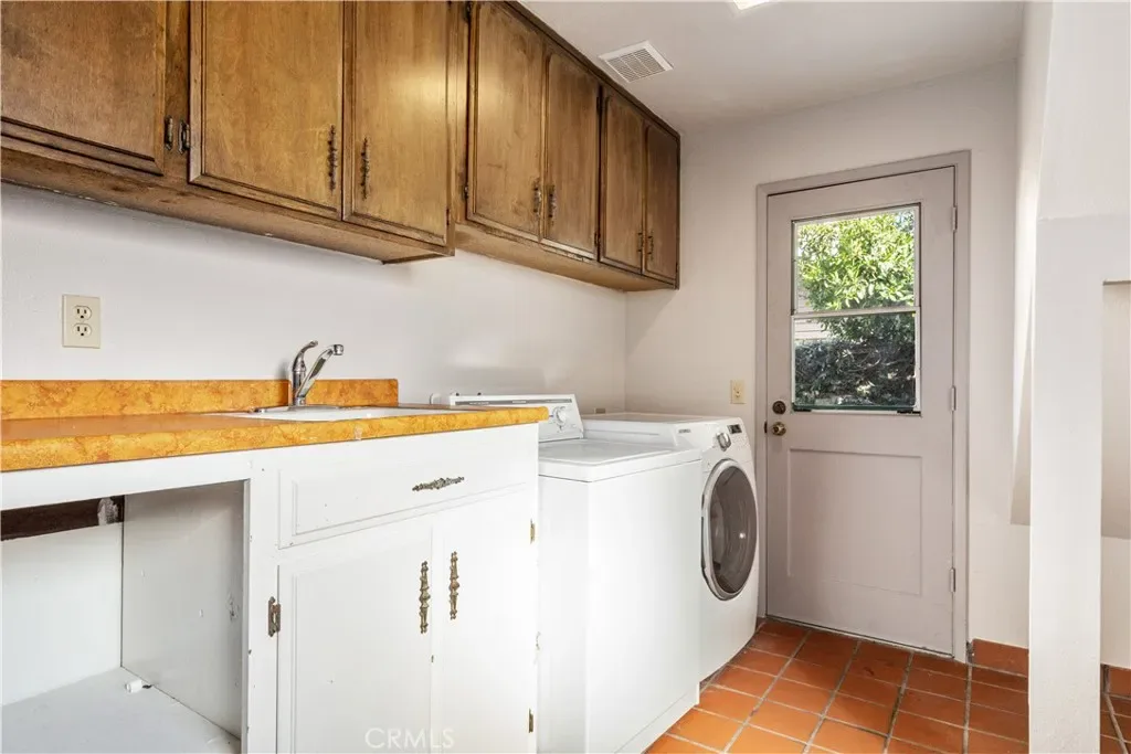 The interior is designed for comfort and ease. You’ll be greeted by a massive living area featuring extensive built-in cabinetry—ideal for a curated home library or extra storage—while the kitchen comes fully equipped with a dishwasher and refrigerator. For added practicality, a dedicated laundry room includes a deep soaking sink and washer/dryer hookups, ensuring your home chores remain private and stress-free.