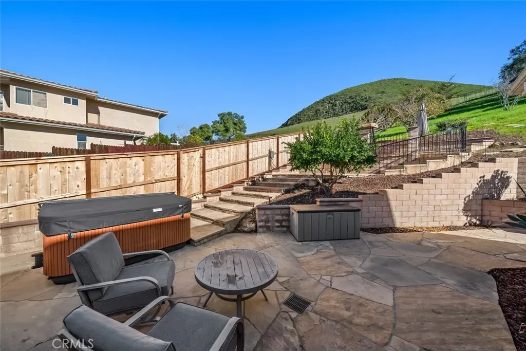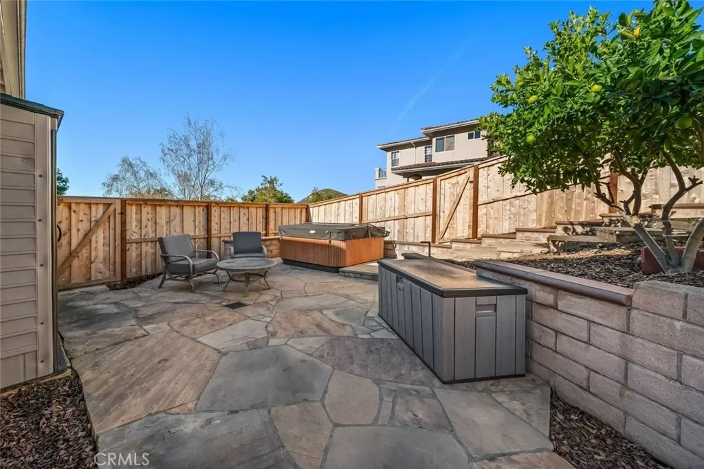 Additional highlights include an entry balcony with sweeping views of city lights, the surrounding neighborhood, and nearby hills, along with a flexible floor plan well suited to a variety of lifestyles. The home offers exceptional privacy, with no neighbors in front, behind, or to the north. The fully fenced backyard features a stone patio and terraced areas—ideal for relaxing evenings with family and friends—as well as mature apple, orange, lemon, lime, and avocado trees.