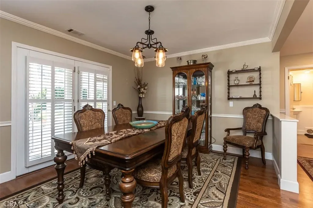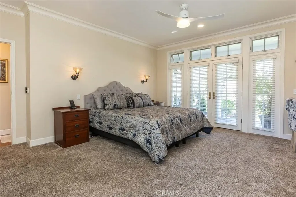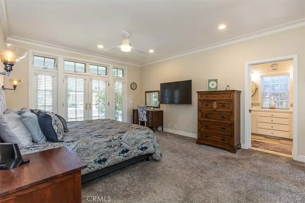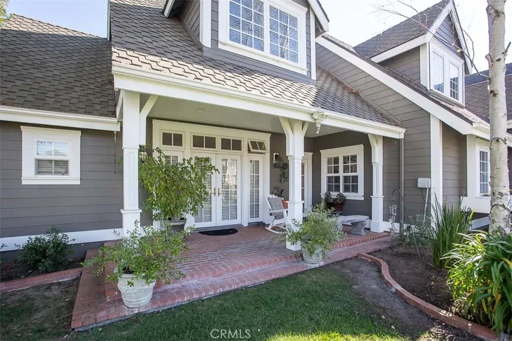 The thoughtfully designed downstairs primary wing provides exceptional flexibility, featuring an office, separate entry, and private front and back patios with French doors—perfect for single-level living, guest accommodations, in-law quarters, or a caretaker suite. At the heart of the home, a spacious and inviting family room boasts vaulted ceilings, a fireplace, built-in desk, and a casual dining area that flows seamlessly into the light and bright kitchen. Here, coffered ceilings, a marble backsplash, butcher block island, and walk-in pantry create a space that is as functional as it is beautiful.
