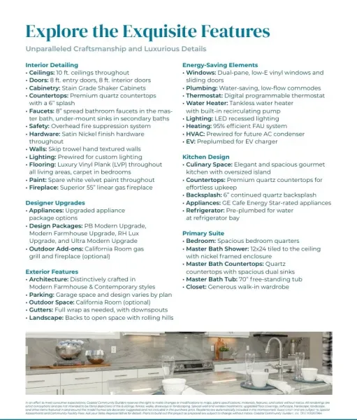 6741 Tierras Altas Lane is one of only eleven new homes remaining in the, Avila Canyon Estates, a gated cul-de-sac enclave embraced by the picturesque hills of the Avila Valley. This beautifully designed single-level luxury residence spans nearly 2500 square feet on a 15,295 square foot homesite, offering an exceptional blend of comfort, elegance, and privacy. Inside, ten-foot ceilings and expansive glass doors and windows, fill the home with natural light, creating a seamless connection between the interior and the outdoors. The home provides a true open floor plan design with the living, dining, and kitchen flowing together. The great room impresses with a twenty-foot glass wall with two sliding doors that open to the covered California Room. A six-foot linear gas fireplace in the living room anchors the great room adds a touch of modern elegance. The gourmet kitchen is a showcase of craftsmanship, featuring premium quartz countertops, soft-close shaker cabinetry, GE Café appliances, and a generous center island ideal for entertaining or everyday living. The primary suite has a spacious bedroom and serves as a peaceful retreat with access to the backyard. It includes a spa-like bathroom boasting a frameless glass shower, freestanding soaking tub, and spacious walk-in closet. Every detail throughout the home reflects thoughtful design and quality, from luxury vinyl plank flooring and recessed lighting to energy-efficient systems that enhance comfort and sustainability. Additional highlights include a secondary suite, an oversized laundry room, and a three-car garage pre-plumbed for an EV charger and equipped with owned solar. Buyers can upgrade and make selections for their new home to design it to their liking. The expansive yard invites possibilities for future outdoor enhancements such as enlarged personalized living spaces, entertainment areas, and gardens. Nestled at the end of the cul-de-sac, the property’s elevated setting captures tranquil hillside views and a sense of seclusion. Residents also enjoy the private community fitness loop. This community is perfectly situated near the Bob Jones Trailhead, Avila Village, Avila Bay Athletic Club, Sycamore Mineral Springs, the charming Secret Garden Café, and downtown Avila Beach. Avila Canyon Estates provides a peaceful retreat, just minutes from Shell Beach and downtown San Luis Obispo, embracing the very best of Central Coast living within a true microclimate.