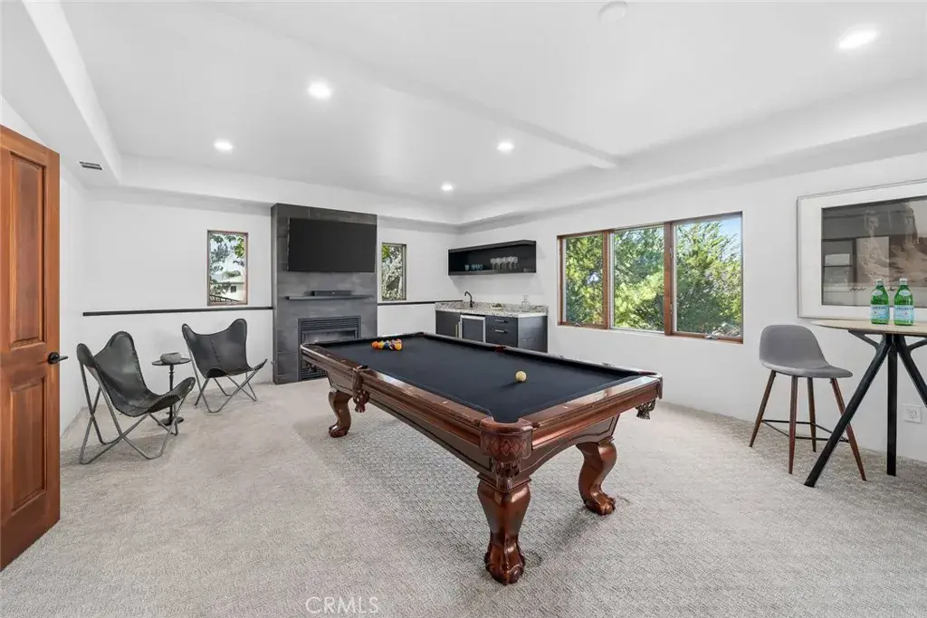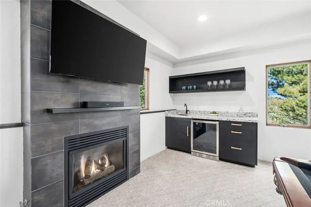 The main level features Italian tile flooring, wool carpet, and curated designer finishes throughout. The updated kitchen showcases a large island with a 5-burner cooktop, quartzite countertops, walk-in pantry, and a built-in Miele coffee machine. The kitchen opens to a deck with a firepit and unobstructed golf course views—ideal for entertaining or unwinding. This level also includes an open-concept living and dining area, a 240-bottle temperature-controlled wine room, laundry, and two well-appointed bedrooms with 1.5 baths. Upstairs is a private primary suite that feels like a luxurious retreat. The spa-inspired bathroom features a soaking tub with quartzite surround and mountain views, a steam shower, floating dual designer vanity, and a TV in the lighted mirror. Enjoy the downstairs game room with a fireplace and beverage refrigerator. The game room opens to the backyard designed for entertainment with a built in BBQ area, covered heated sitting area and a second fountain and the golf course view!