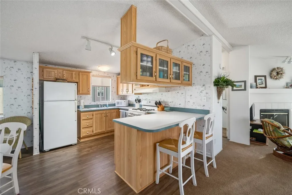 Dreaming of a coastal lifestyle where nature and comfort merge effortlessly? This fully furnished, single-story 2-bedroom, 2-bath manufactured home in the 55+ community of Pine View Mobile Home Park delivers, whether staying year-round or as a seasonal retreat! Inside, vaulted ceilings and sunlight from wide windows create an open, inviting feel, with thick carpet underfoot and a corner fireplace in the living room for casual evenings. The eat-in kitchen features warm, wood-toned cabinetry, a breakfast bar, and modern appliances, making entertaining easy.