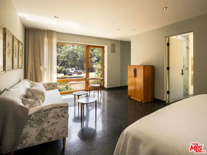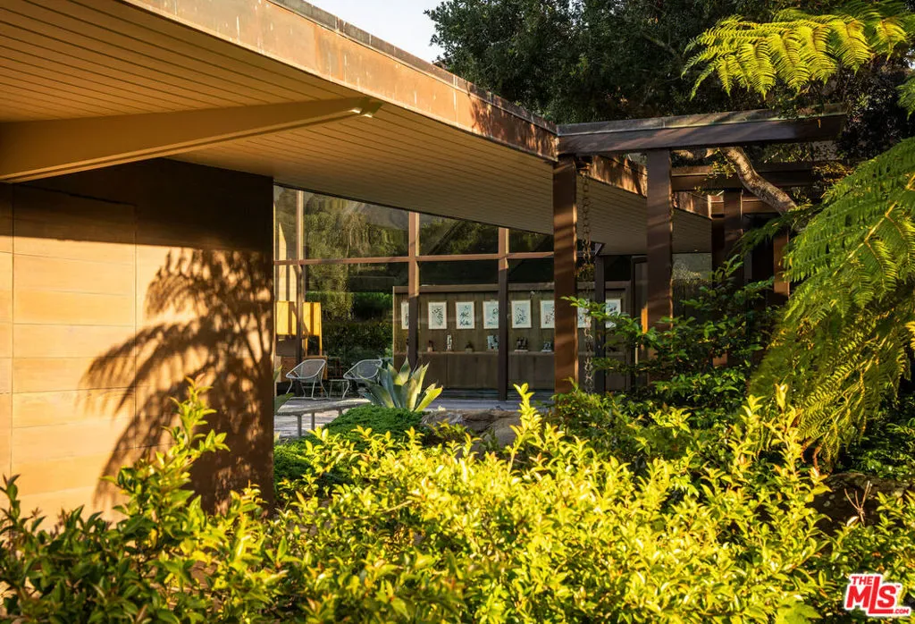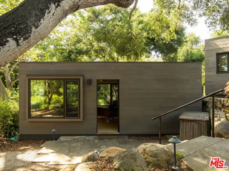 A rare midcentury modern architectural offering in the heart of Montecito, The Erving House, described as a “glass tent” by Time magazine in 1951,is a singular expression of architectural and landscape mastery, gracefully nestled on 2.7 acres of private, artfully curated grounds. Designed in 1950 by renowned architect Lutah Maria Riggs during her iconic modernist phase, and complemented by the legendary California landscape architect Thomas Church, this estate exemplifies the essence of indoor-outdoor living.Enter through private gates, where a meandering driveway weaves beneath a canopy of majestic oaks, setting a serene, cinematic approach to the residence. It culminates in a spacious motor court, where the home’s striking flat-roof carport seamlessly marries form and function with timeless elegance.A covered walkway leads to the home’s entrance, where a dramatic double-height foyer with floor-to-ceiling glass walls flood the space with natural light and frame expansive views of the surrounding landscape and mountains. This breathtaking entrance sets the tone for a home in constant dialogue with nature.The main living space unfolds with a soaring pitched ceiling, its apex seemingly reaching toward Montecito Peak, and a sculptural, biomorphic Santa Barbara stone fireplace, a subtle homage to Brazilian architect Oscar Niemeyer, Riggs’ contemporary and collaborator. Walls of glass, both fixed and sliding, span the length of the room, opening to terraces and gardens and dissolving the boundaries between inside and out.The primary suite is a private retreat, featuring a spa-like bath, dual large dressing rooms, and tranquil views of the gardens and the coastal range. The home office offers inspiring solitude, framed by vistas of mature landscape and mountain ridgelines.The European-style kitchen is outfitted with custom Poggenpohl cabinetry and top-tier appliances, crafted with the serious chef in mind. The adjoining formal dining area also enjoys views of both the northern mountains and the home’s terraced gardens and native flora beyond.Adjacent to the main house is a detached studio, providing flexible use, as a guest bedroom, creative workspace, or private retreat, its large windows revealing the natural beauty of mature oaks. Across the property is a serene 1-bedroom, 1-bath creekside guest house offering peaceful accommodations far enough from the main home to feel entirely its own.The grounds, once altered by previous owners,have been thoughtfully revived by landscape architect Susan Van Atta, who honored much of Church’s original vision while adding her own artistry through native plantings. Wander through fruit orchards, lavender fields, and raised vegetable gardens, or enjoy a game at the bocce ball court, each element curated for both beauty, sustainability, and enjoyment.The Erving House is more than a residence, it is a living piece of architectural history and one of Montecito’s most important homes. It offers unparalleled privacy, serenity, and a lifestyle that celebrates the seamless interplay between nature and design. Additional features include a high- functioning well with RO system for landscaping and a full power backup generator.