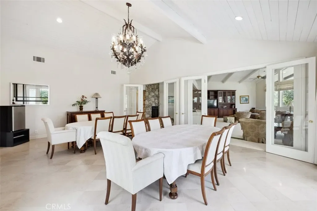 Designed for grand yet comfortable living, the 4,170± sq.ft. residence features soaring vaulted ceilings with exposed beams, walls of glass, and multiple fireplaces that create a warm, inviting atmosphere filled with natural light. The open-concept great room and family room flow seamlessly into spacious dining areas—ideal for entertaining. The galley kitchen with an adjoining breakfast nook provides ample workspace and could easily be reimagined into a chef’s dream kitchen.