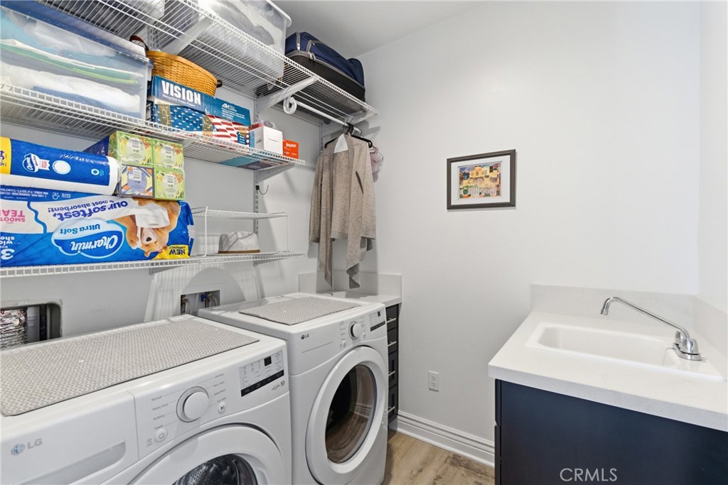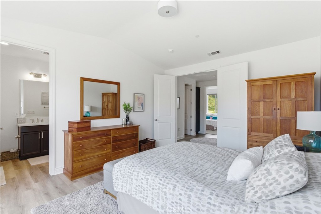 A downstairs bedroom with an en suite bath provides flexibility for single level living, guests or multi-generational living. Upstairs, a loft offers space for an office, media room, or play area, along with a laundry room. The primary suite features dual sinks, a large shower, and a walk-in closet. Two additional bedrooms and a full bathroom complete the upper level. Additional features are tankless water heater and custom Hunter Douglas window treatments throughout.