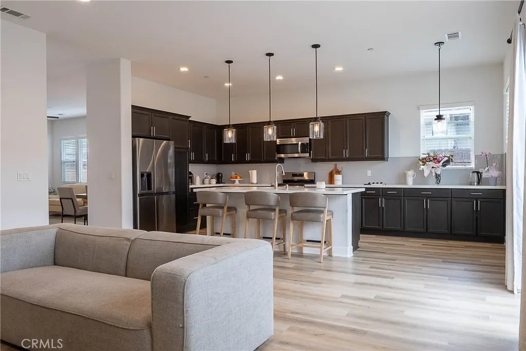 Step inside to vaulted ceilings and an abundance of natural light that immediately make the space feel bright, open, and inviting. At the center of the home, a beautifully appointed kitchen features quartz countertops, a designer backsplash, and modern finishes, all flowing seamlessly into the living and dining areas–perfect for both everyday living and entertaining.