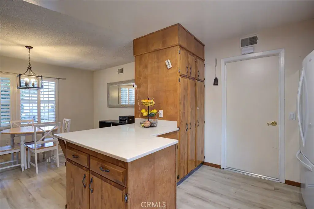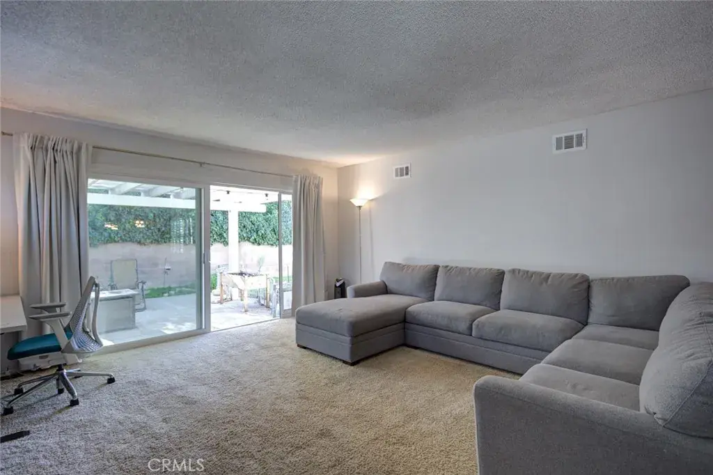 The kitchen features Corian countertops, updated appliances, and generous cabinetry, opening to a bright living area highlighted by a cozy fireplace. Large sliding doors lead to a private, spacious backyard with patio space—perfect for entertaining, relaxing, or enjoying your own apple tree.