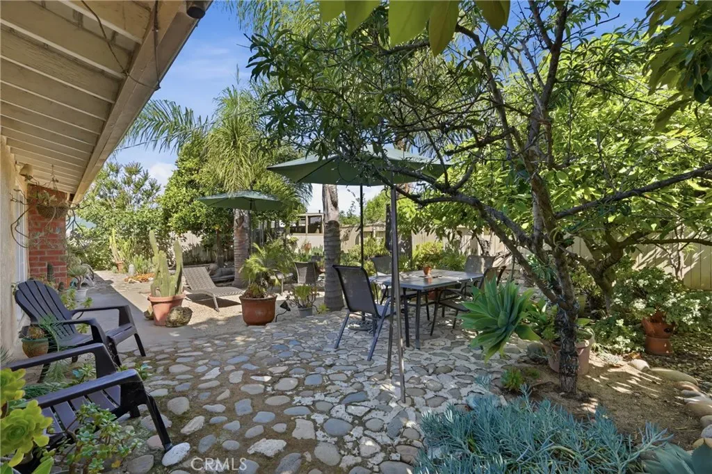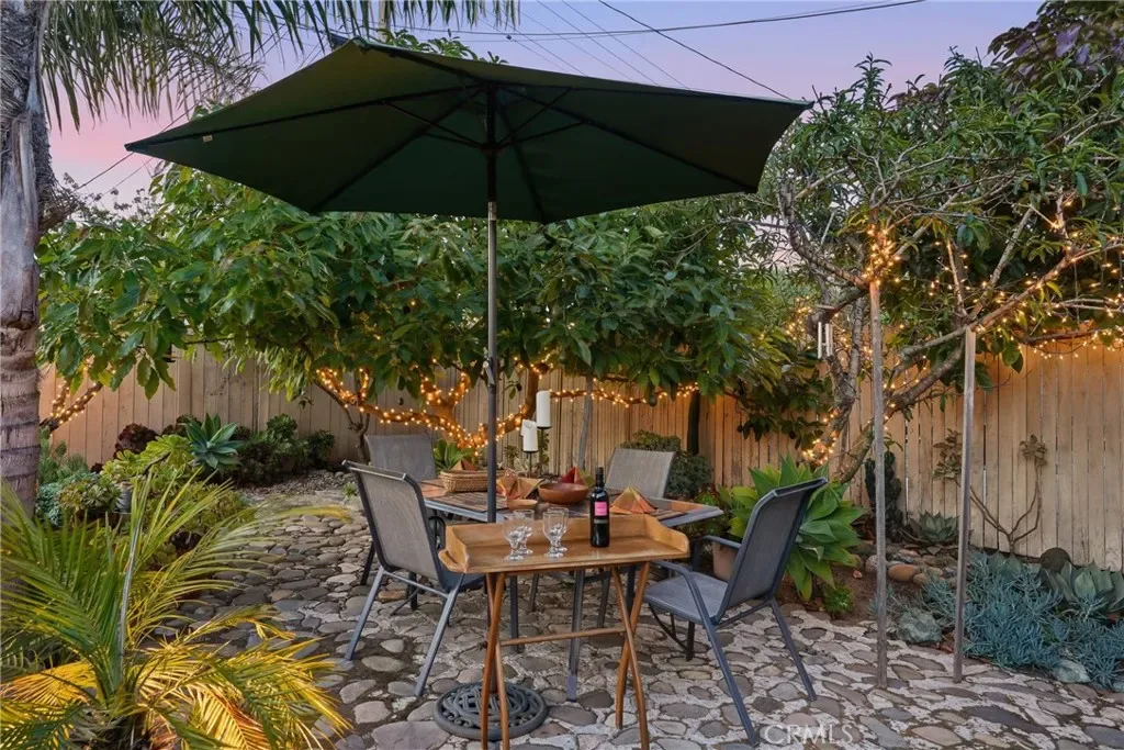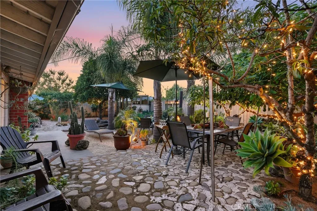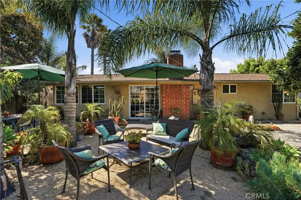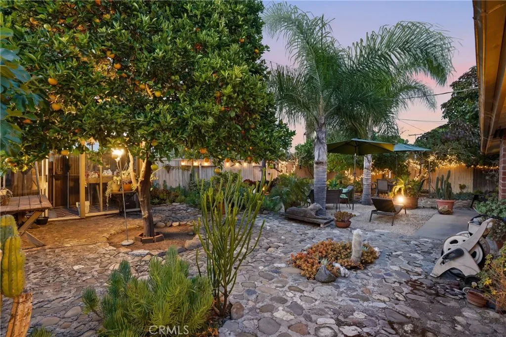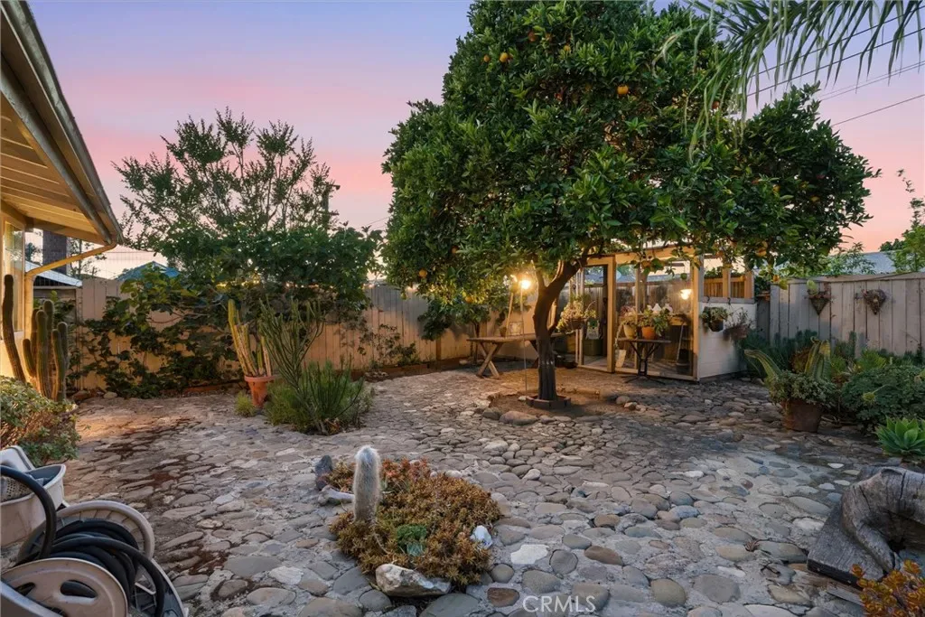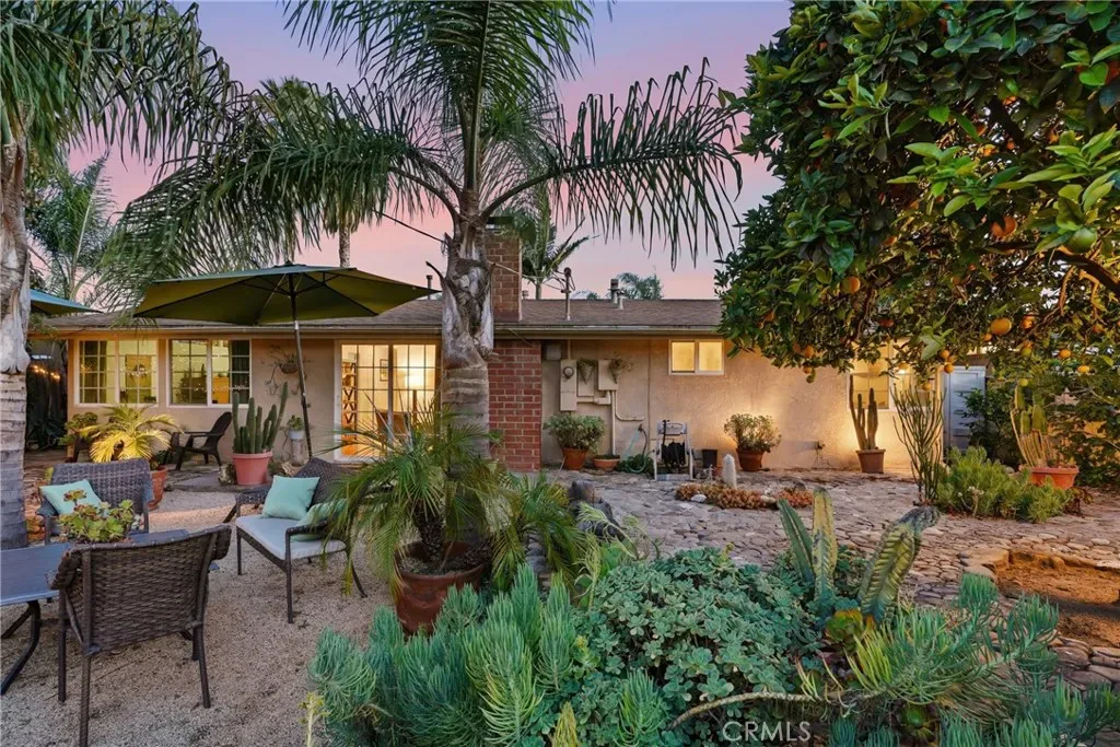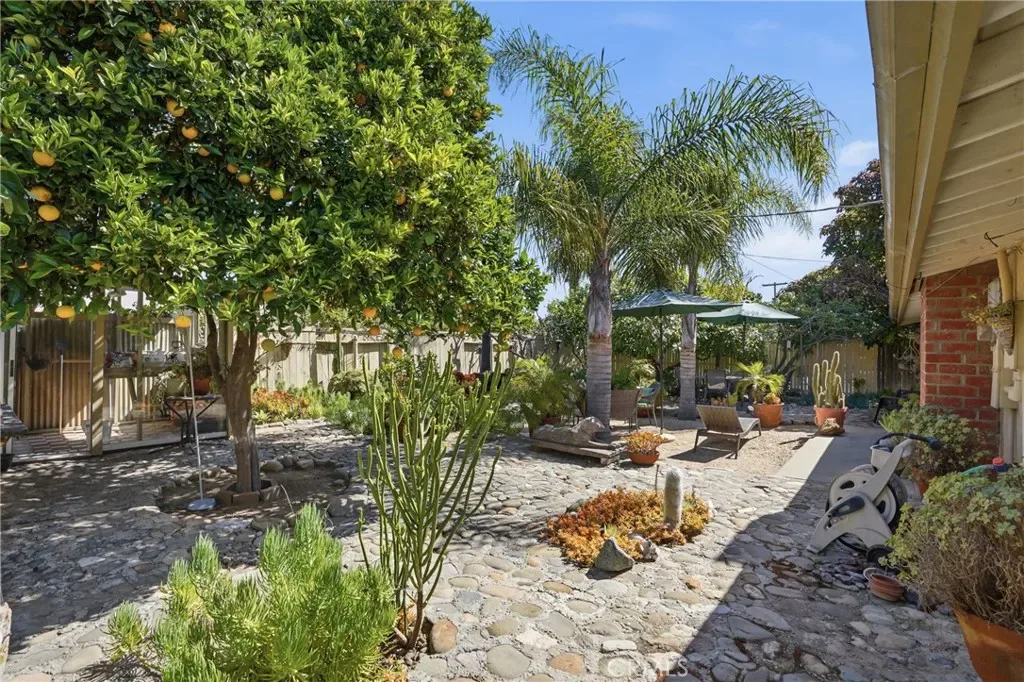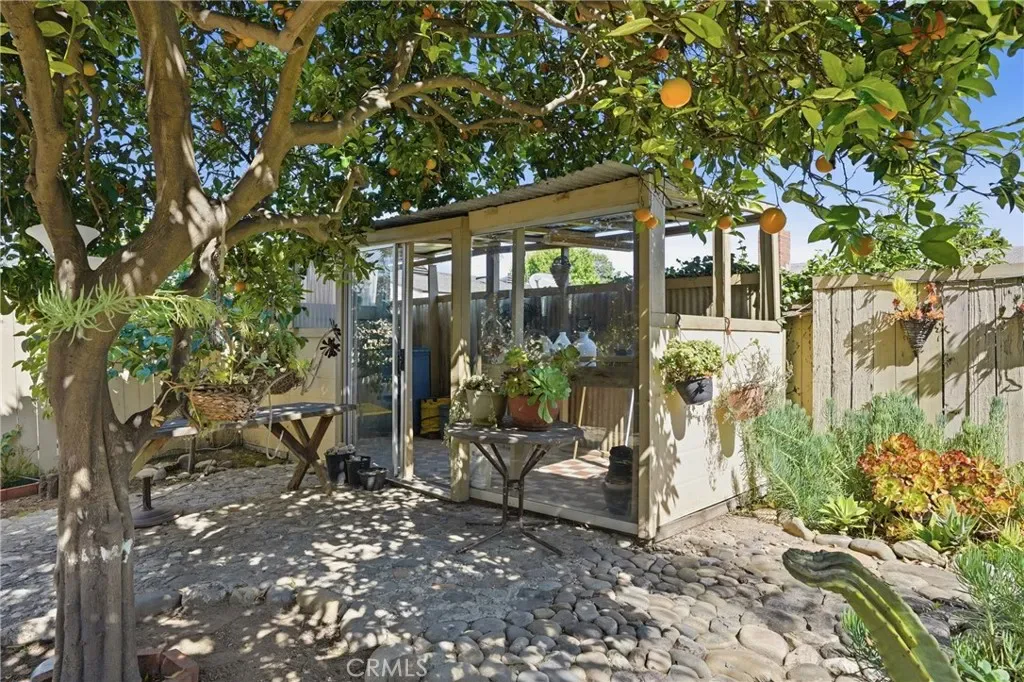 The sunny dining area continues the home’s seamless connection to the outdoors, while the backyard offers a peaceful retreat with mature fruit trees, including a vibrant orange tree, avocado, peach, fig, to name a few, and a charming potting shed perfect for gardening or creative use.
