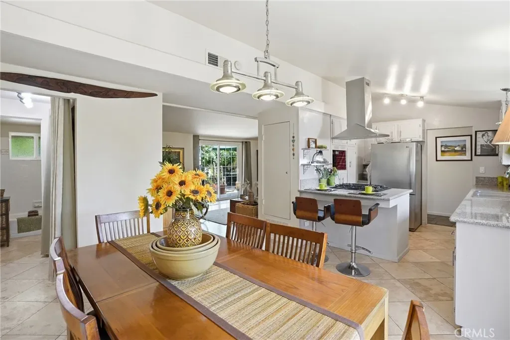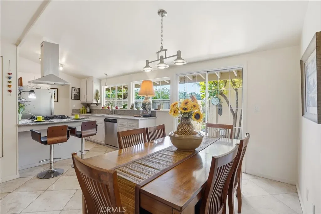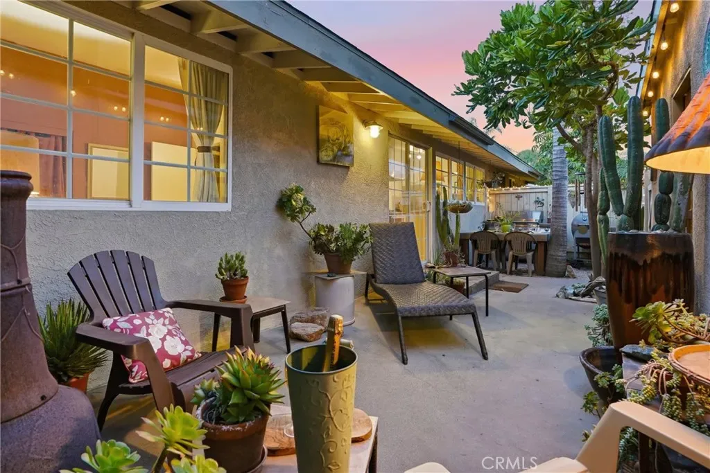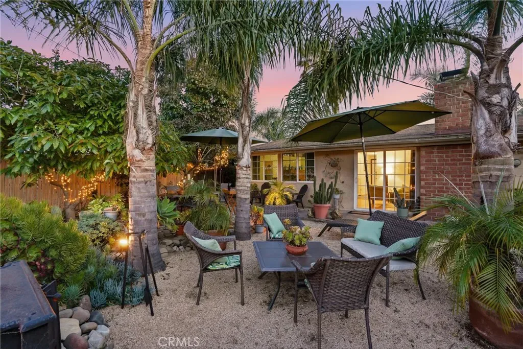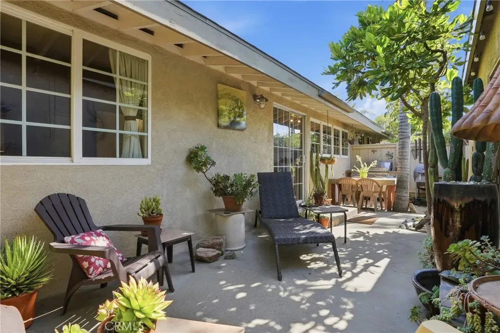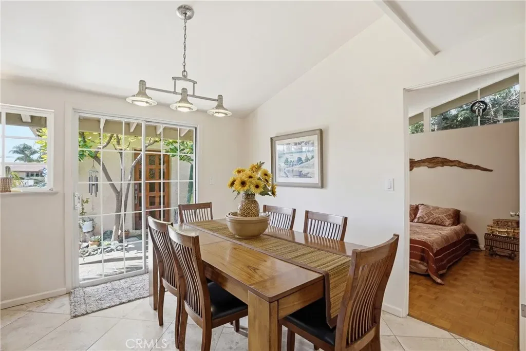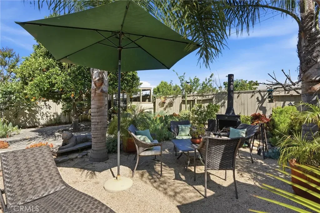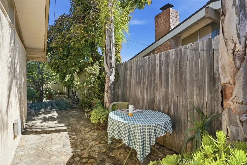 The sunny dining area continues the home’s seamless connection to the outdoors, while the backyard offers a peaceful retreat with mature fruit trees, including a vibrant orange tree, avocado, peach, fig, to name a few, and a charming potting shed perfect for gardening or creative use.