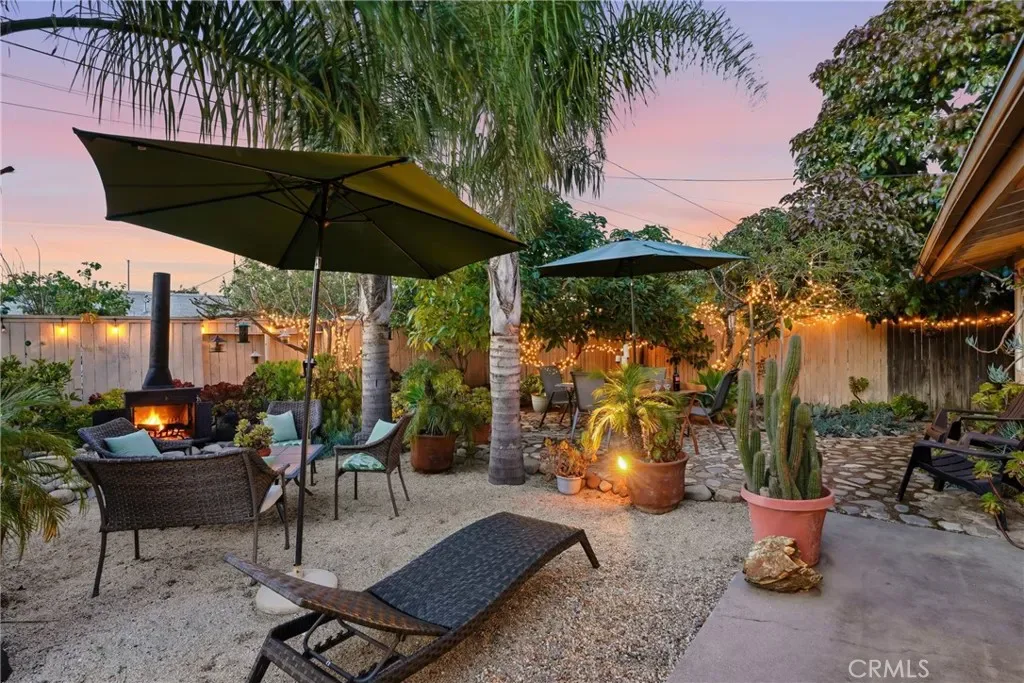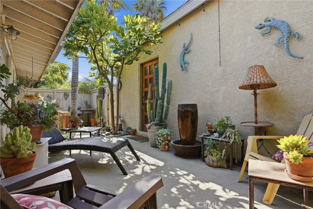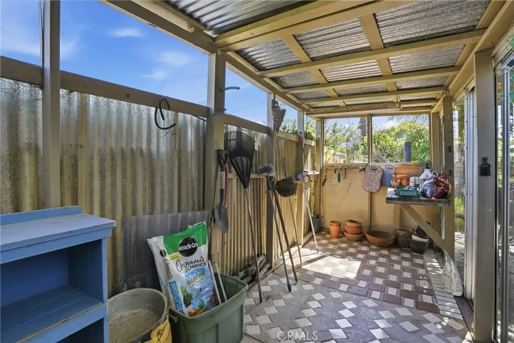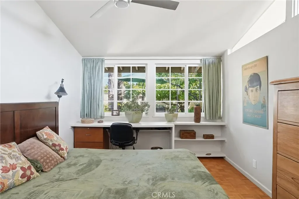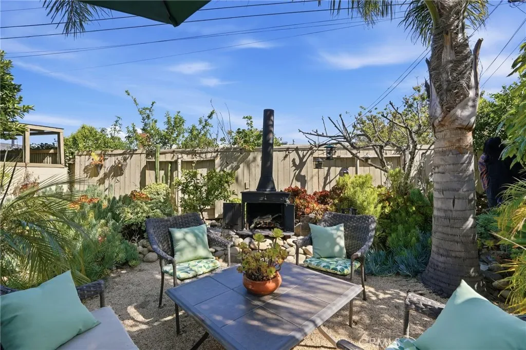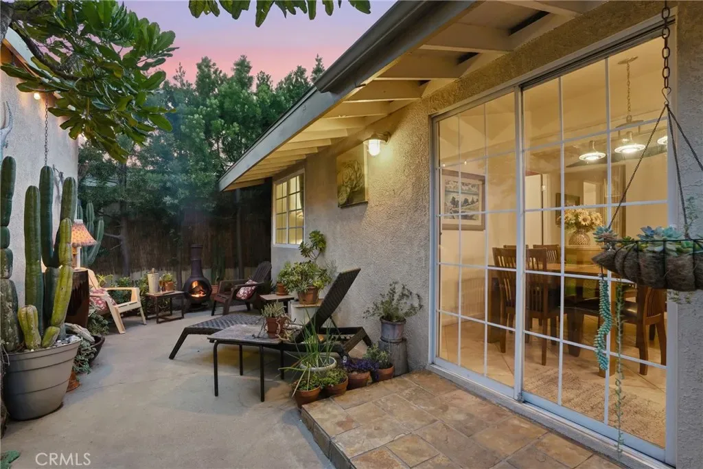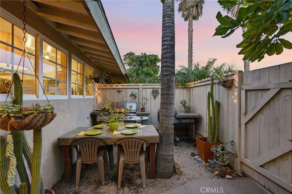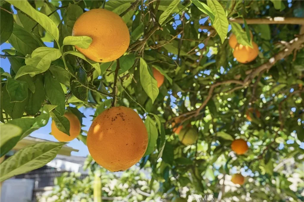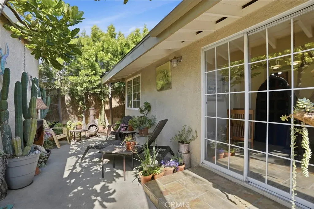The sunny dining area continues the home’s seamless connection to the outdoors, while the backyard offers a peaceful retreat with mature fruit trees, including a vibrant orange tree, avocado, peach, fig, to name a few, and a charming potting shed perfect for gardening or creative use.
