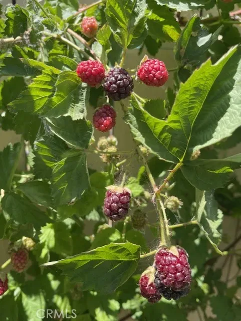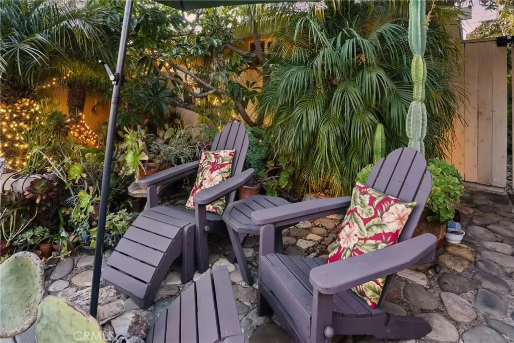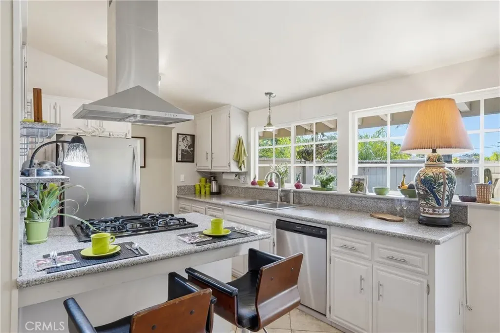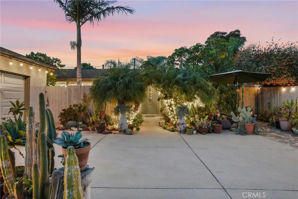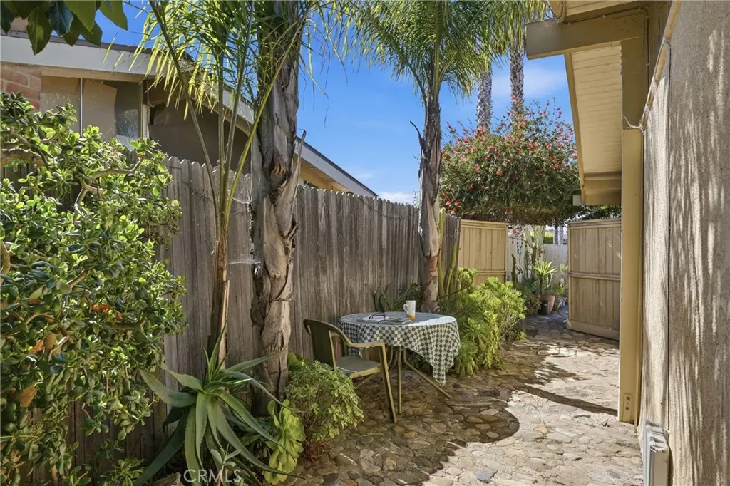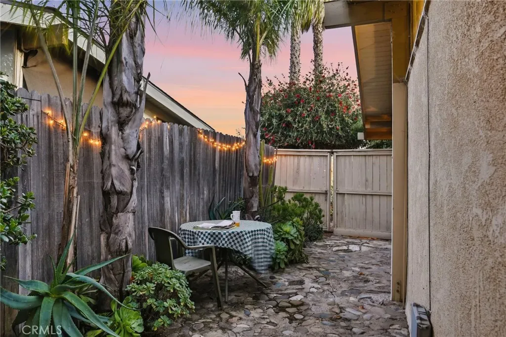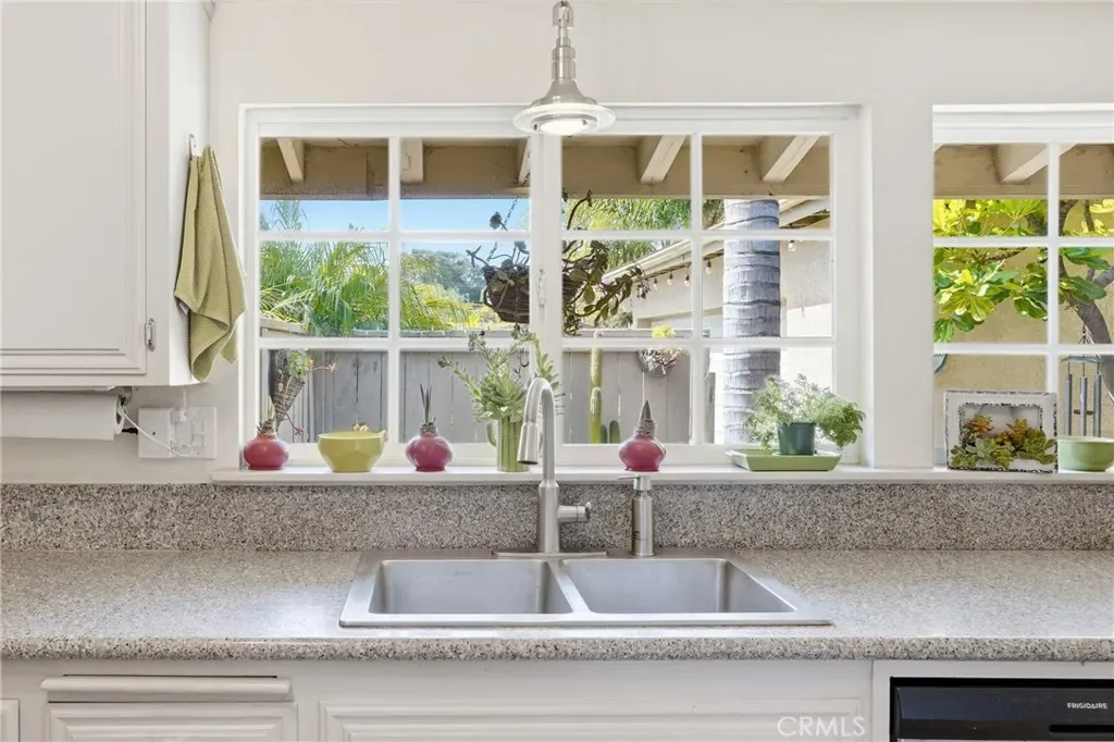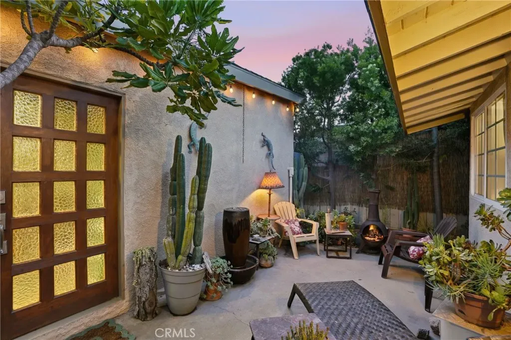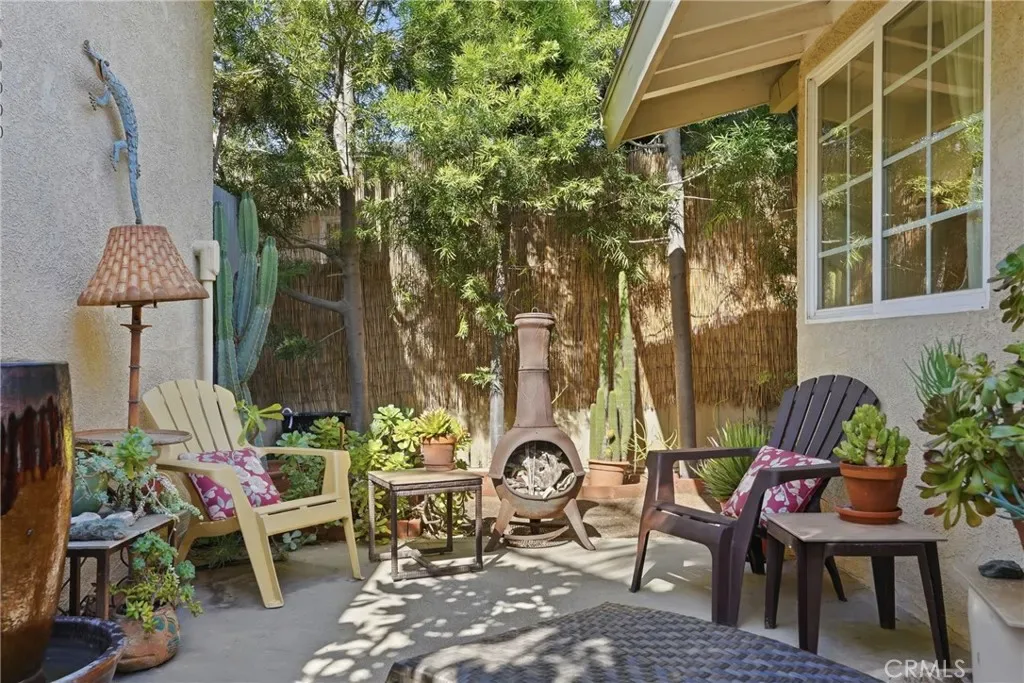 The sunny dining area continues the home’s seamless connection to the outdoors, while the backyard offers a peaceful retreat with mature fruit trees, including a vibrant orange tree, avocado, peach, fig, to name a few, and a charming potting shed perfect for gardening or creative use.