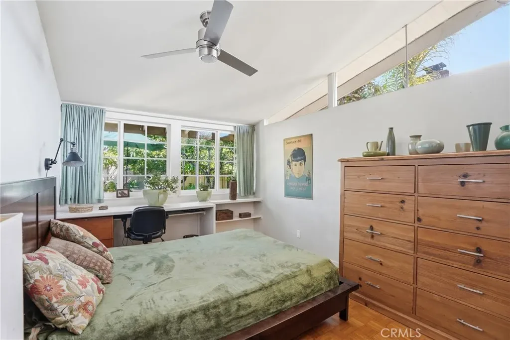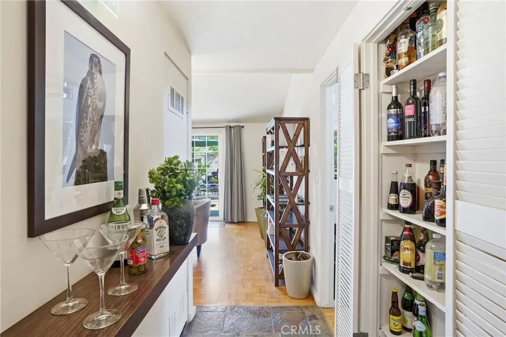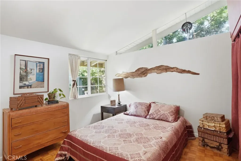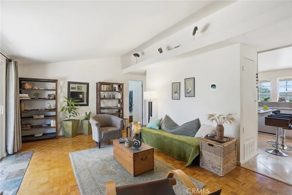 The bright kitchen blends style and function with granite countertops, while travertine flooring adds texture and character through the kitchen, dining area, hallway, and one bathroom. Parquet flooring flows through the main living areas and bedrooms, bringing warmth and timeless midcentury appeal.