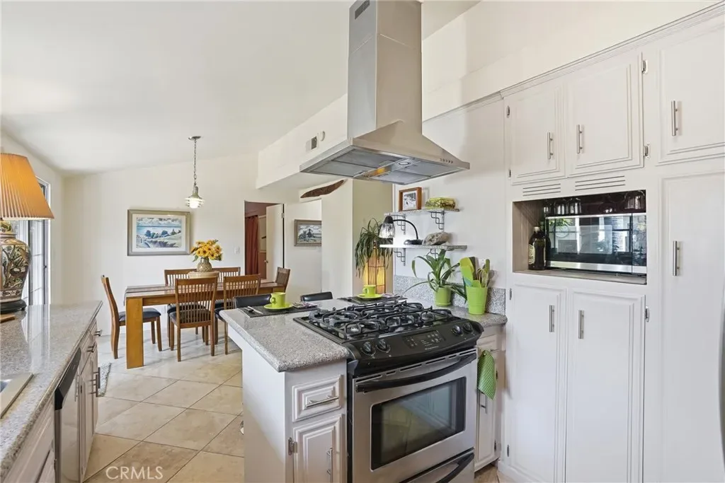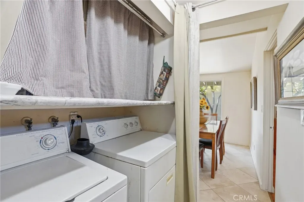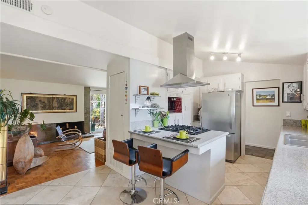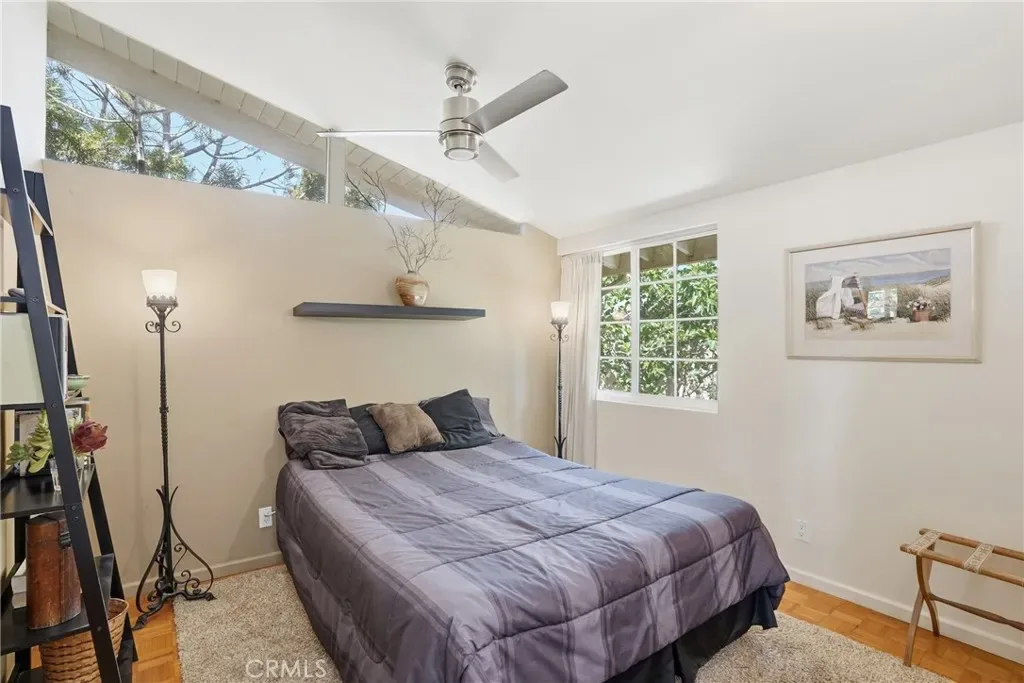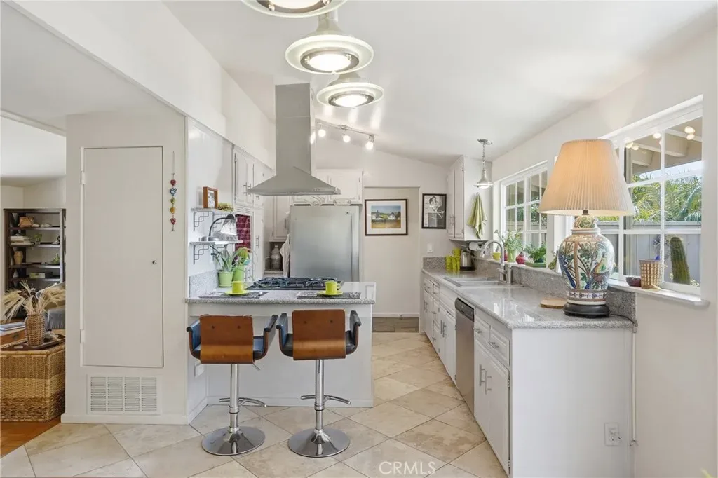 The bright kitchen blends style and function with granite countertops, while travertine flooring adds texture and character through the kitchen, dining area, hallway, and one bathroom. Parquet flooring flows through the main living areas and bedrooms, bringing warmth and timeless midcentury appeal.