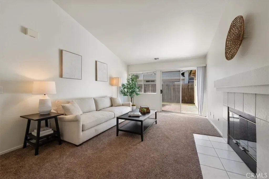 The interior is centered around an expansive great room, highlighted by high-sloping ceilings and an abundance of natural light from oversized windows. A fireplace with a tile hearth and classic white mantel serves as a warm focal point, while wide sliding glass doors provide seamless access to the rear grounds, enhancing indoor-outdoor living. Large-format tile flooring transitions into plush carpeting in the main seating area, creating a subtle yet functional separation of space.