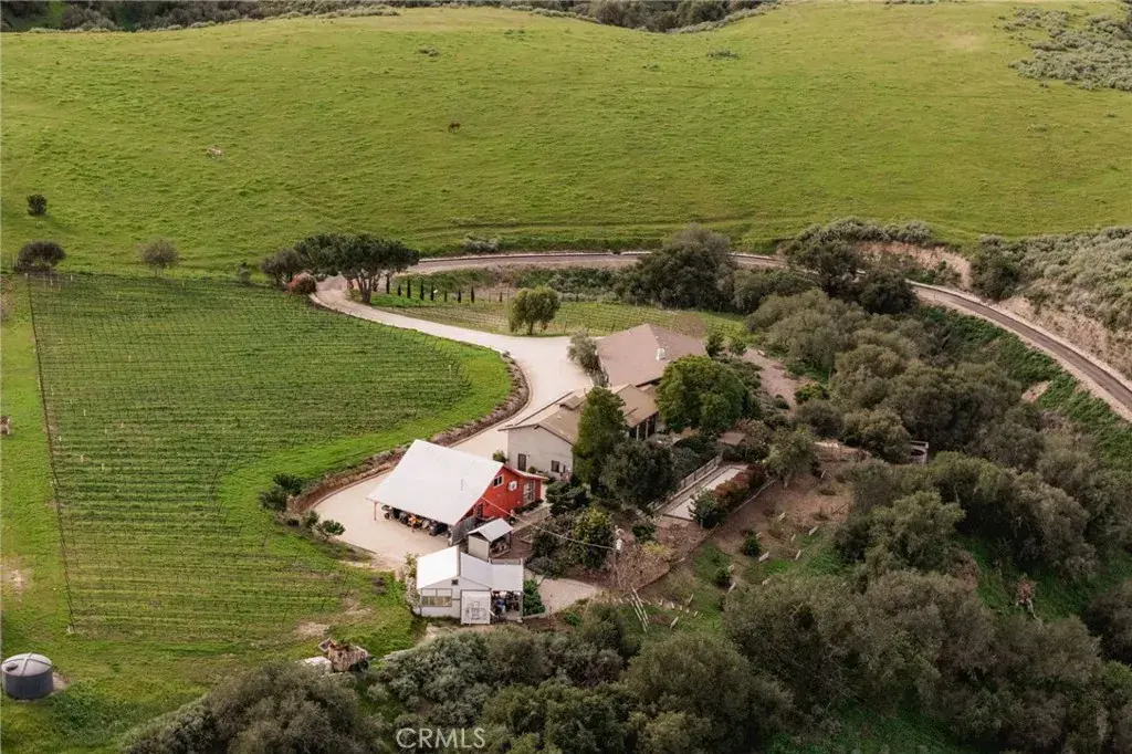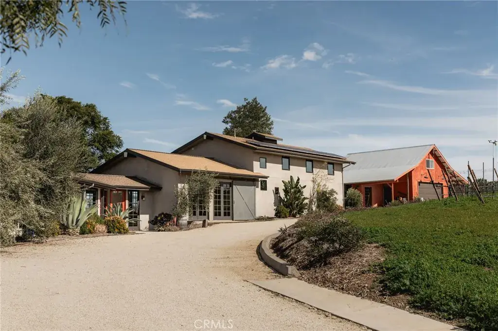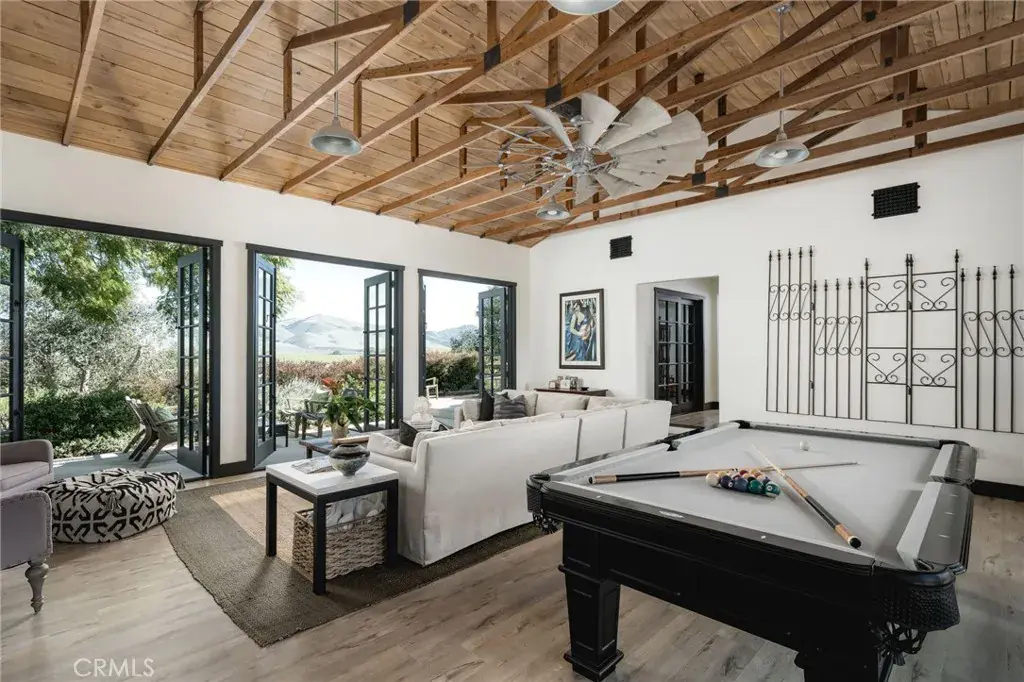 There are rare moments when a home becomes not only a place to live, but a private destination. Set along the scenic Foxen Canyon corridor between Santa Barbara County and San Luis Obispo County wine country, this Central Coast estate evokes the elegance of Napa-style living and the charm of an Italian-inspired European retreat. Spanning approximately 7.5 acres, the property centers around a thoughtfully reimagined 4,476± square foot main residence designed for gathering, retreat, and multi-generational living. Two distinct wings allow for both connection and privacy, while wood-lined ceilings, exposed beams, French doors, and dual wood-burning fireplaces create a sense of relaxed European warmth. Indoor-outdoor living is effortless, with a cedar plunge pool overlooks canyon views, expansive entertaining areas, a bocce court, and nearly fifty fruit trees nestled in the landscape. An enclosed green house adds additional charm.