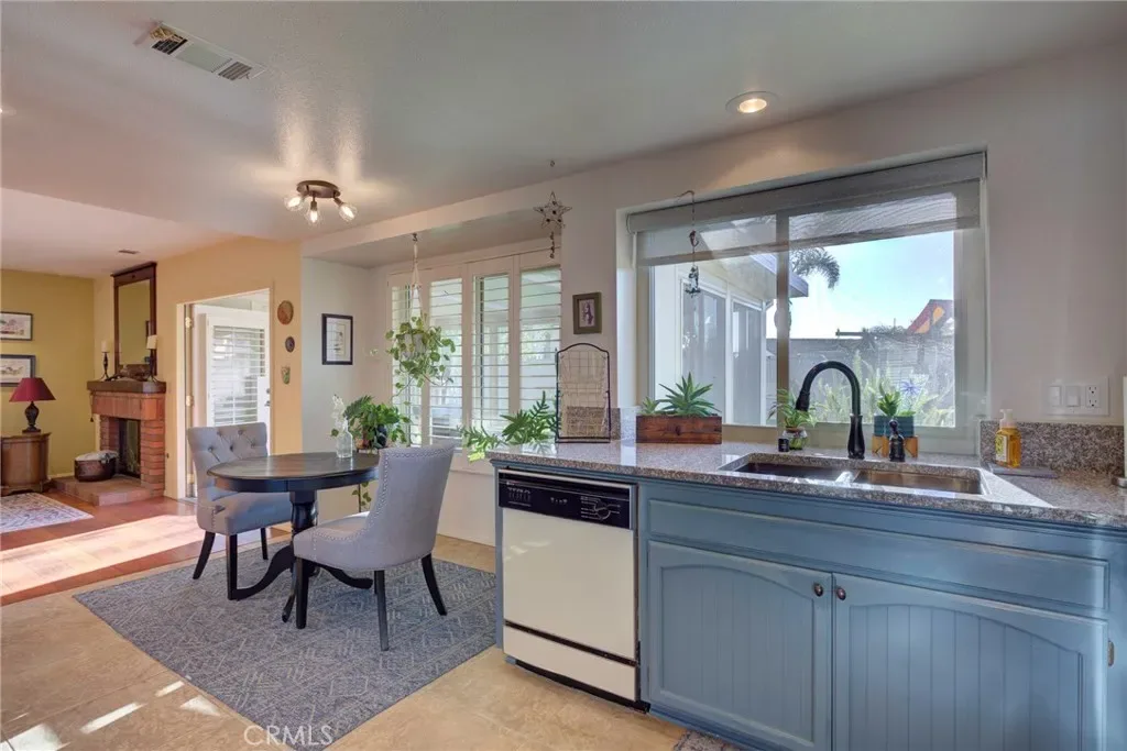 The dining area is beautifully framed by a picture window and palladium window above, complemented by classic plantation shutters. The gourmet kitchen features stone countertops, a Frigidaire five-burner gas stove, built-in microwave, dishwasher, pantry, pull-out drawers, and a sunny breakfast nook. Just off the kitchen, the cozy family room with fireplace is perfect for relaxing evenings.