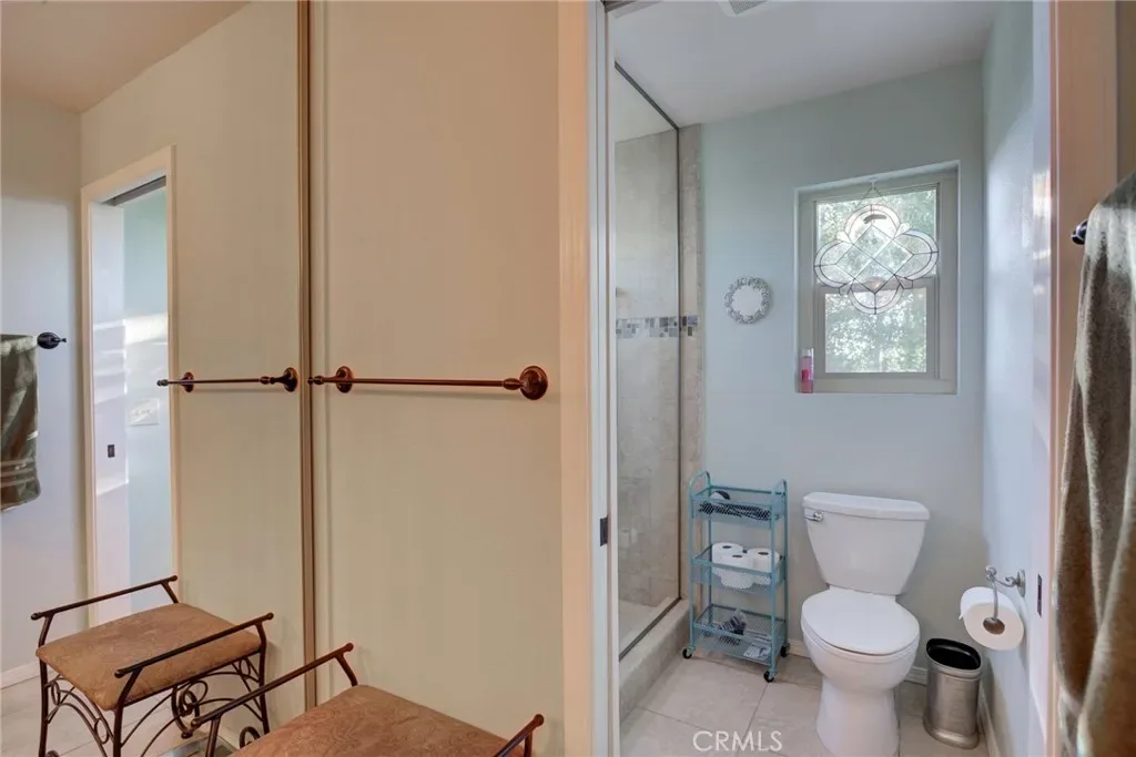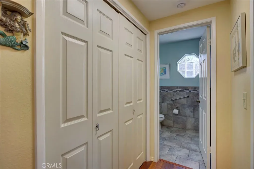A downstairs bedroom with built-in cabinetry and a nearby ¾ bath offers flexibility for guests or multi-generational living, along with a convenient laundry closet.