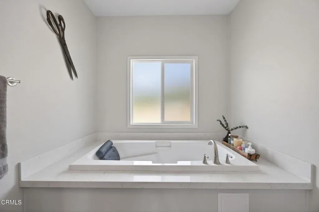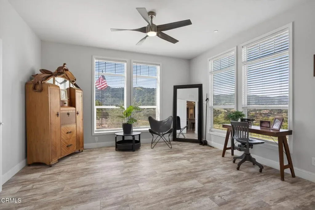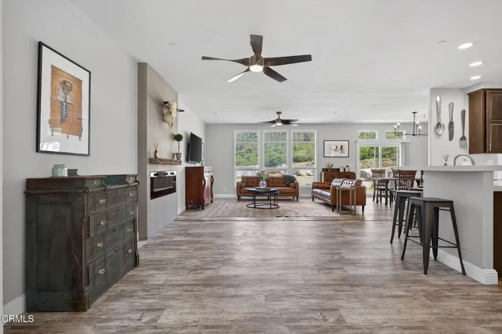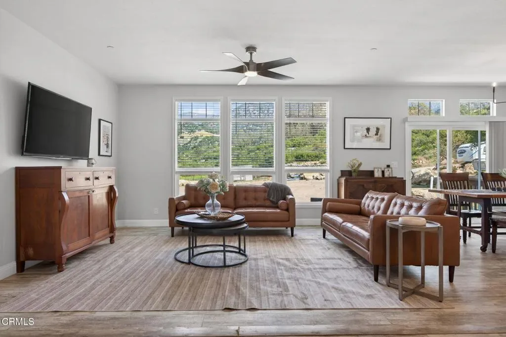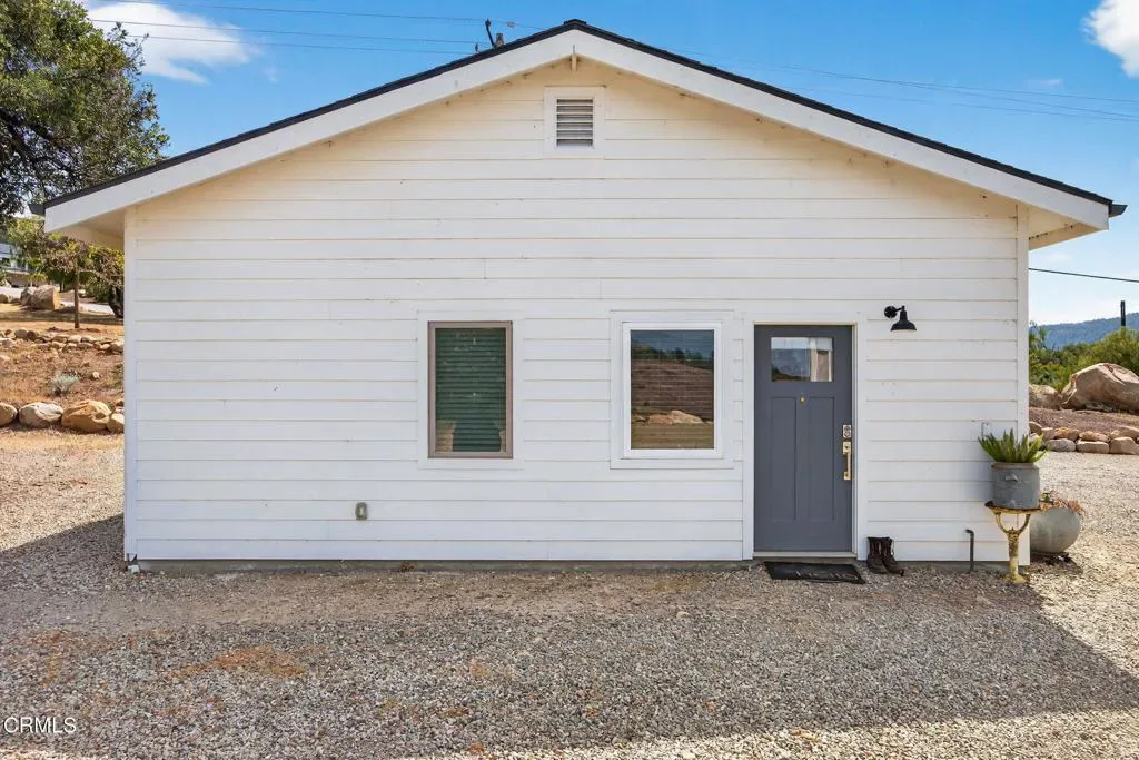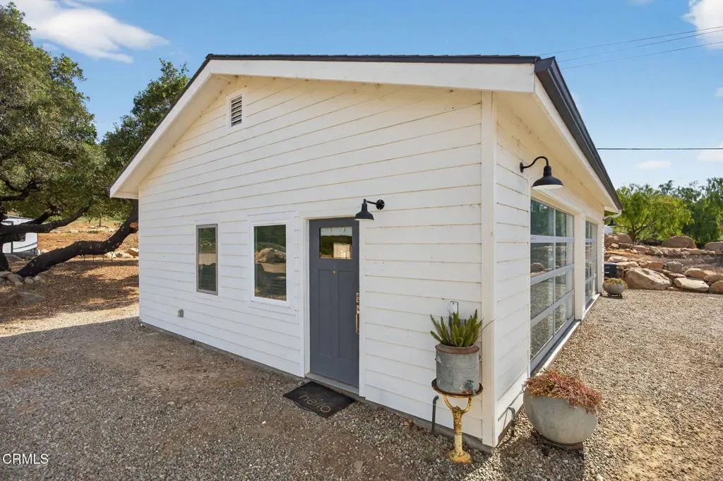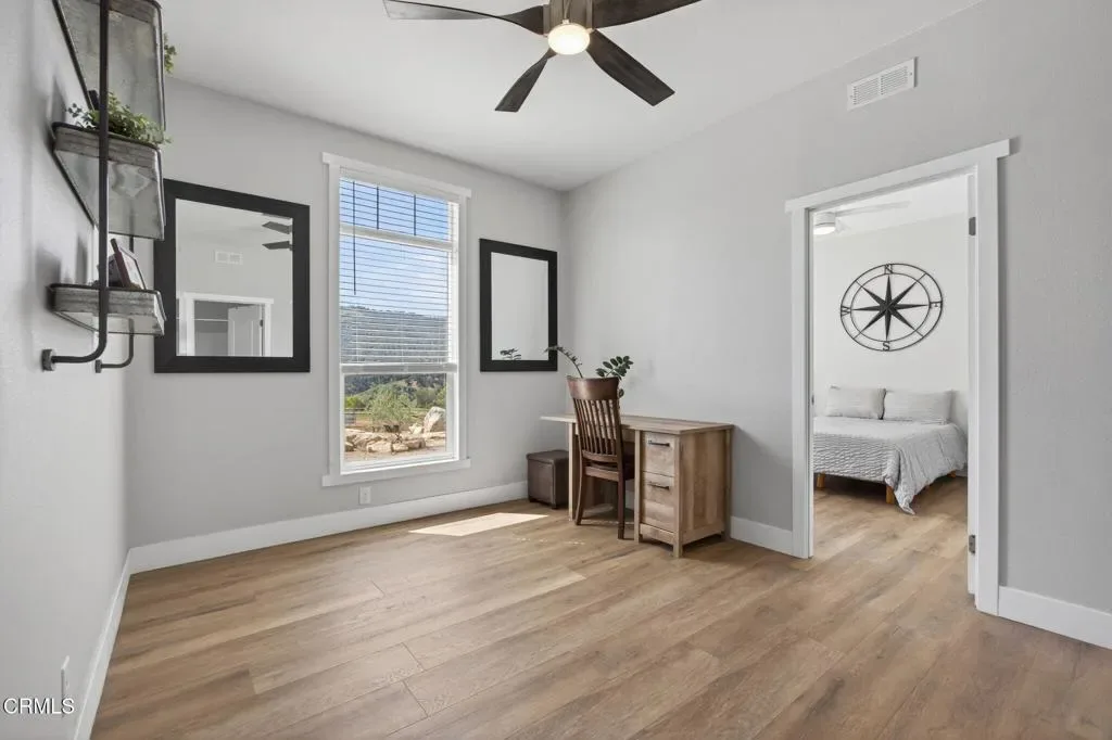 Dreaming of your own private retreat in the Ojai Valley? This exceptional approximately 20-acre property offers a rare opportunity to create your ideal ranch lifestyle amid breathtaking natural beauty. Showcasing panoramic views of the Upper Ojai Valley and Topa Topa Mountains, the setting is both peaceful and inspiring, perfect for those seeking space, privacy, and endless potential. Conveniently located just off Highway 150, the property provides easy access to the charming towns of Ojai and Santa Paula, known for their great restaurants and small town appeal, while still offering a serene, country living experience under star-filled skies. The land features a blend of usable flat areas and scenic terrain and possibilities of horses, orchards and gardens. A beautifully designed home offering over 2,300 sq ft of living space, showcasing a modern farmhouse style throughout. The interior features custom cabinetry, premium countertops, and a spacious kitchen island that opens to a warm, farmhouse inspired living area. Large windows fill the space with natural light and frame scenic views. The home includes 4 bedrooms and 3 full bathrooms, highlighted by a luxurious primary suite with a cozy sitting area, walk-in closet, and a spa like bathroom complete with a soaking tub. Additional features include a dedicated office space and a convenient laundry room. A charming 1 bedroom, 1 bathroom unit featuring its own kitchenette with wood countertops and a comfortable living area, ideal for guests or extended stays. The space also includes luxury vinyl flooring and a bathroom with a shower accented by subway tile extending to the ceiling.