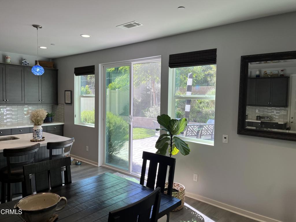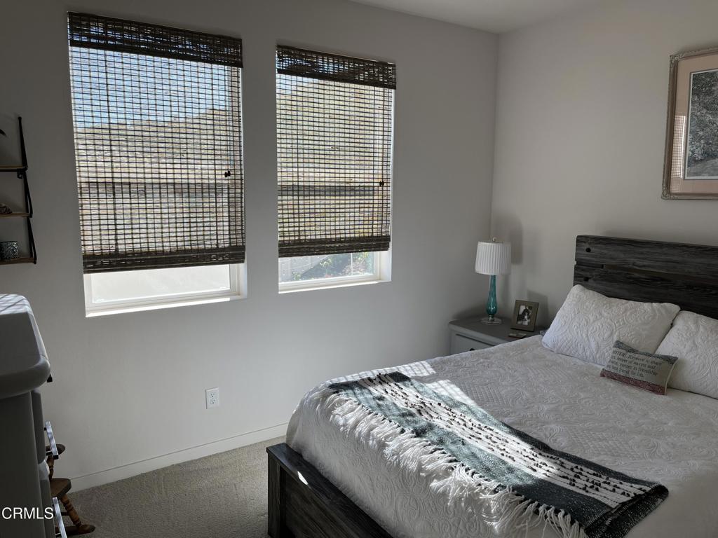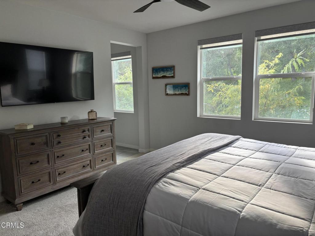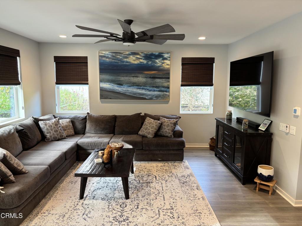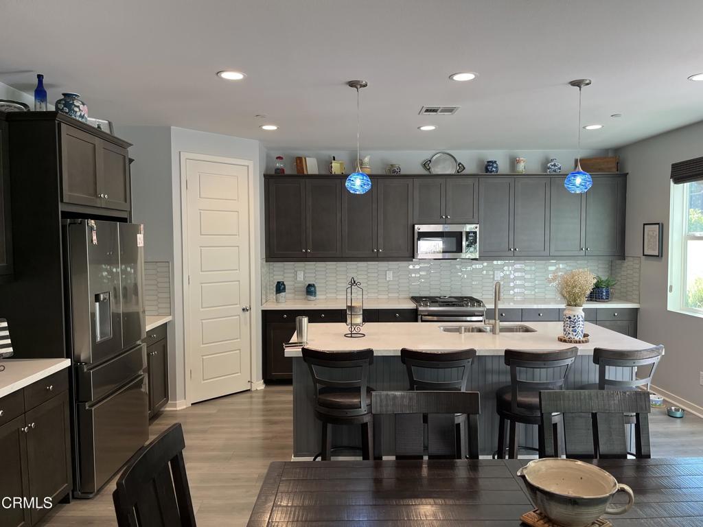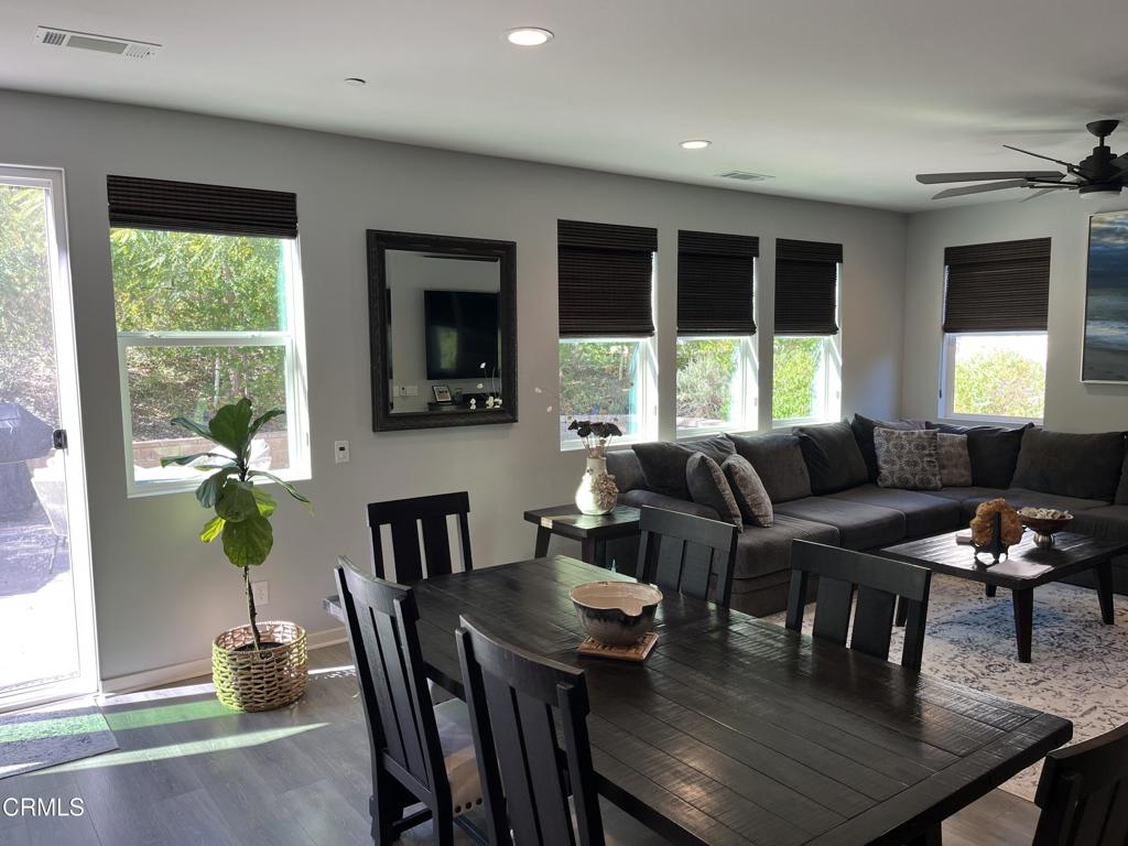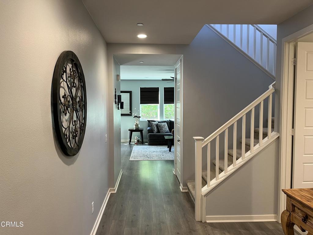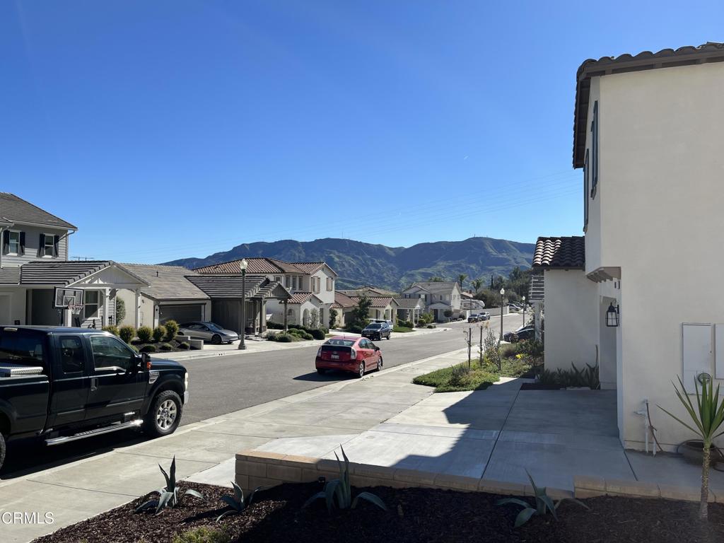 Newer 2-story, 4-bedroom, 3-bath home sits on a corner lot, nestled against the hillside at the end of the block and is Move In Ready. The main level features one bedroom and full bath ideal for elderly family or guests. The open-concept flows seamlessly from family room to dining area into a modern kitchen with quartz countertops, tiled backsplash, large island and separate pantry. Upstairs, a versatile loft area can serve as office space or convert to a 5th bedroom. Two good-sized bedrooms share a dual-sink hall bath on the south side, and the master suite features an en-suite tiled shower and walk-in closet accessible through the bathroom. Upstairs includes the laundry room. Throughout, the home showcases dual-pane windows, custom window coverings, ceiling fans, quartz countertops, recessed lighting, central A/C, carpeted bedrooms, and custom paint. Outside, designer pavers create an inviting backyard with retaining wall, drainage system, automatic sprinklers, and a side storage shed–all framed by beautiful hillside views. The 4-car driveway includes dual side gates providing easy RV and boat access. The garage includes epoxy flooring, cabinetry, shelving, tankless water heater, and EV charging hookup. 15 miles to Ventura beach.