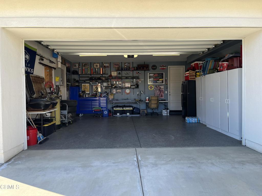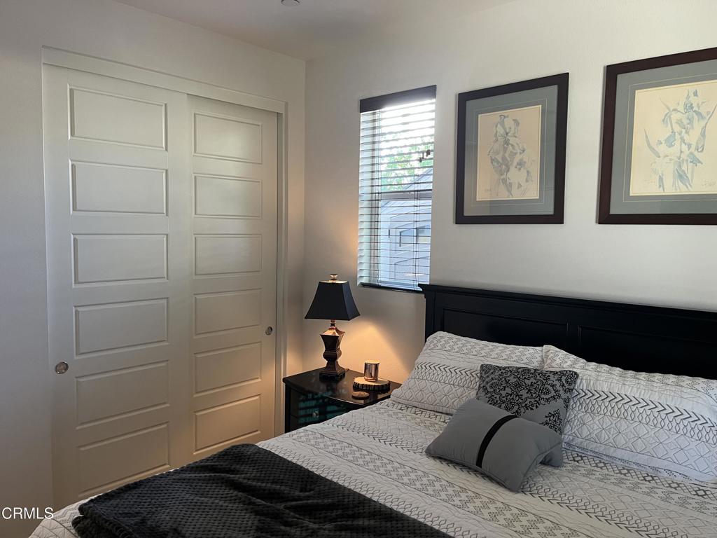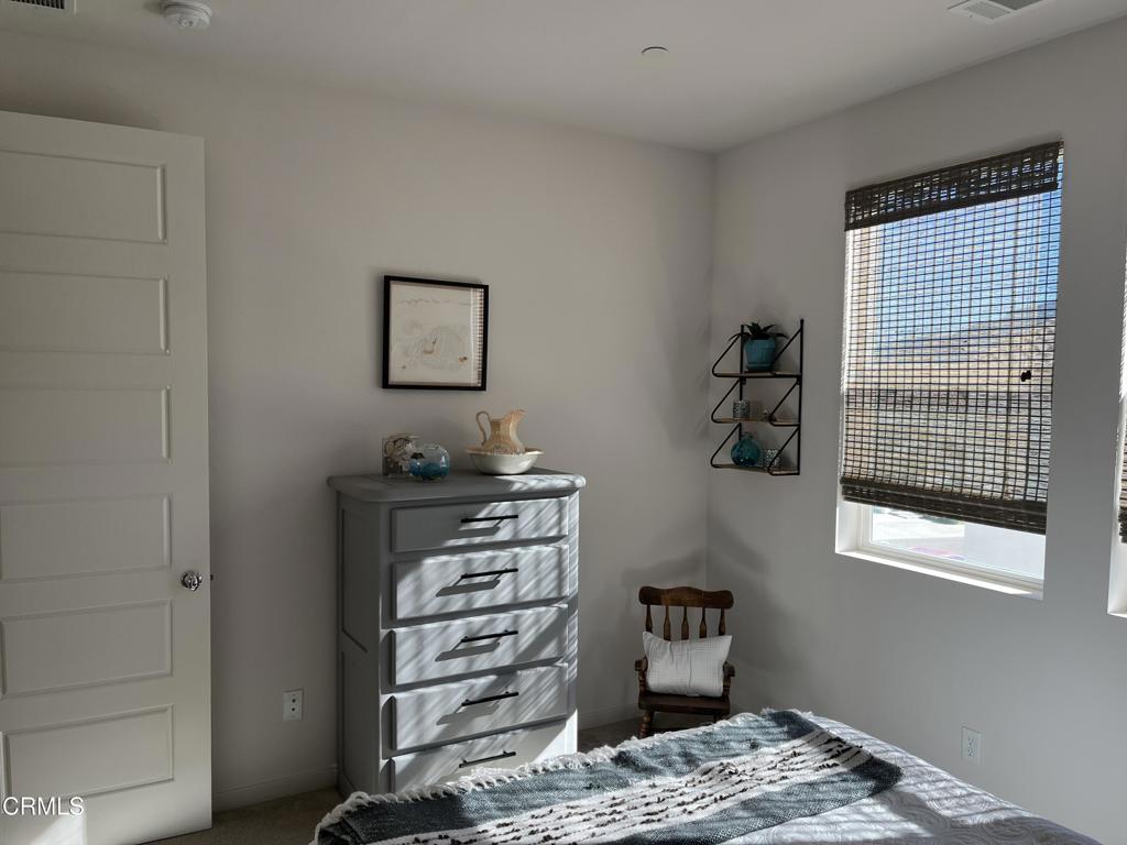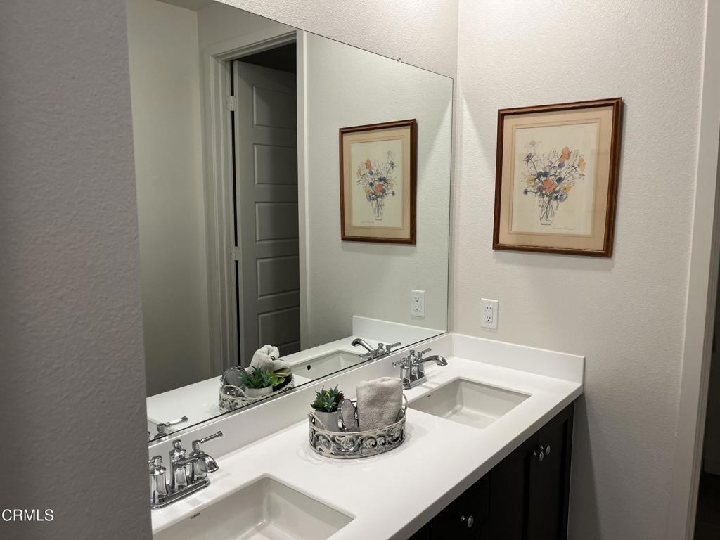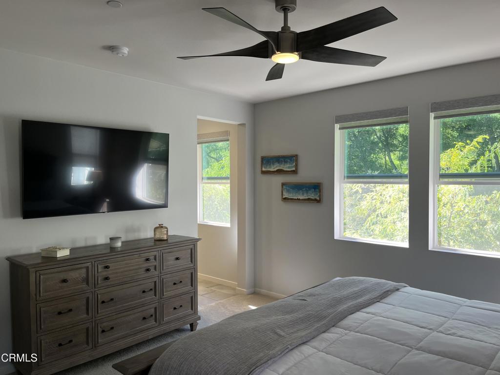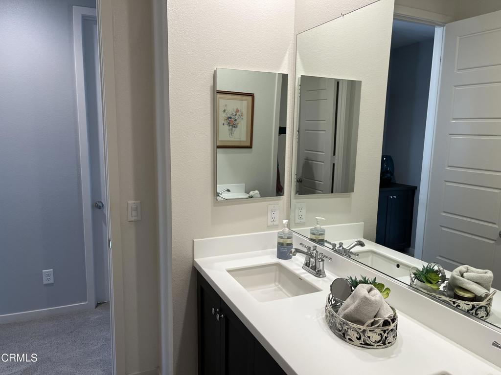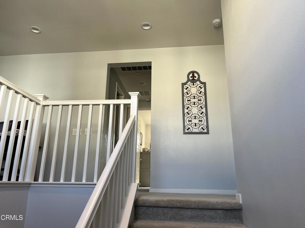 Newer 2-story, 4-bedroom, 3-bath home sits on a corner lot, nestled against the hillside at the end of the block and is Move In Ready. The main level features one bedroom and full bath ideal for elderly family or guests. The open-concept flows seamlessly from family room to dining area into a modern kitchen with quartz countertops, tiled backsplash, large island and separate pantry. Upstairs, a versatile loft area can serve as office space or convert to a 5th bedroom. Two good-sized bedrooms share a dual-sink hall bath on the south side, and the master suite features an en-suite tiled shower and walk-in closet accessible through the bathroom. Upstairs includes the laundry room. Throughout, the home showcases dual-pane windows, custom window coverings, ceiling fans, quartz countertops, recessed lighting, central A/C, carpeted bedrooms, and custom paint. Outside, designer pavers create an inviting backyard with retaining wall, drainage system, automatic sprinklers, and a side storage shed–all framed by beautiful hillside views. The 4-car driveway includes dual side gates providing easy RV and boat access. The garage includes epoxy flooring, cabinetry, shelving, tankless water heater, and EV charging hookup. 15 miles to Ventura beach.