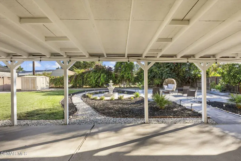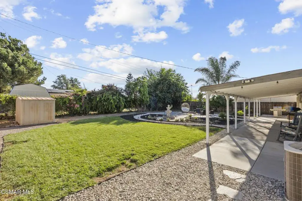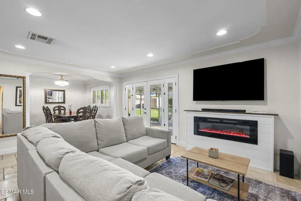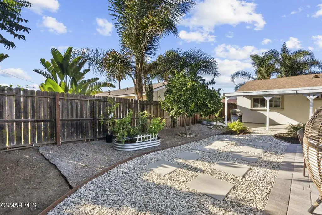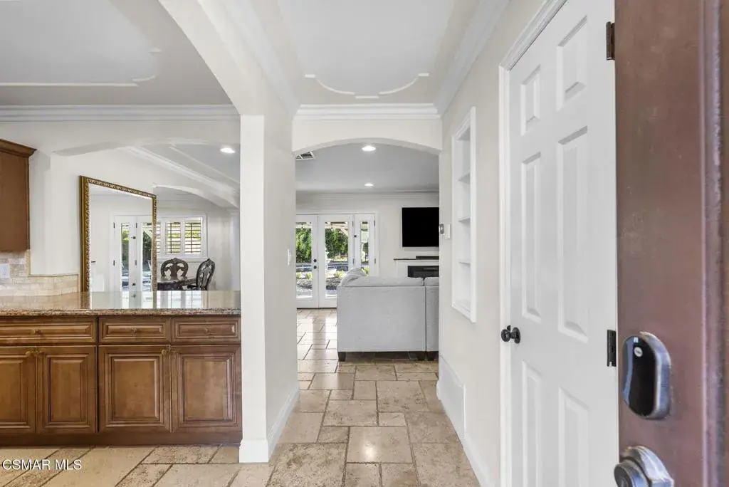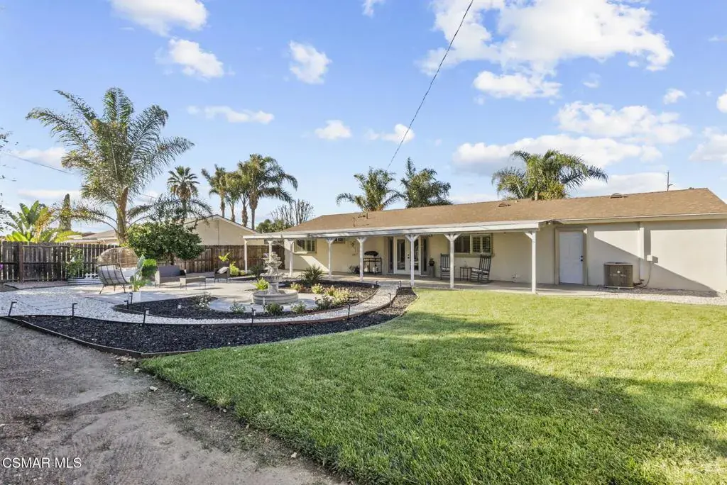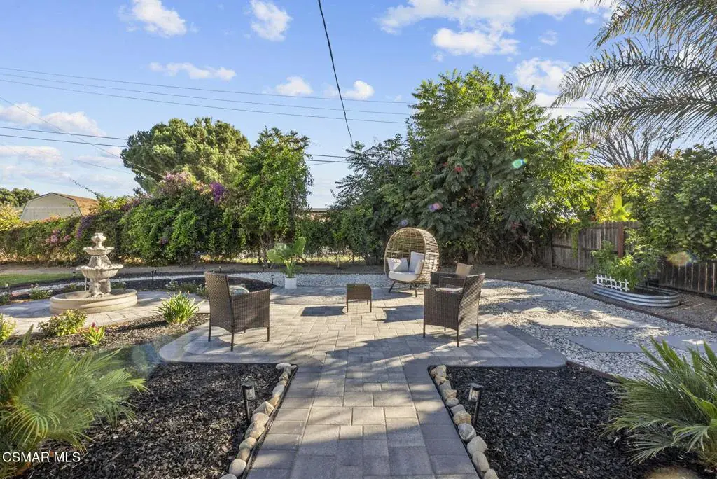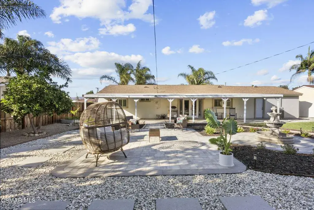 This stunning home offers a seamless open layout and an expansive backyard, perfect for both entertaining and everyday relaxation. From the moment you arrive, the curb appeal shines with elegant plaster finishes and lush mature landscaping.Step inside to an inviting open floor plan with custom French doors leading to a serene backyard retreat featuring a covered patio, fruit trees, and a garden. With ample space for an ADU or pool, the possibilities are endless.The chef’s kitchen is equipped with espresso custom cabinetry, granite countertops, stainless steel appliances, and a stylish pass-through bar top–ideal for casual dining or buffet-style entertaining.Throughout the home, you’ll find luxurious touches: Travertine Versailles flooring, crown molding, recessed lighting, custom doors, and a cozy fireplace. Both bathrooms have been tastefully remodeled with Travertine finishes, dual sink in hallway bath,, and custom cabinetry. Bedrooms feature newer laminate flooring and generous closet space.This flexible floor plan can easily be converted back to a four-bedroom with a second full bath. With smart-home technology and turnkey upgrades throughout, this property is move-in ready and designed for modern living.