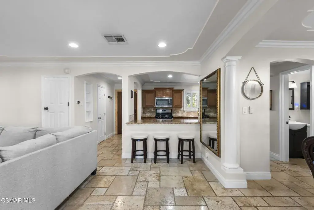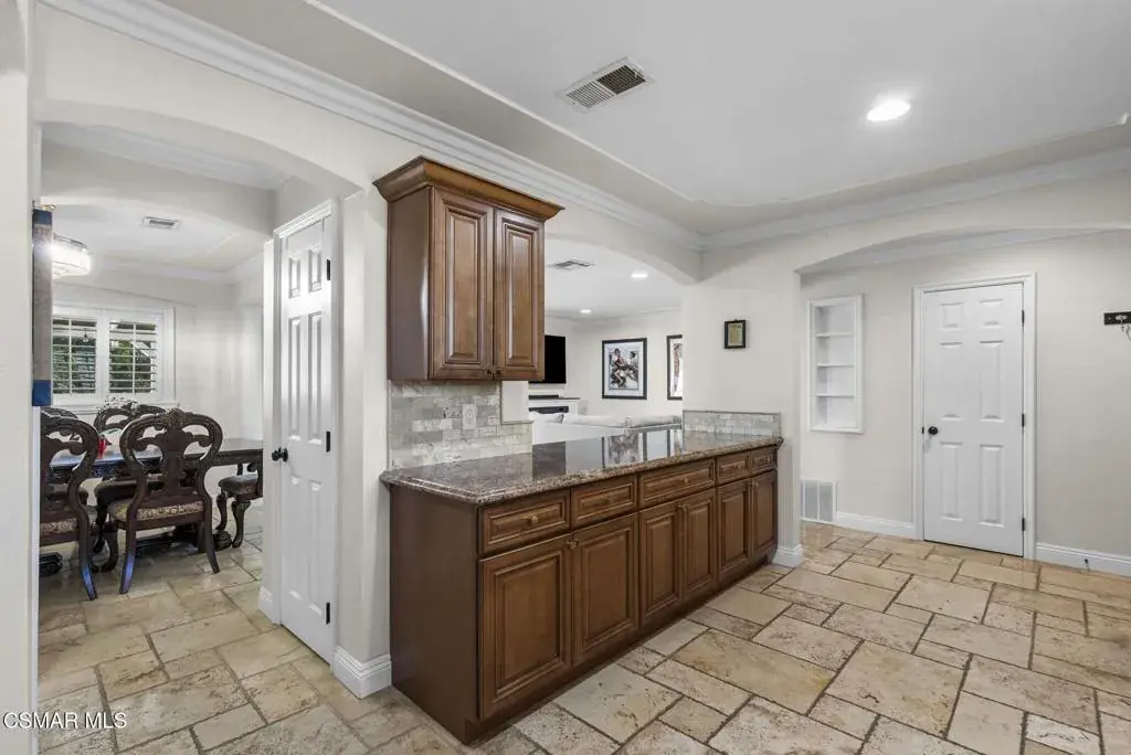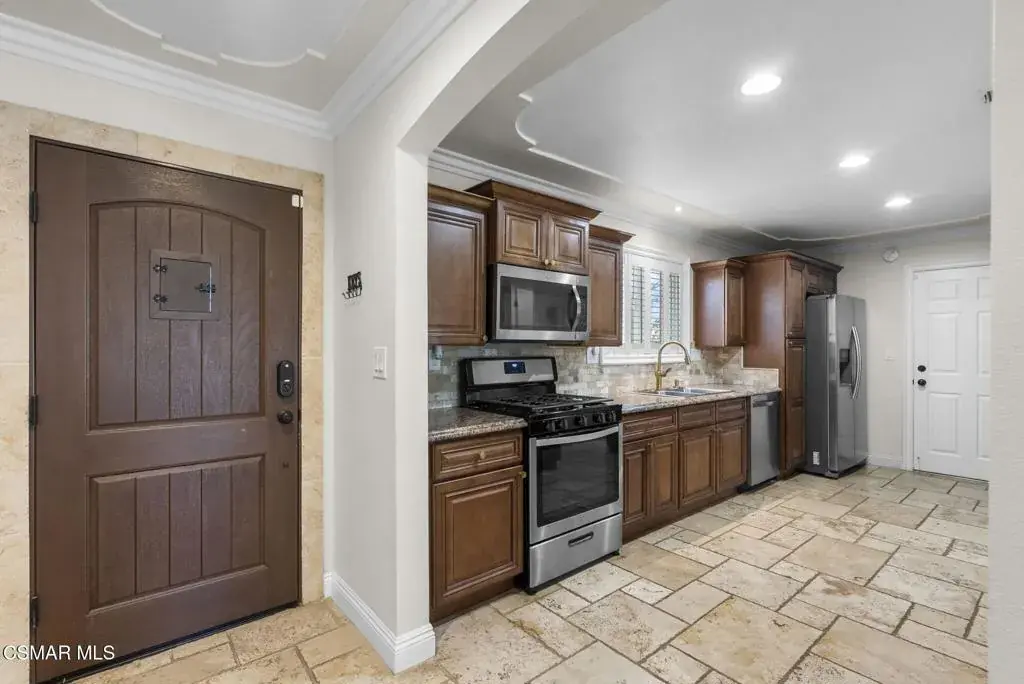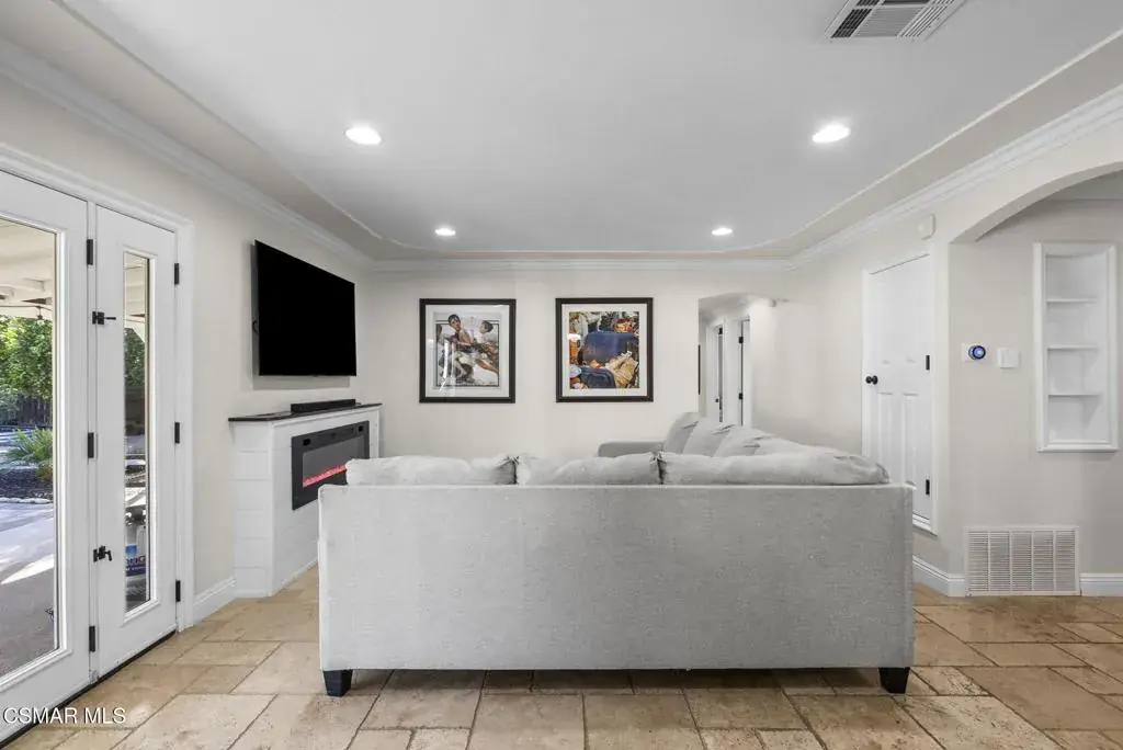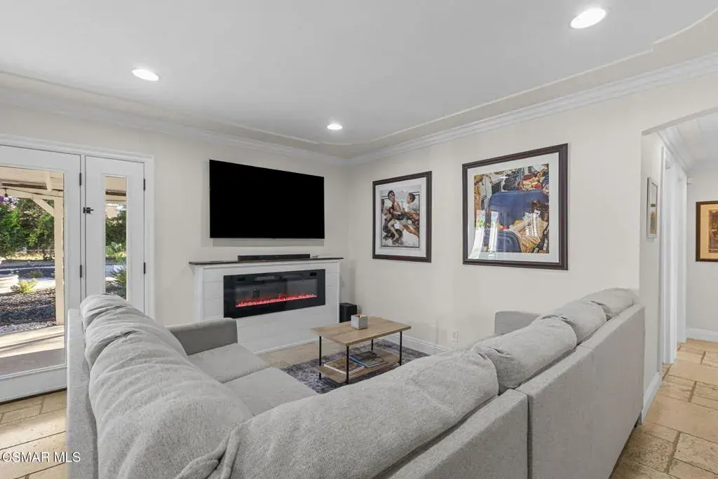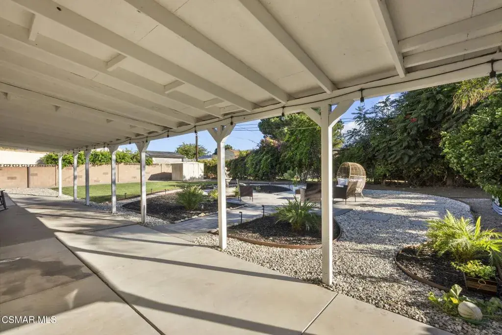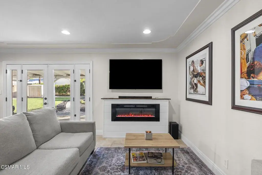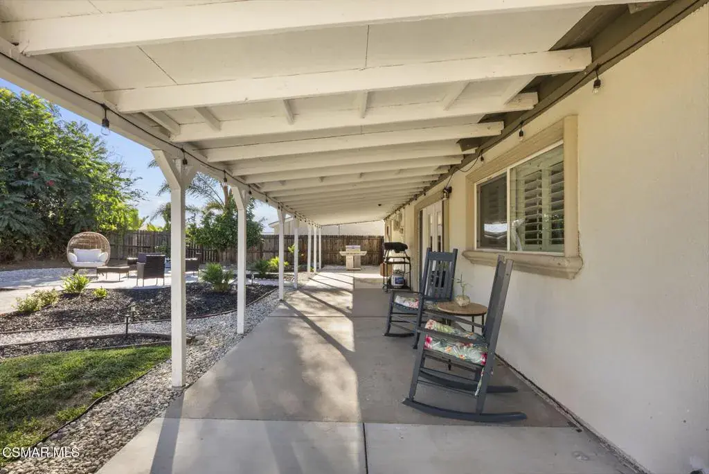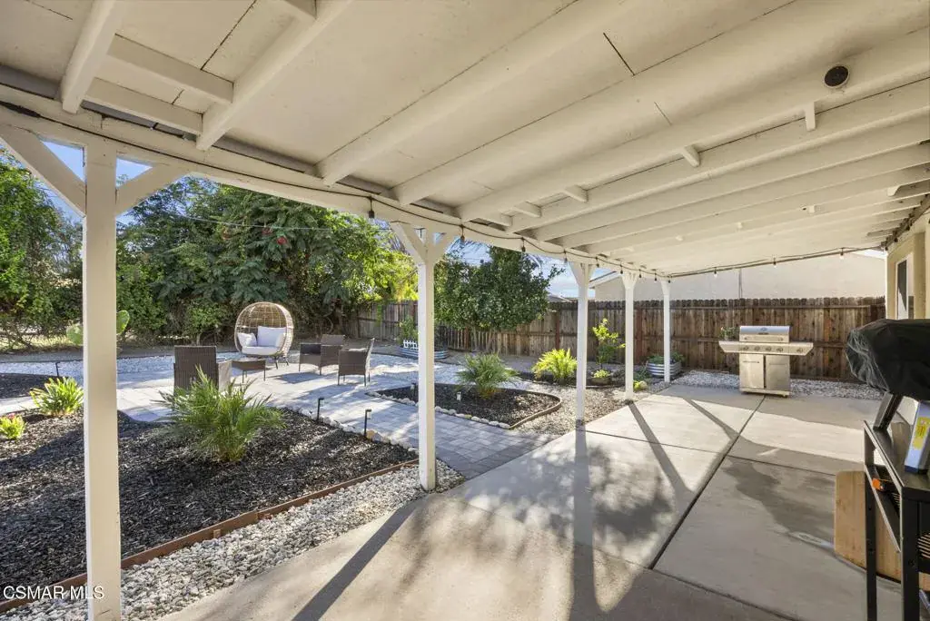 This stunning home offers a seamless open layout and an expansive backyard, perfect for both entertaining and everyday relaxation. From the moment you arrive, the curb appeal shines with elegant plaster finishes and lush mature landscaping.Step inside to an inviting open floor plan with custom French doors leading to a serene backyard retreat featuring a covered patio, fruit trees, and a garden. With ample space for an ADU or pool, the possibilities are endless.The chef’s kitchen is equipped with espresso custom cabinetry, granite countertops, stainless steel appliances, and a stylish pass-through bar top–ideal for casual dining or buffet-style entertaining.Throughout the home, you’ll find luxurious touches: Travertine Versailles flooring, crown molding, recessed lighting, custom doors, and a cozy fireplace. Both bathrooms have been tastefully remodeled with Travertine finishes, dual sink in hallway bath,, and custom cabinetry. Bedrooms feature newer laminate flooring and generous closet space.This flexible floor plan can easily be converted back to a four-bedroom with a second full bath. With smart-home technology and turnkey upgrades throughout, this property is move-in ready and designed for modern living.
