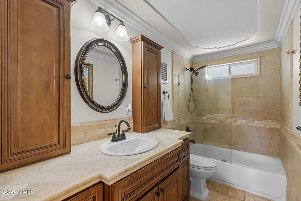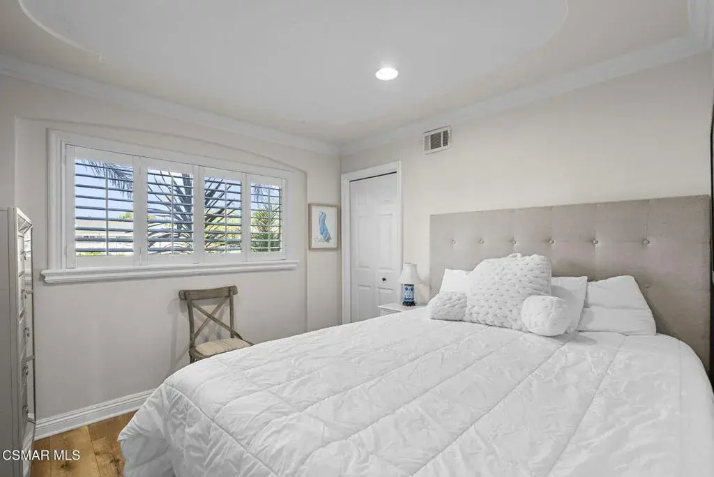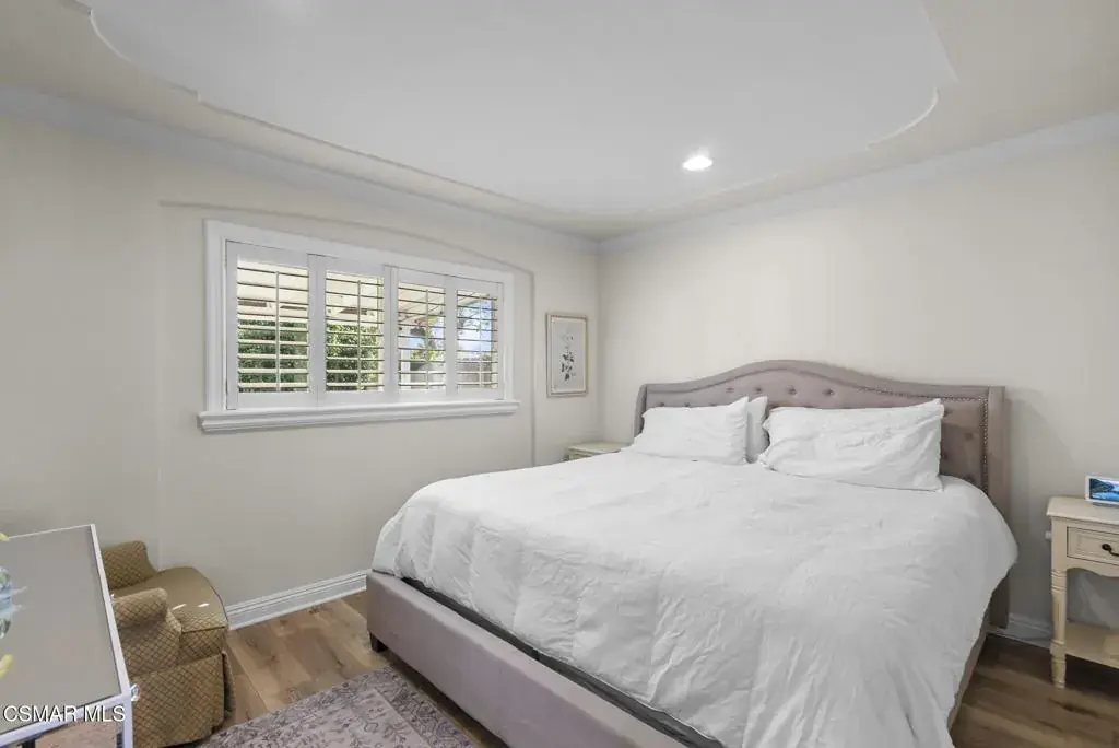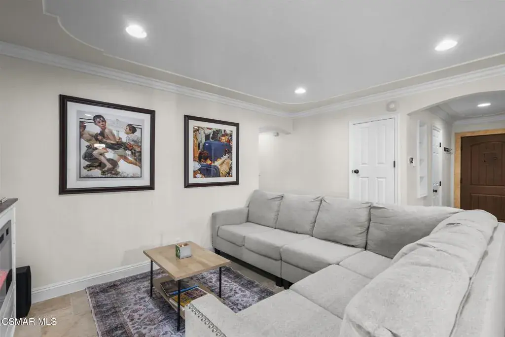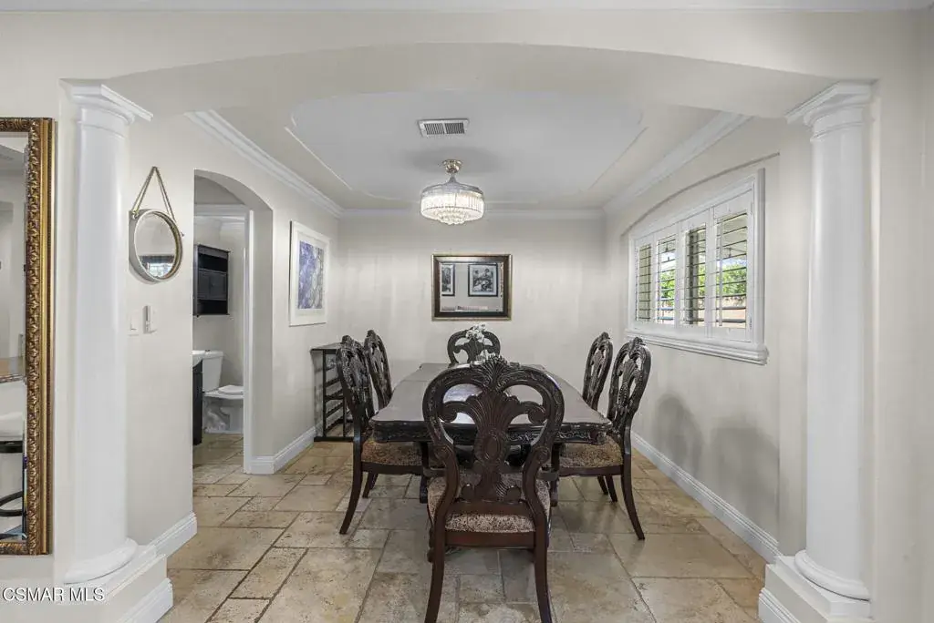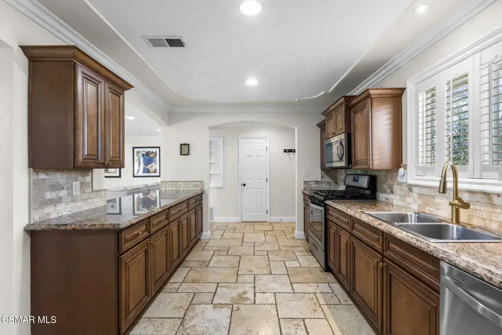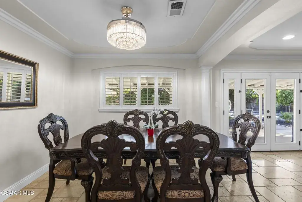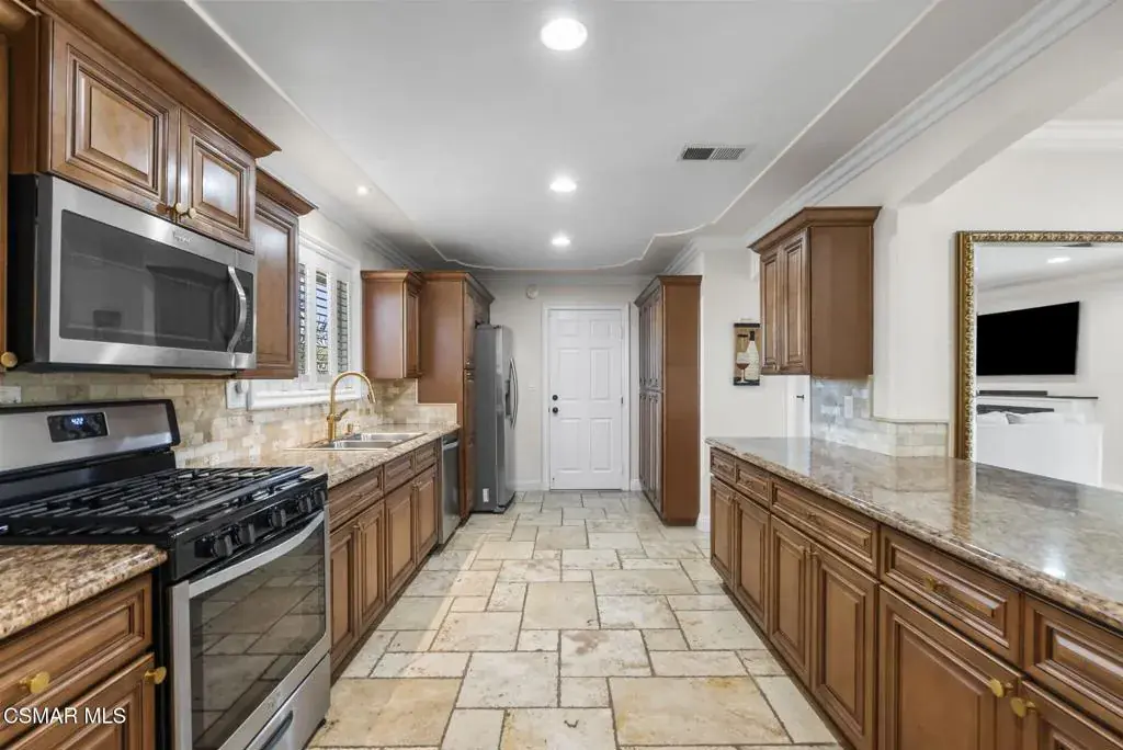 This stunning home offers a seamless open layout and an expansive backyard, perfect for both entertaining and everyday relaxation. From the moment you arrive, the curb appeal shines with elegant plaster finishes and lush mature landscaping.Step inside to an inviting open floor plan with custom French doors leading to a serene backyard retreat featuring a covered patio, fruit trees, and a garden. With ample space for an ADU or pool, the possibilities are endless.The chef’s kitchen is equipped with espresso custom cabinetry, granite countertops, stainless steel appliances, and a stylish pass-through bar top–ideal for casual dining or buffet-style entertaining.Throughout the home, you’ll find luxurious touches: Travertine Versailles flooring, crown molding, recessed lighting, custom doors, and a cozy fireplace. Both bathrooms have been tastefully remodeled with Travertine finishes, dual sink in hallway bath,, and custom cabinetry. Bedrooms feature newer laminate flooring and generous closet space.This flexible floor plan can easily be converted back to a four-bedroom with a second full bath. With smart-home technology and turnkey upgrades throughout, this property is move-in ready and designed for modern living.