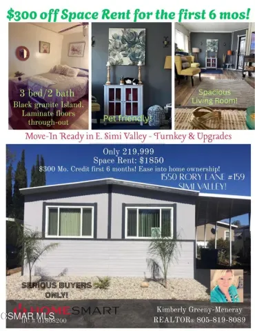 - 1550 Rory LN #159 Simi Valley CA is a Single Family for sale in Simi Valley, CA, 93063. It is listed for $219,999 and features 3 beds, 2 baths, and has approximately 1,344 square feet of living space, and was originally constructed in 1976. The current price per square foot is $164. The average price per square foot for Single Family listings in Simi Valley is $402. The average listing price for Single Family in Simi Valley is $994,191. To schedule a showing of MLS#225004533 at 1550 Rory LN #159 in Simi Valley, CA, contact your Outland and Associates / JoAnn Outland agent at 8054417754.