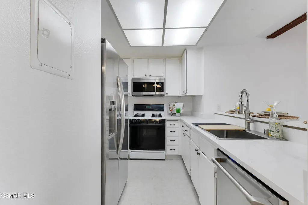 Welcome to this beautifully upgraded upstairs condo in the desirable Parkview community. This inviting 2 bedroom, 2 bath residence offers a light, airy ambiance with thoughtful enhancements throughout.The spacious kitchen is tastefully updated with quartz countertops, bright cabinetry, and new appliances, including a refrigerator. A convenient breakfast bar adds both functionality and style, making it ideal for everyday living and entertaining.The primary suite is generously sized, offering comfort and privacy, while both bathrooms have been upgraded with elegant finishes, including marble inspired tile and modern floating shelving.Additional highlights include in unit laundry, a private balcony perfect for relaxing, a tankless water heater, fresh interior paint, and ethernet connectivity in one bedroom. The home also includes a one car garage plus an assigned parking space.Ideally located close to shopping, dining, and everyday conveniences, this community also features a sparkling pool, perfect for enjoying warm California days.