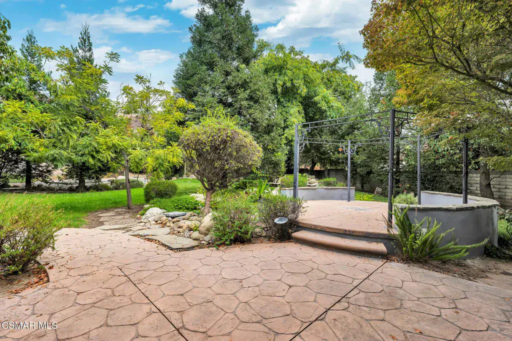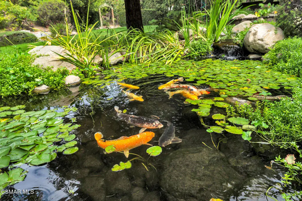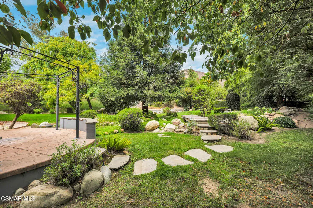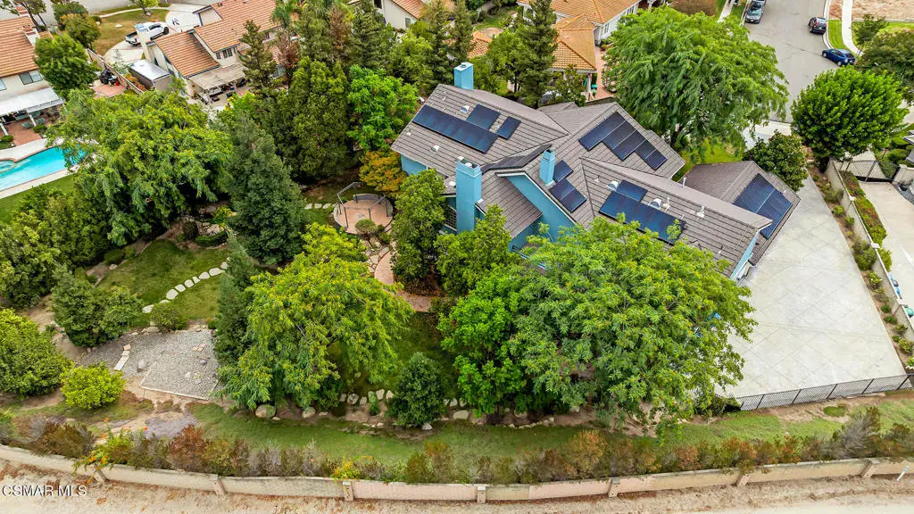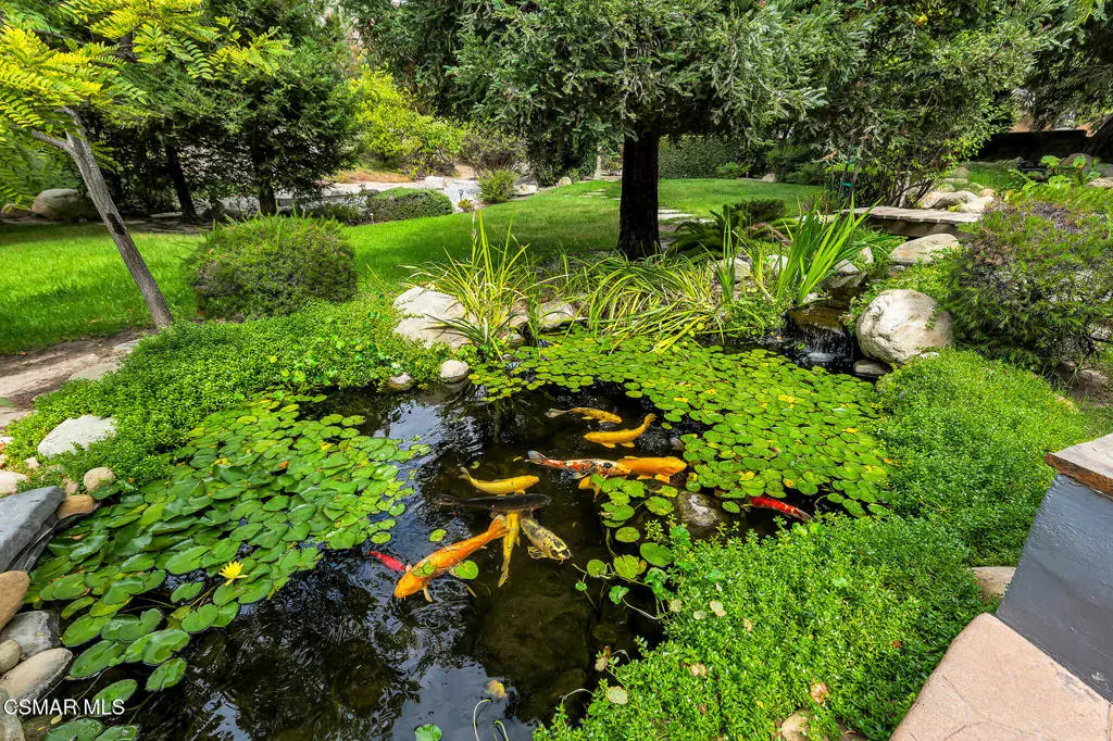 A rare offering in Simi Valley, this custom 6-bedroom, 6.5-bath estate crowns the end of a quiet cul-de-sac, presenting over 5,600 sq. ft. of refined living on a 25,000+ sq. ft. lot. Currently owned by a Hollywood producer who sought a private retreat outside the city, the estate has also hosted gatherings attended by movie stars, directors, and producers — a testament to its scale and entertaining appeal. The approach is framed by mature shade trees, lush landscaping, river rock accents, and a custom river rock mailbox. An extra-long and wide stamped concrete driveway with possible RV parking enhances curb appeal, while the custom double-door entry with leaded glass sidelights sets a welcoming tone. Inside, the foyer opens with real wood floors, soaring ceilings, and an artisan agate chandelier. To the left, a study/office with floor-to-ceiling custom built-ins provides the perfect setting for a home library or workspace, while still offering the versatility of a bedroom with ensuite bath. Nearby, French glass doors open to an additional room, previously used as a music room, ideal as a den, playroom, or creative space. The formal living room rises to 30 feet with abundant windows and a travertine raised-hearth fireplace, while French doors lead to the backyard. Off the living room, a dedicated theater room boasts a 210′ screen, Sony projector, blackout curtains, surround sound, and 7 reclining chairs — all included. The gourmet kitchen showcases two full-capacity Sub-Zero units–refrigerator and freezer, a Viking 6-burner cooktop with griddle and hood flanked by custom spice racks, a Viking microwave, Bosch dishwasher, abundant cabinetry with built-in storage nooks, and an extra-long granite island with travertine accents and pendant lighting. A butler’s pantry with sink, wine refrigeration, and walk-in pantry enhances functionality, while a built-in china cabinet and casual dining area add charm. A second bedroom with adjacent bath, laundry room, and guest powder room complete the lower level. Upstairs, an open loft-style landing creates a striking catwalk across the home, overlooking the living areas below and connecting the bedrooms. The primary suite offers a private retreat with a balcony overlooking the backyard, sitting area, fireplace, dual walk-in closets with organizers, and a marble bath with dual vanities, soaking tub, and steam shower with dual heads. Three additional ensuite bedrooms with closet organizers complete the upper floor. The backyard feels like a private park, with expansive lawns, stamped concrete patios, covered sitting areas, koi pond with waterfall and wood bridge, rose gardens, grapevines, and fruit trees — plus plenty of space to add a pool, greenhouse, or other features to fit your lifestyle. The spacious 3-car garage includes epoxy flooring, overhead storage, an updated electrical panel, two 220v outlets for EV charging, and a full-size safe. Energy efficiency is enhanced by a solar system paired with four Tesla wall batteries, designed to provide significant backup capability, including support for the home’s zoned A/C system. Additional features include three fireplaces, dual-paned windows with shutters, Nest temperature controls in every room, a recirculating water heater, a replaced sewer line, and fiber-optic connectivity for reliable high-speed internet access. Additional highlights include no HOA, a quiet neighborhood setting, and proximity to Lemon Park. Finishing touches include all artisan chandeliers and sconces handcrafted by Corbett. Blending custom design, thoughtful upgrades, and resort-style grounds, this estate is truly one of Simi Valley’s premier residences.