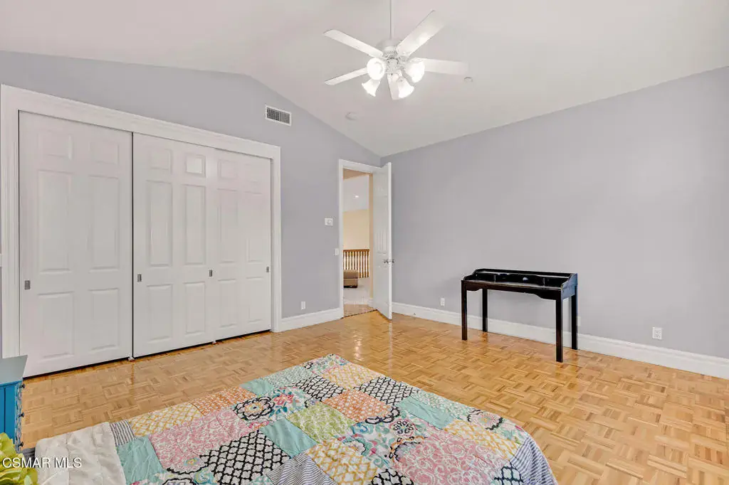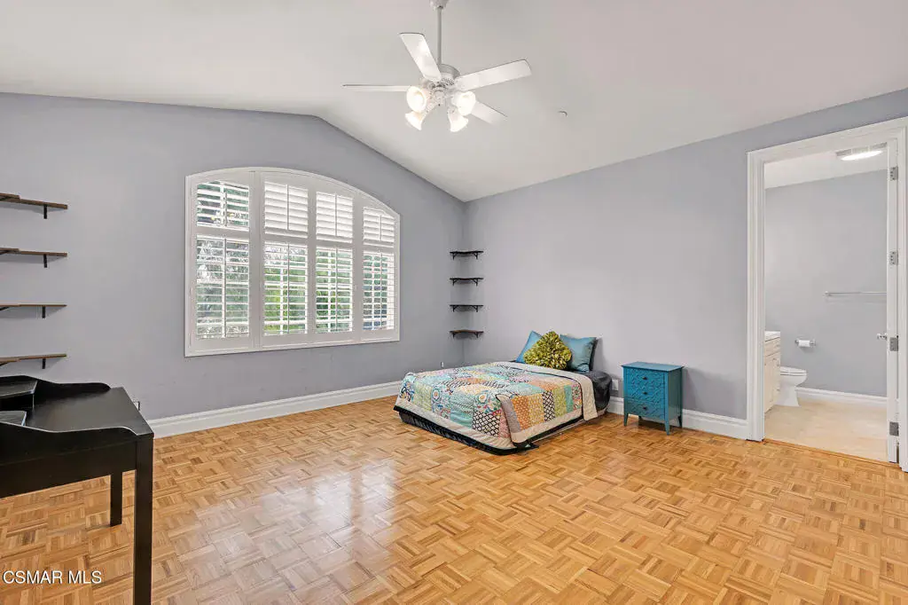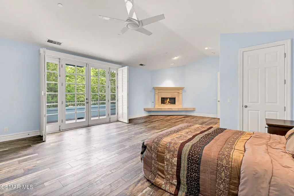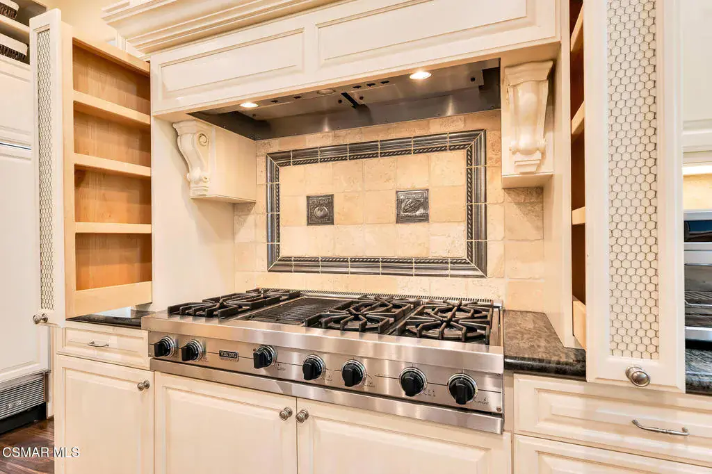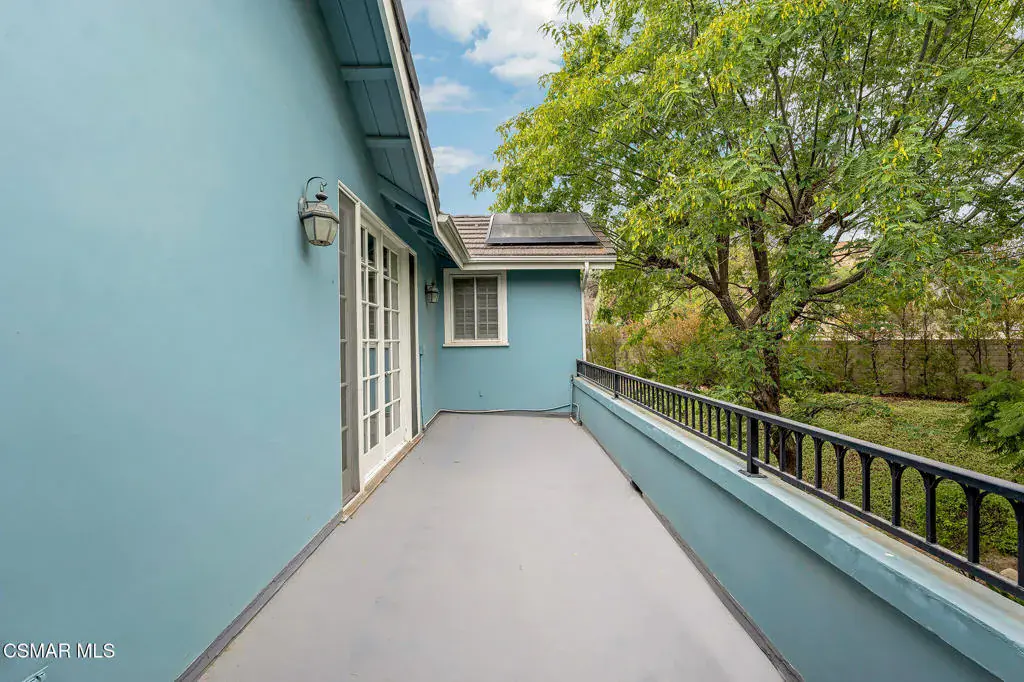 A rare offering in Simi Valley, this custom 6-bedroom, 6.5-bath estate crowns the end of a quiet cul-de-sac, presenting over 5,600 sq. ft. of refined living on a 25,000+ sq. ft. lot. Currently owned by a Hollywood producer who sought a private retreat outside the city, the estate has also hosted gatherings attended by movie stars, directors, and producers — a testament to its scale and entertaining appeal. The approach is framed by mature shade trees, lush landscaping, river rock accents, and a custom river rock mailbox. An extra-long and wide stamped concrete driveway with possible RV parking enhances curb appeal, while the custom double-door entry with leaded glass sidelights sets a welcoming tone. Inside, the foyer opens with real wood floors, soaring ceilings, and an artisan agate chandelier. To the left, a study/office with floor-to-ceiling custom built-ins provides the perfect setting for a home library or workspace, while still offering the versatility of a bedroom with ensuite bath. Nearby, French glass doors open to an additional room, previously used as a music room, ideal as a den, playroom, or creative space. The formal living room rises to 30 feet with abundant windows and a travertine raised-hearth fireplace, while French doors lead to the backyard. Off the living room, a dedicated theater room boasts a 210′ screen, Sony projector, blackout curtains, surround sound, and 7 reclining chairs — all included. The gourmet kitchen showcases two full-capacity Sub-Zero units–refrigerator and freezer, a Viking 6-burner cooktop with griddle and hood flanked by custom spice racks, a Viking microwave, Bosch dishwasher, abundant cabinetry with built-in storage nooks, and an extra-long granite island with travertine accents and pendant lighting. A butler’s pantry with sink, wine refrigeration, and walk-in pantry enhances functionality, while a built-in china cabinet and casual dining area add charm. A second bedroom with adjacent bath, laundry room, and guest powder room complete the lower level. Upstairs, an open loft-style landing creates a striking catwalk across the home, overlooking the living areas below and connecting the bedrooms. The primary suite offers a private retreat with a balcony overlooking the backyard, sitting area, fireplace, dual walk-in closets with organizers, and a marble bath with dual vanities, soaking tub, and steam shower with dual heads. Three additional ensuite bedrooms with closet organizers complete the upper floor. The backyard feels like a private park, with expansive lawns, stamped concrete patios, covered sitting areas, koi pond with waterfall and wood bridge, rose gardens, grapevines, and fruit trees — plus plenty of space to add a pool, greenhouse, or other features to fit your lifestyle. The spacious 3-car garage includes epoxy flooring, overhead storage, an updated electrical panel, two 220v outlets for EV charging, and a full-size safe. Energy efficiency is enhanced by a solar system paired with four Tesla wall batteries, designed to provide significant backup capability, including support for the home’s zoned A/C system. Additional features include three fireplaces, dual-paned windows with shutters, Nest temperature controls in every room, a recirculating water heater, a replaced sewer line, and fiber-optic connectivity for reliable high-speed internet access. Additional highlights include no HOA, a quiet neighborhood setting, and proximity to Lemon Park. Finishing touches include all artisan chandeliers and sconces handcrafted by Corbett. Blending custom design, thoughtful upgrades, and resort-style grounds, this estate is truly one of Simi Valley’s premier residences.