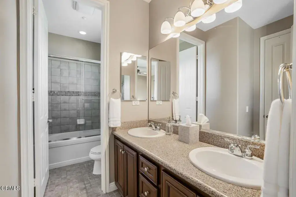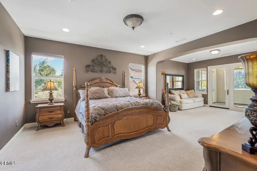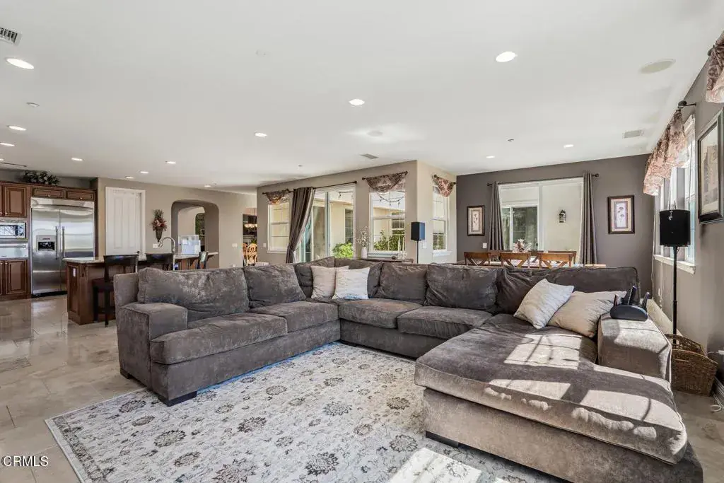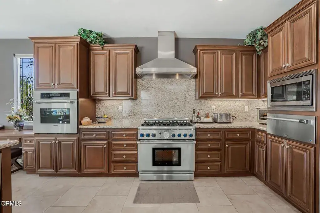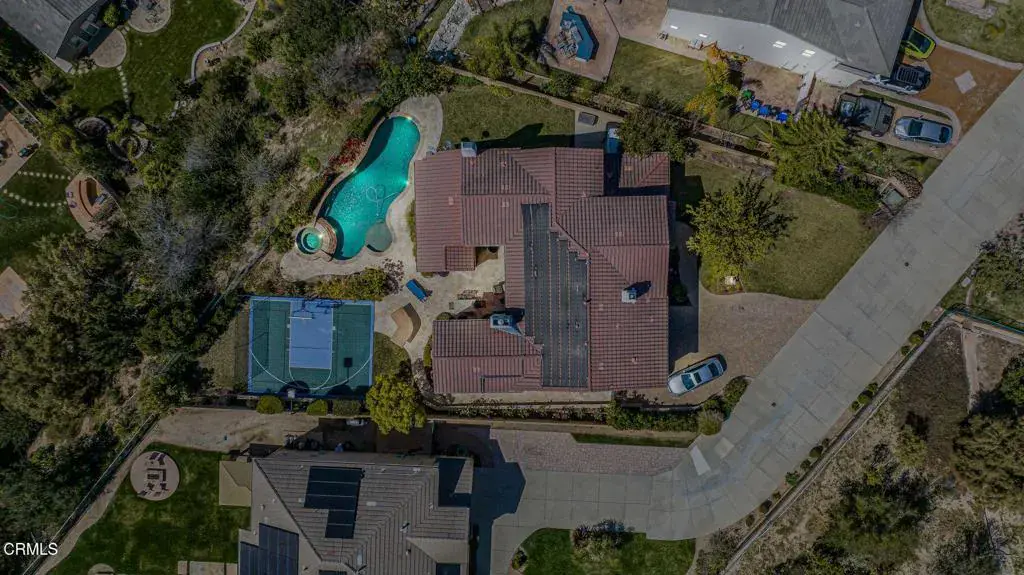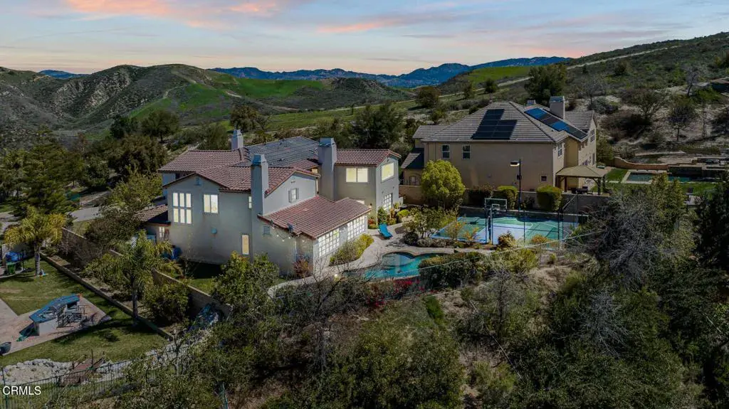 Indulge in refined living with this extraordinary luxury estate, well-situated at the end of a private drive off a cul-de-sac located in one of Simi Valley’s most desirable neighborhoods. Offering breathtaking sunset and mountain views, this property is set on an oversized lot, delivering ample space and privacy. Upon entering, you’ll be greeted by beautiful marble flooring and a flood of natural light with recessed lighting throughout the open floor plan. The formal living room is highlighted by a 20 foot ceiling, a switch-activated fireplace and custom-built shelving. The kitchen comes with a large marble island, Thermador appliances, including a six-burner range, dual ovens, built-in refrigerator/freezer, warming drawer and trash compactor. Enjoy meals in the formal dining area or the breakfast nook. The kitchen opens seamlessly into the family room, which has its own fireplace, creating a nice ambiance for everyday living and entertaining. The space also comes with in-ceiling, surround sound speakers and a custom, built-in entertainment center. The home has five bedrooms and a bonus room, including an expansive master suite with a separate sitting area, private, enclosed balcony with panoramic views and an oversized walk-in closet. The master bathroom features a jacuzzi tub, separate shower and dual vanities. The estate also includes four additional well-sized bedrooms and four bathrooms, one being a Jack and Jill for added convenience. The backyard was a bare lot when the home was last purchased in 2017. Over $150K has been invested in landscaping, hardscaping, a saltwater pool with flagstone coping, a natural travertine deck, a built-in jacuzzi, and a custom sports court with a professional-grade adjustable rim. The pool and jacuzzi are heated by a fully paid-for solar system. The grounds have extensive outdoor lighting, a courtyard fireplace, and a custom BBQ island, which is plumbed for natural gas. The estate comes with a 3-car garage and no detail has been spared to ensure the best in comfort, design and modern living. With its prime location, exceptional features and attention to detail, this residence represents a high standard of luxury living.