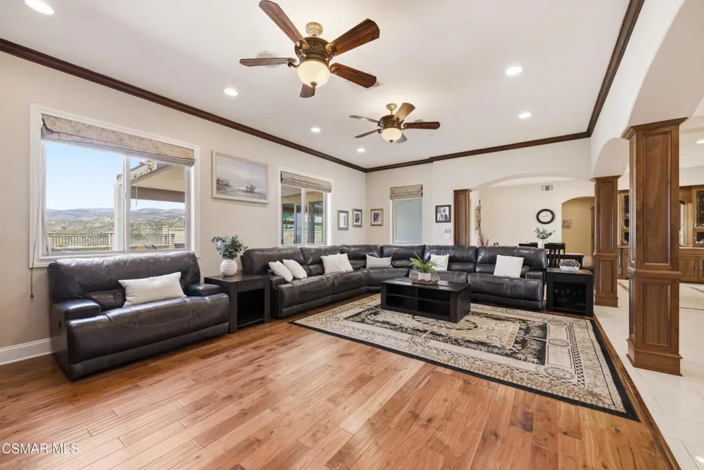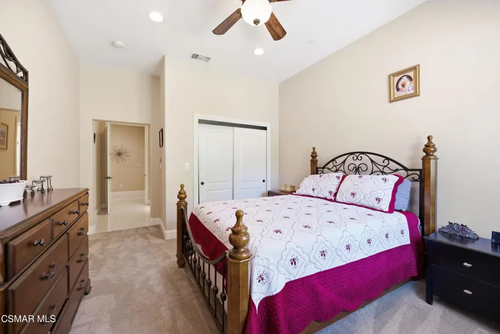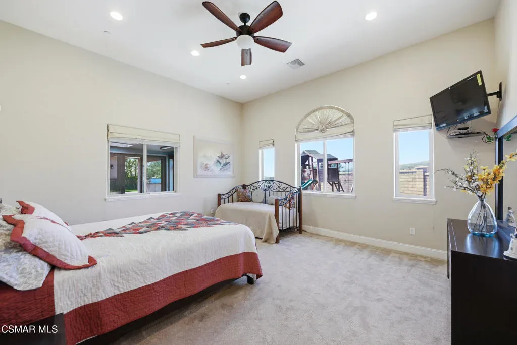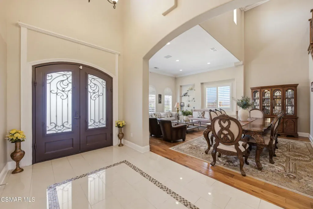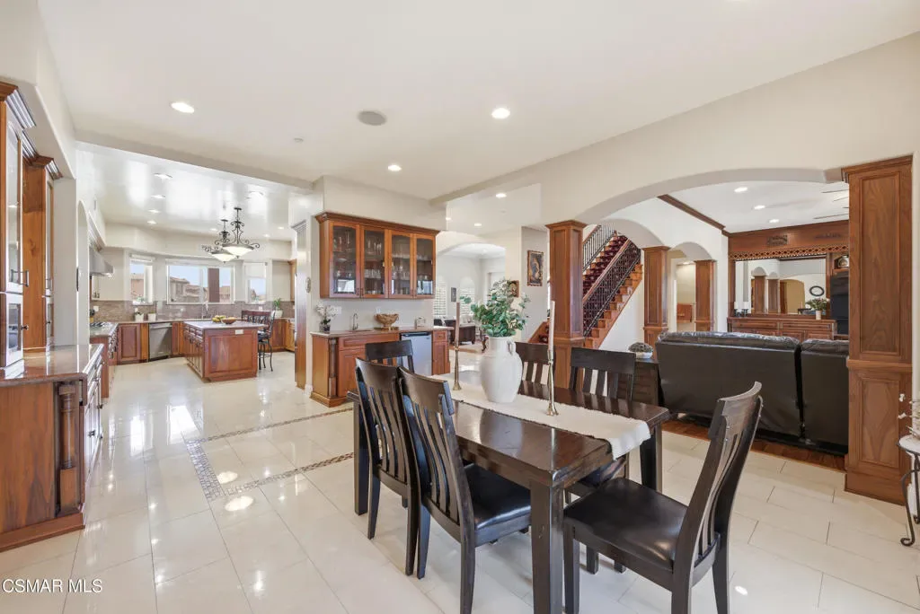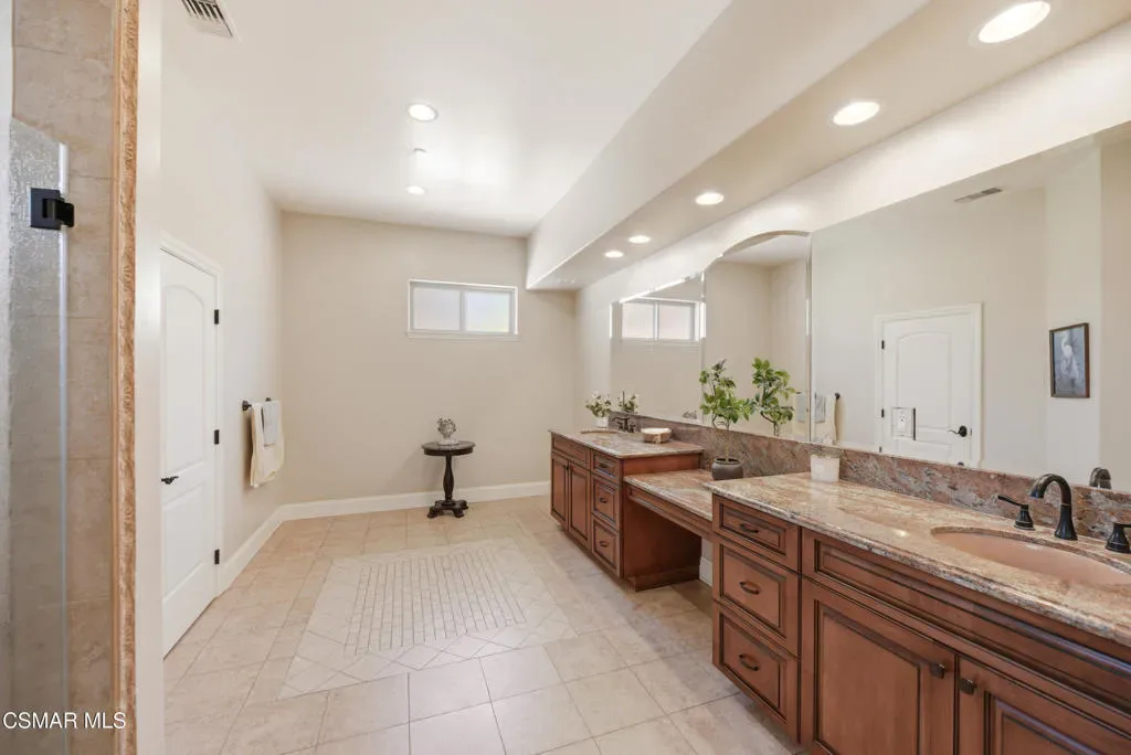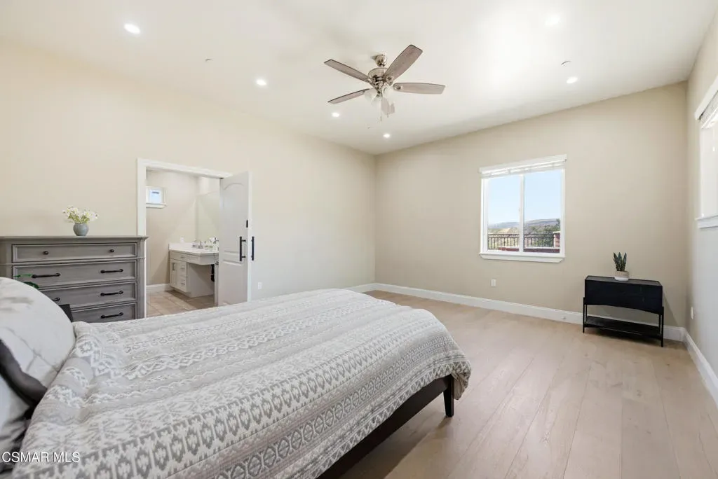 Custom Estate in Big Sky offers nearly 7,000 SF of living space, including 6 bedrooms + office, 5.5 bathrooms, and a private 1+1 ADU. Ideally located at the end of a cul-de-sac with unobstructed mountain views!! A rare multi-generational opportunity, this home features a downstairs primary suite, a guest bedroom with adjacent full bath and private entrance, plus a fully equipped guest house. The main residence spans 5,994 SF, complemented by a 998 SF guest house with 1 Bed and 1 Bath. A grand entry welcomes you with custom double glass doors, porcelain tile, engineered hardwood flooring, and a wood and iron staircase. Architectural details include columns, crown molding, and a built-in entertainment center. Formal living and dining rooms with plantation shutters flow seamlessly into the family room and secondary dining area, all enhanced by scenic views. Let’s not forget about the 330 SF sunroom with wall-to-wall windows and skylights adding additional flexible living space. The chef’s kitchen is designed for both function and entertaining, featuring a large island, granite countertops, stainless steel appliances, double ovens, a swing door, and a walk-in pantry with glass door. The main level includes 2 bedrooms, an office, and 2.5 baths, including the primary suite with backyard views, dual walk-in closets, dual vanities, and a large stone-tiled shower with bench. All bathrooms in the main home are upgraded with granite countertops, wood vanities, and custom tile work. Upstairs offers 4 additional bedrooms, 3 full bathrooms, a loft, and 2 balconies. Highlights include a large bonus room/bedroom with balcony access, two en-suite bedrooms with mountain views (one with balcony), and an additional bedroom with a nearby hall bath. A walkable, drywalled attic with built-in storage and attic fans adds valuable storage space. Built in 2022 The private guest house (ADU) is situated in its own wing and designed for comfort and accessibility, featuring wide entryways, engineered hardwood floors, Milgard windows, a fireplace, full kitchen with quartz countertops and shaker cabinetry, living and dining areas, a full-size laundry, and a primary suite with walk-in closet and spa-like bath. Multiple access points include a private exterior entrance, backyard access, and interior connection to the main home, with potential to add a staircase to the upstairs bonus room. The outdoor space offers a tranquil, private setting with mountain views, built-in BBQ, firepit, artificial turf, drought-tolerant landscaping, a grassy area, lemon, lime, and orange trees on a drip system. Built with quality and durability in mind, features include wide/deep footings, thick slab, steel beams and posts, Milgard windows with wood casings, 8-foot doors, crown molding, and recessed lighting throughout. Additional upgrades include a fully paid 17kW Tesla solar system (2023), 3 tankless water heaters, 3 HVAC systems, security cameras, and exterior lighting. Additional amenities include a 3-car garage, RV access with side shed, and a large driveway. The Big Sky community offers access to parks, hiking and biking trails, a nearby dog park, and convenient proximity to shopping, dining, hospitals, and the 118 and 23 freeways.