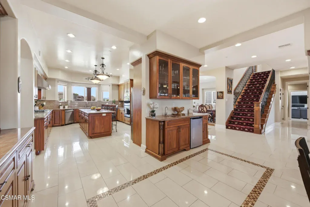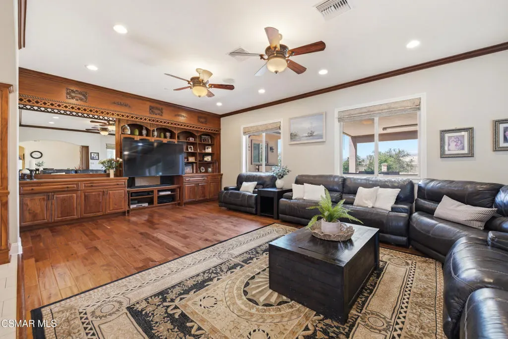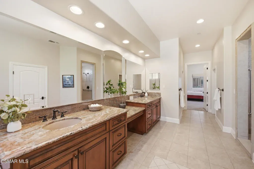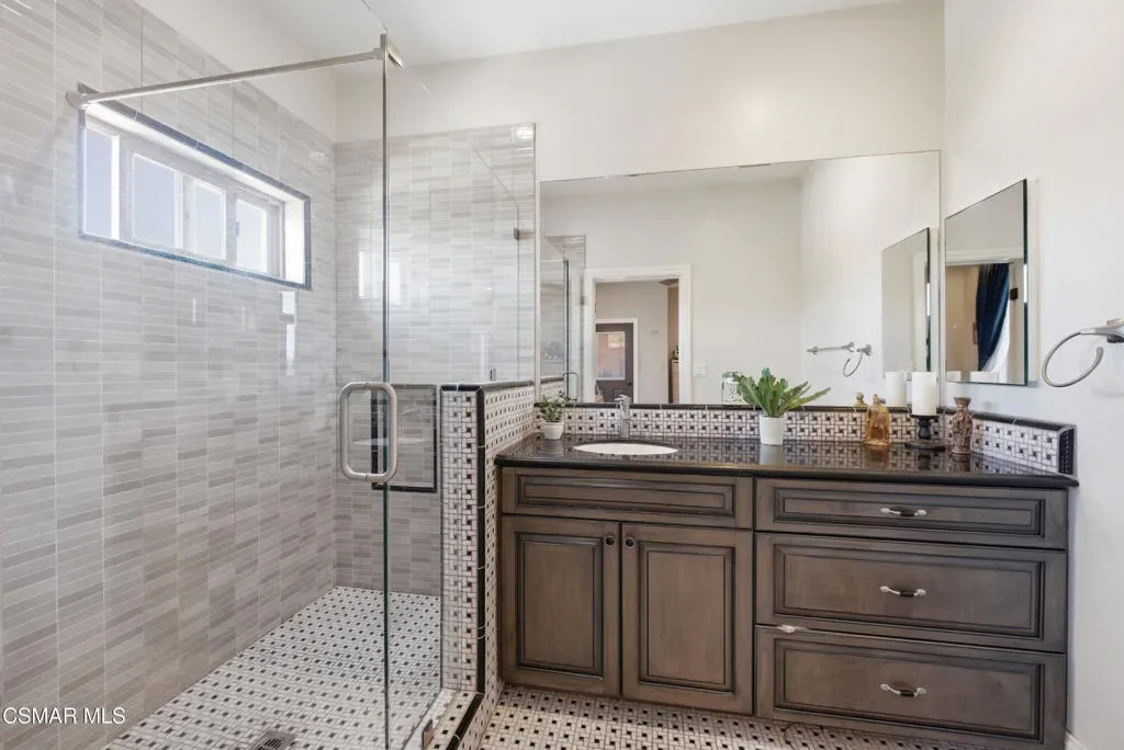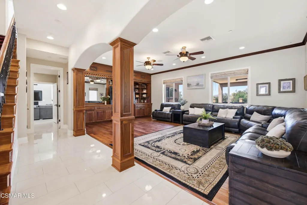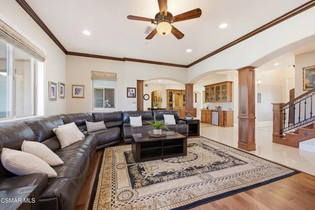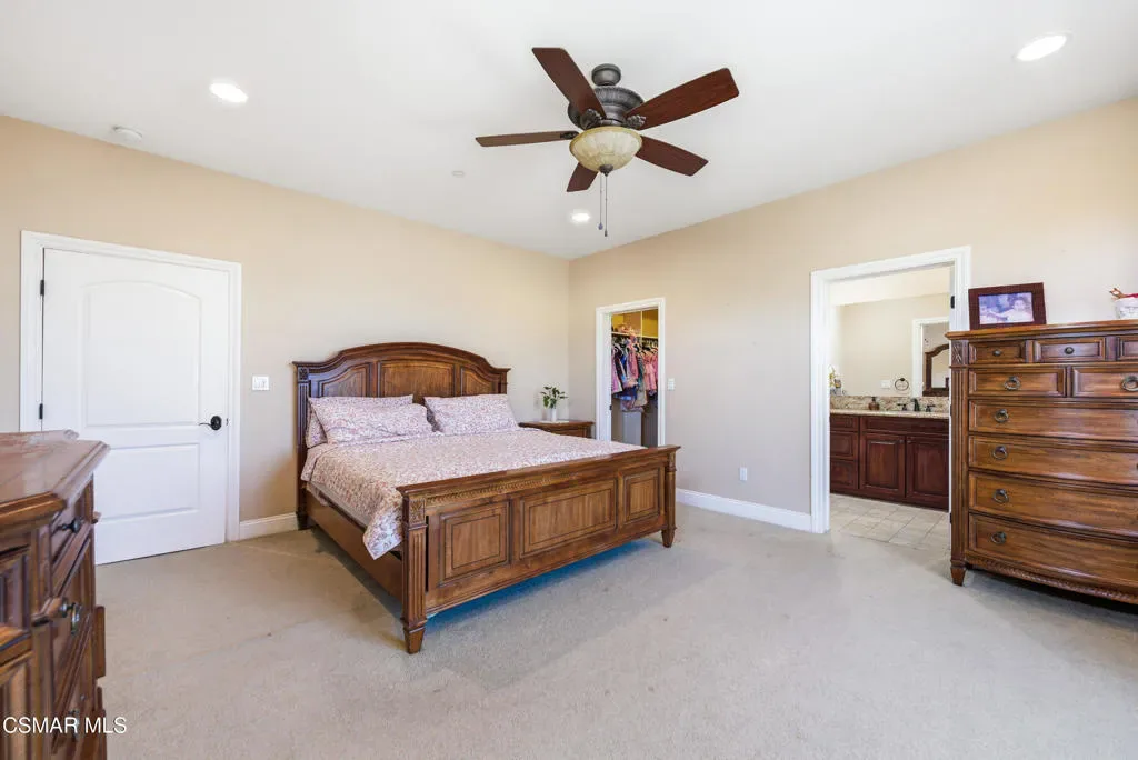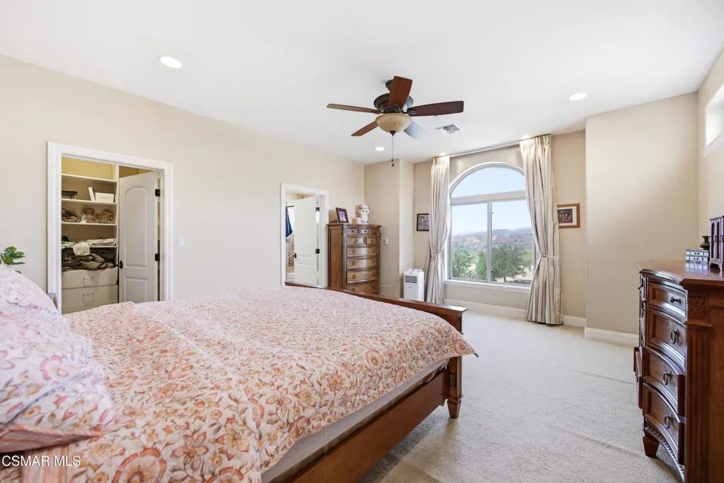 Custom Estate in Big Sky offers nearly 7,000 SF of living space, including 6 bedrooms + office, 5.5 bathrooms, and a private 1+1 ADU. Ideally located at the end of a cul-de-sac with unobstructed mountain views!! A rare multi-generational opportunity, this home features a downstairs primary suite, a guest bedroom with adjacent full bath and private entrance, plus a fully equipped guest house. The main residence spans 5,994 SF, complemented by a 998 SF guest house with 1 Bed and 1 Bath. A grand entry welcomes you with custom double glass doors, porcelain tile, engineered hardwood flooring, and a wood and iron staircase. Architectural details include columns, crown molding, and a built-in entertainment center. Formal living and dining rooms with plantation shutters flow seamlessly into the family room and secondary dining area, all enhanced by scenic views. Let’s not forget about the 330 SF sunroom with wall-to-wall windows and skylights adding additional flexible living space. The chef’s kitchen is designed for both function and entertaining, featuring a large island, granite countertops, stainless steel appliances, double ovens, a swing door, and a walk-in pantry with glass door. The main level includes 2 bedrooms, an office, and 2.5 baths, including the primary suite with backyard views, dual walk-in closets, dual vanities, and a large stone-tiled shower with bench. All bathrooms in the main home are upgraded with granite countertops, wood vanities, and custom tile work. Upstairs offers 4 additional bedrooms, 3 full bathrooms, a loft, and 2 balconies. Highlights include a large bonus room/bedroom with balcony access, two en-suite bedrooms with mountain views (one with balcony), and an additional bedroom with a nearby hall bath. A walkable, drywalled attic with built-in storage and attic fans adds valuable storage space. Built in 2022 The private guest house (ADU) is situated in its own wing and designed for comfort and accessibility, featuring wide entryways, engineered hardwood floors, Milgard windows, a fireplace, full kitchen with quartz countertops and shaker cabinetry, living and dining areas, a full-size laundry, and a primary suite with walk-in closet and spa-like bath. Multiple access points include a private exterior entrance, backyard access, and interior connection to the main home, with potential to add a staircase to the upstairs bonus room. The outdoor space offers a tranquil, private setting with mountain views, built-in BBQ, firepit, artificial turf, drought-tolerant landscaping, a grassy area, lemon, lime, and orange trees on a drip system. Built with quality and durability in mind, features include wide/deep footings, thick slab, steel beams and posts, Milgard windows with wood casings, 8-foot doors, crown molding, and recessed lighting throughout. Additional upgrades include a fully paid 17kW Tesla solar system (2023), 3 tankless water heaters, 3 HVAC systems, security cameras, and exterior lighting. Additional amenities include a 3-car garage, RV access with side shed, and a large driveway. The Big Sky community offers access to parks, hiking and biking trails, a nearby dog park, and convenient proximity to shopping, dining, hospitals, and the 118 and 23 freeways.