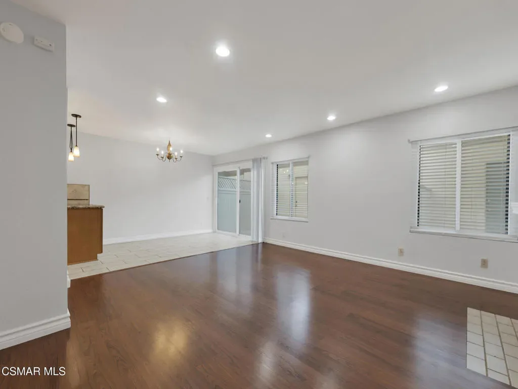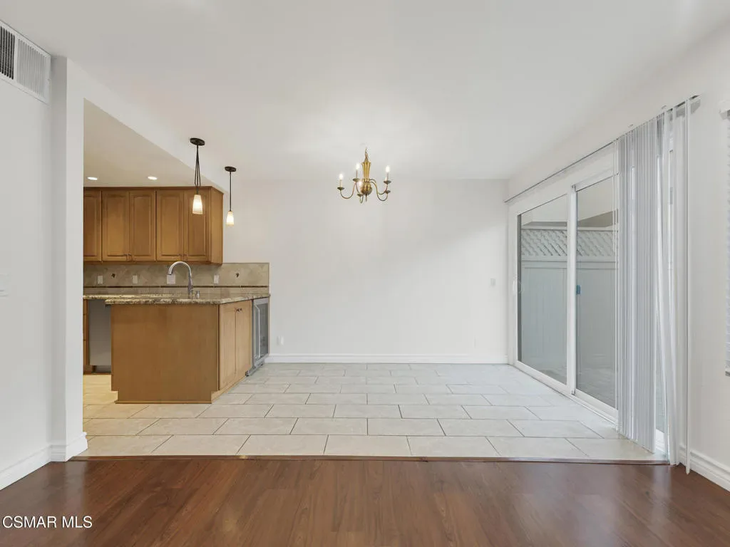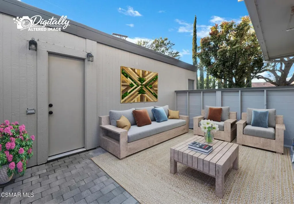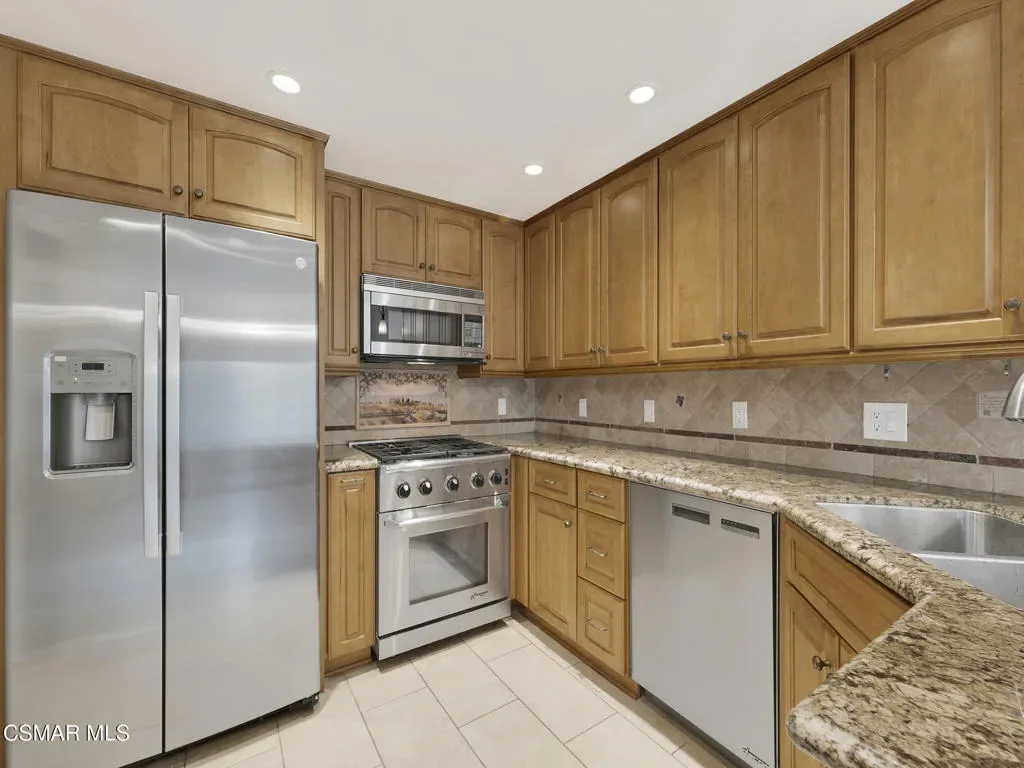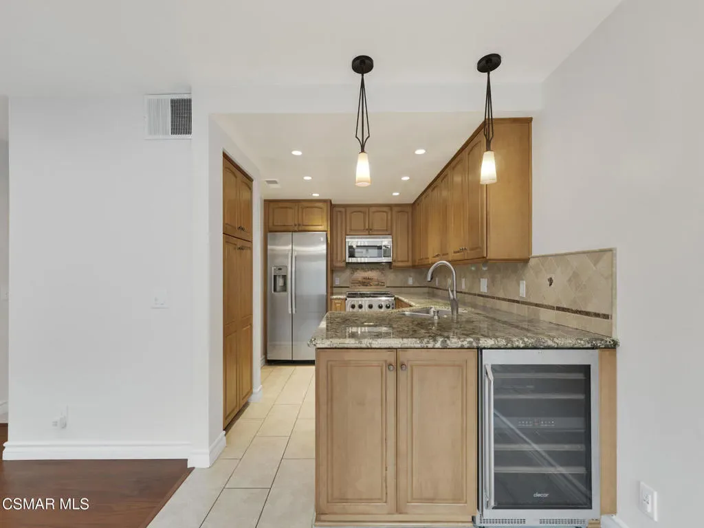 Located in Sandalwood Village in East Simi Valley, this beautifully maintained two-story condominium is surrounded by breathtaking mountain views. Offering 3 bedrooms, 2.5 baths, and approximately 1,280 sq ft of living space, the home shares only one common wall for added privacy and includes an attached two-car garage.The remodeled kitchen features granite countertops with a decorative custom backsplash, attractive cabinetry, and stainless steel appliances including a refrigerator, gas range, dishwasher, microwave, sink, and a separate built-in wine refrigerator. The inviting living room offers a cozy fireplace and flows into the dining area with a sliding glass door leading to the charming, fully enclosed patio enhanced with attractive pavers and direct access to the garage–perfect for relaxing or entertaining.Upstairs, the spacious primary suite features a vaulted ceiling with ceiling fan, walk-in closet, and an ensuite bathroom with a separate large vanity area. Two additional bedrooms are also located upstairs and share a bath with a tub/shower combination; the second bedroom also features a vaulted ceiling and ceiling fan.Additional amenities include a convenient guest half bath downstairs, central heating and air, dual-pane windows, indoor stacked laundry with washer and dryer included, vertical and wood-like blinds throughout, newer bath plumbing hardware, and updated vanity light fixtures. The home features no carpet throughout, offering easy maintenance and a clean, modern feel.Residents enjoy excellent community amenities including a pool, spa, tennis court, and ample guest parking. Ideally located near hiking and biking trails, shopping, and convenient freeway access, this home offers comfortable living in a beautiful and scenic setting.