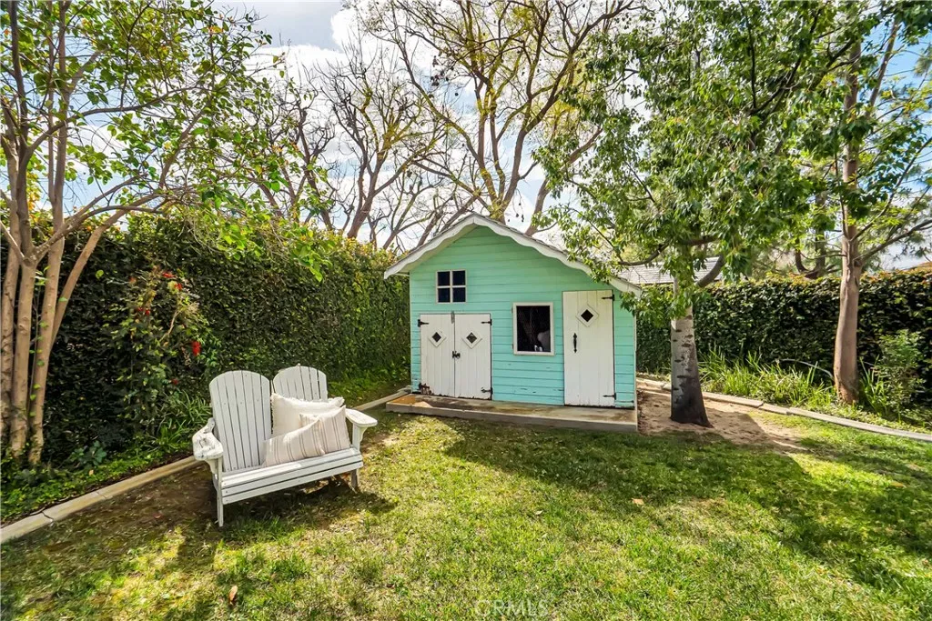 The resort-style backyard is an entertainer’s dream with a freeform pool and spa, rock waterfall, large grassy area, covered patio with surround sound, and even a charming two-story playhouse.