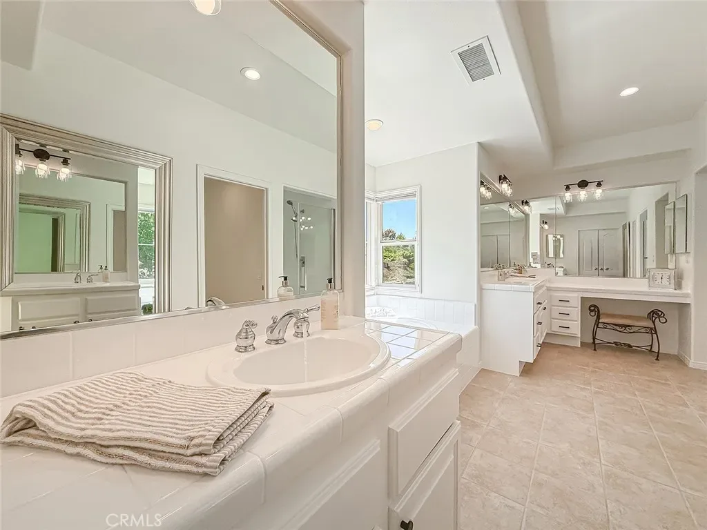 Downstairs features a generously sized bedroom and a full bathroom with a shower, ideal for guests or extended family. Upstairs, you’ll find two well-sized bedrooms connected by a Jack and Jill bathroom, along with a spacious primary suite that truly stands out. The primary bedroom captures beautiful views and includes a large sitting area, perfect for a private retreat. The en-suite bathroom offers a soaking tub, separate shower, double sinks, a dedicated makeup counter, and a large walk-in closet.