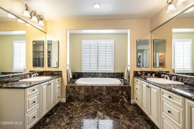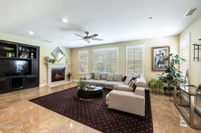 Your dreams can come true here in Big Sky! This gorgeous Simi Valley home is the one you’ve been waiting for! Discover the embodiment of style and comfortable living at this 2006 year-built newer home in the much desired Windstone tract, boasting almost 4,000 sq. ft. Upon entry, you are greeted by an impressive foyer, lofty ceilings, and open, airy rooms. Plantation shutters and beautiful flooring are featured throughout the house. This gorgeous residence features four spacious bedrooms and a study. Each of the three upstairs bedrooms has their own bathroom. The downstairs guest bedroom also includes its own bathroom with a convenient walk-in shower. Entertain with ease in the open living area, with a see-through fireplace from the living room to the study, a spacious dining area, a powder room, and a wonderful, oversized center island kitchen with all the bells & whistles. The kitchen features a built-in refrigerator, stainless steel appliances, bar stool seating at the island as well as an eating area. In addition, it overlooks the amazing family room with another fireplace. Moving upstairs, the primary suite is a relaxing sanctuary, complete with a sitting room/retreat perfect for a nursery, home office, workout room, and more. The beautiful ensuite primary bathroom is spa-like, offering the ultimate in comfort with dual sinks, a generously sized soaking tub, a separate shower and a large walk-in closet. Also upstairs, you will find a loft/sitting area with a built-in desk. The professionally, landscaped, low-maintenance yard is perfect for entertaining. The backyard is ready for summer gathering, dining al fresco with the custom BBQ center, or simply unwinding in the sparkling pool with spa and water features Additionally, the home offers the convenience of an indoor laundry room, newer dual zone central air & heat, recessed lighting, direct access 3 car garage with EV charger, and energy saving solar panels. The Big Sky community can complement your lifestyle with wonderful walking and hiking paths, parks, easy access to shopping, and more amidst a coastal breeze.