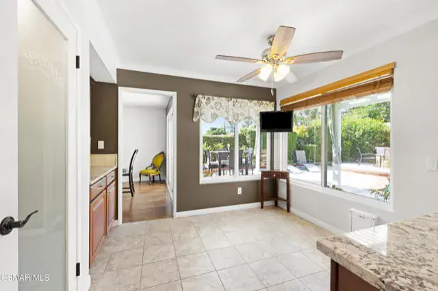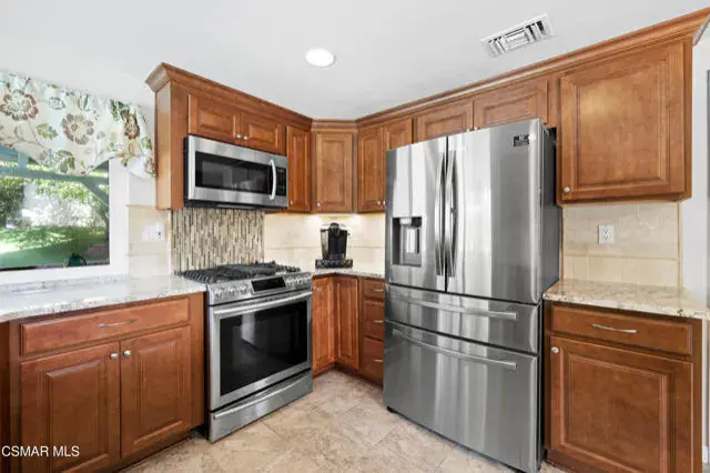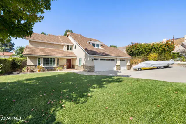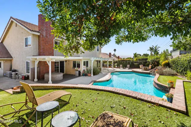 SoCal Living at Its Finest – Private Pool, Owned Solar & Prime Location! Welcome to your dream home tucked away on a quiet cul-de-sac in one of Simi Valley’s most desirable neighborhoods! This beautifully maintained, move-in ready 4 bedroom, 2.5 bath residence offers the perfect blend of comfort, style, and energy efficiency. Step inside to gleaming wood floors, soaring beamed ceilings, plantation shutters, and an abundance of natural light. The inviting living room features a charming bay window, while the formal dining area is ideal for entertaining. A cozy family room with a fireplace and wet bar creates the perfect gathering space. The remodeled chef’s kitchen is a standout, showcasing granite countertops, a designer tile backsplash, stainless steel appliances, walk-in pantry, and a sunny breakfast nook. Upstairs, the spacious primary suite offers a true retreat with cathedral ceilings, a second fireplace, dual sinks, soaking tub, separate shower, gorgeous tile floors, and a large walk-in closet. Enjoy the ultimate Southern California lifestyle in your private backyard oasis–complete with a sparkling pool and waterfall, separate above-ground spa, fire-pit, and two covered patios for outdoor living and entertaining. Additional features include: Direct access 3-car garage, owned solar system (18 panels, 8 kW) with ultra-low utility bills, copper plumbing, NEST thermostat & RING security system, dual-pane windows and doors, tankless water heater, Central HVAC, recessed lighting, abundance of storage, plus exterior with new stone siding and stucco. This home truly has it all – location, upgrades, energy savings, and space to relax. Properties in this neighborhood are rarely available–don’t miss your chance!