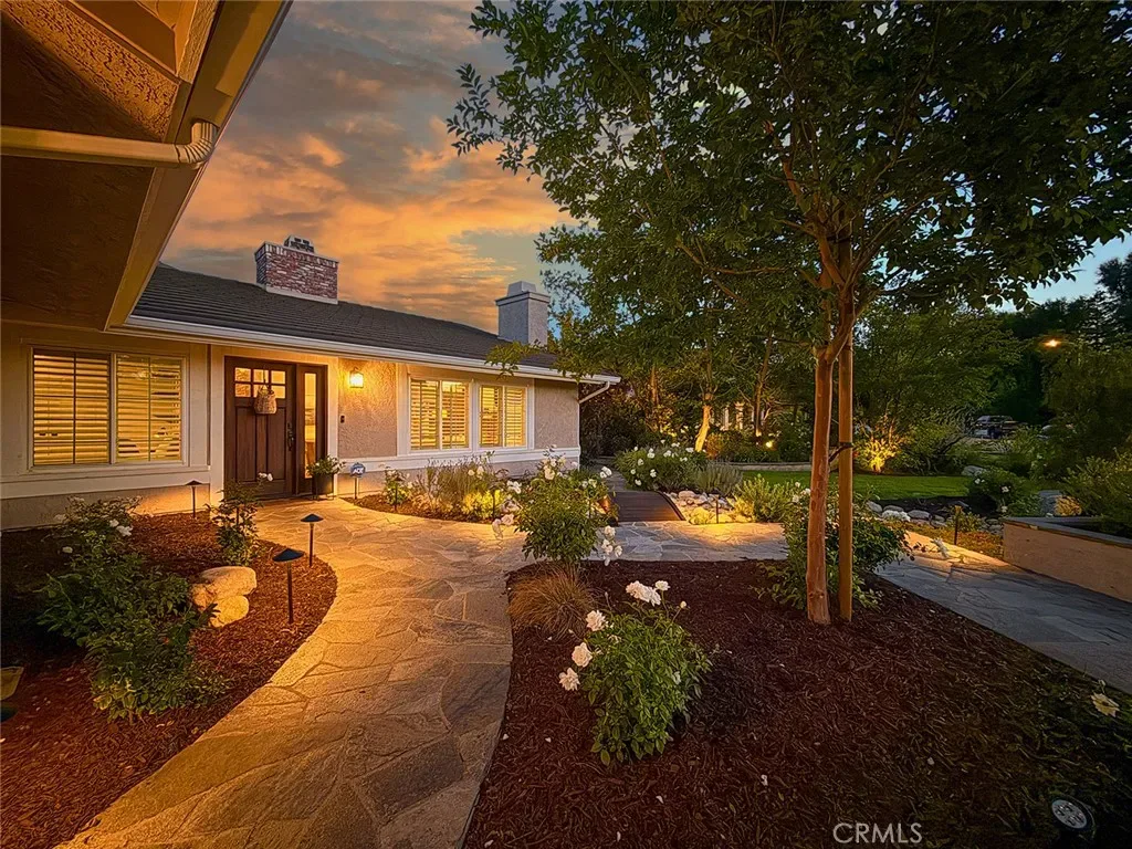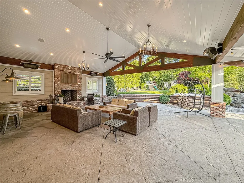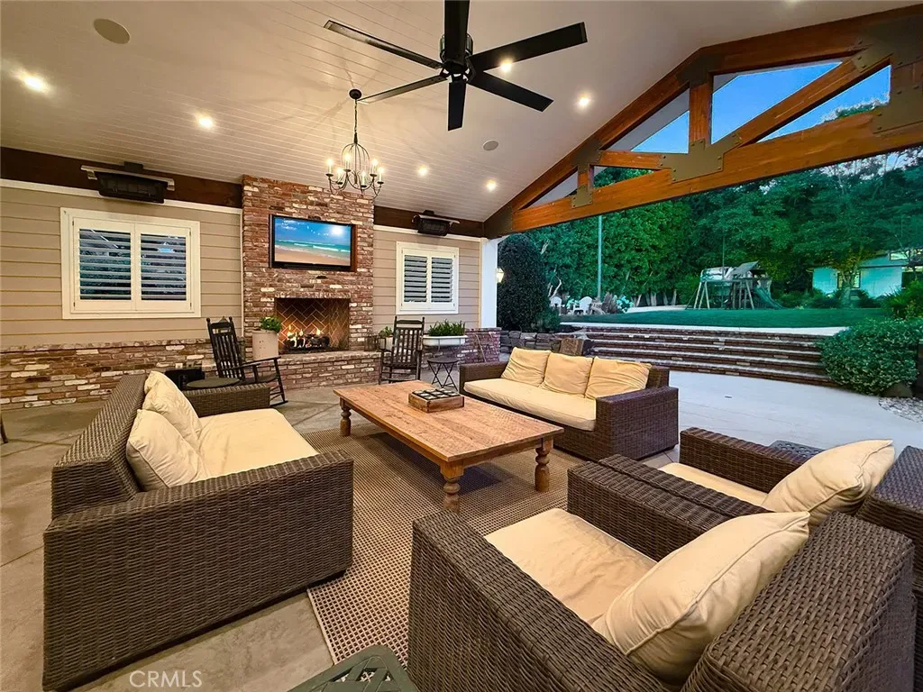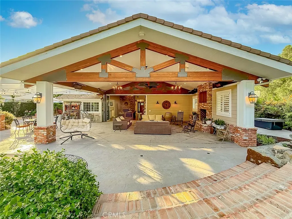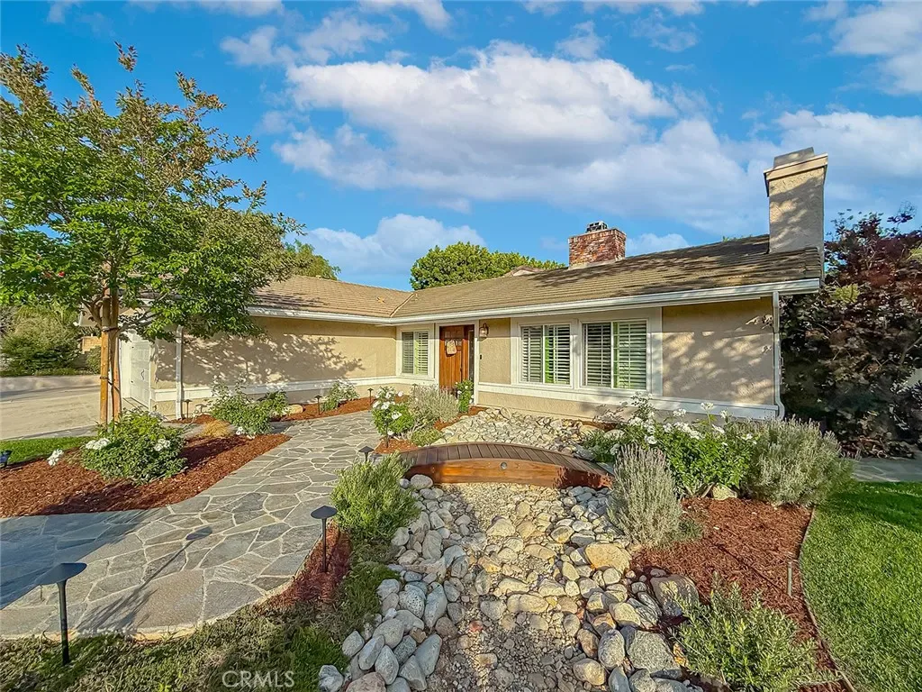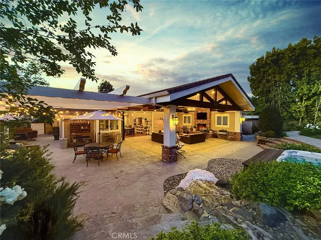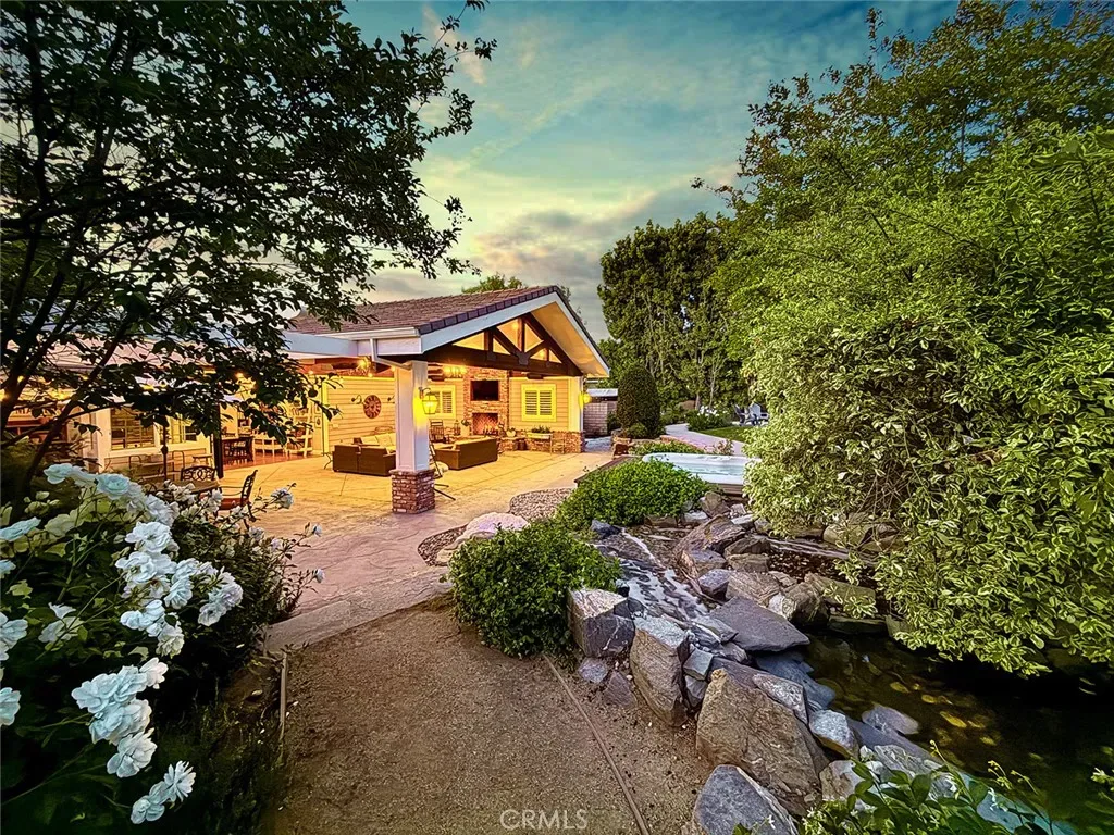 From the moment you arrive, the front yard makes a lasting impression with dry river rock, blooming roses, and mature trees. Inside, vaulted ceilings, natural light, and a striking red brick fireplace define the main living space. Expansive folding glass doors open fully, creating a seamless indoor outdoor connection. The kitchen offers stunning upgrades, a butcher block island, and a farmhouse sink beneath a window overlooking the yard. Adjacent library with built-in cabinetry and side yard access. Solid core doors, recessed LED lighting, and numerous upgrades run throughout. Both bathrooms have been fully renovated, most recently in 2025. The backyard is designed for year-round enjoyment with an incredible sense of space, lush green grass, and room to truly spread out. A spectacular covered patio of approximately 780 sq ft features a hardwood tongue and groove ceiling, chandeliers, recessed LED lighting, an industrial fan, and four gas heaters, along with an outdoor fireplace and TV, with the vaulted ceiling continuing from inside to out. Additional outdoor features include a lattice patio cover off the kitchen, built in BBQs, above ground jacuzzi spa, pondless water feature, DG and concrete pathways, master bedroom courtyard, and extensive landscape lighting.