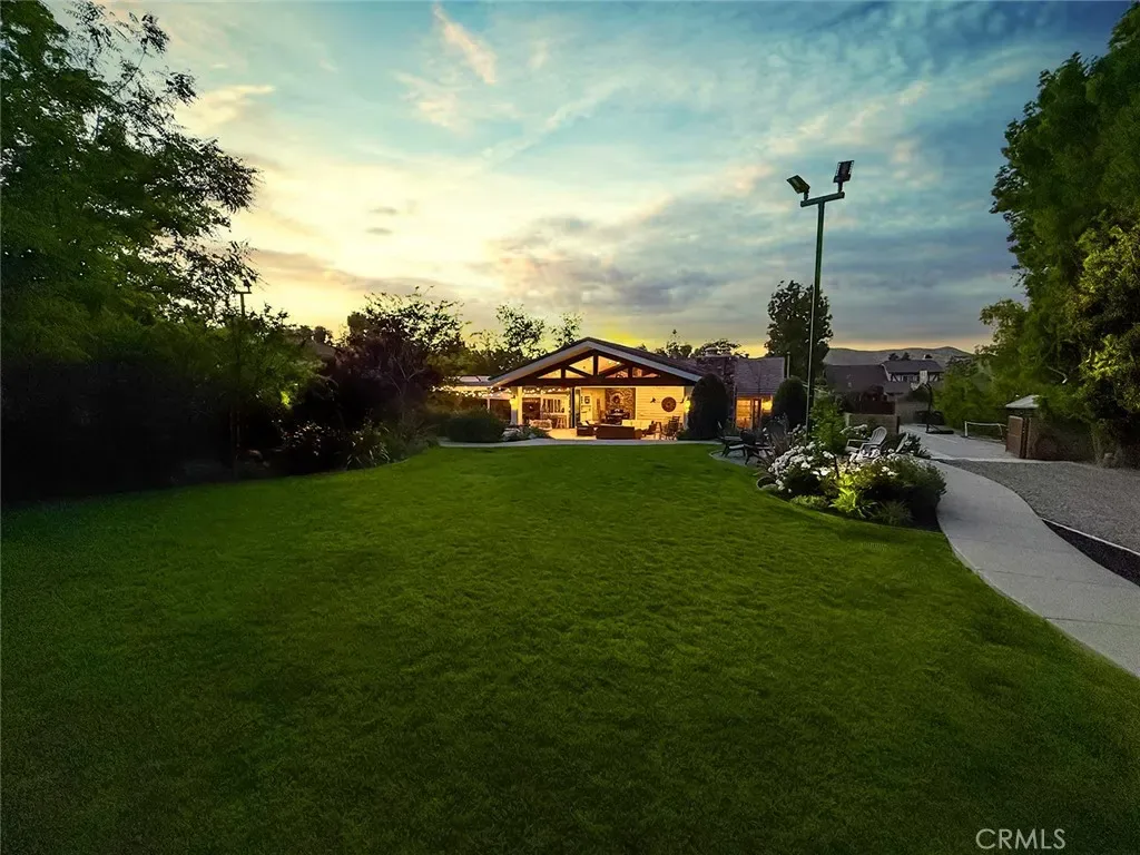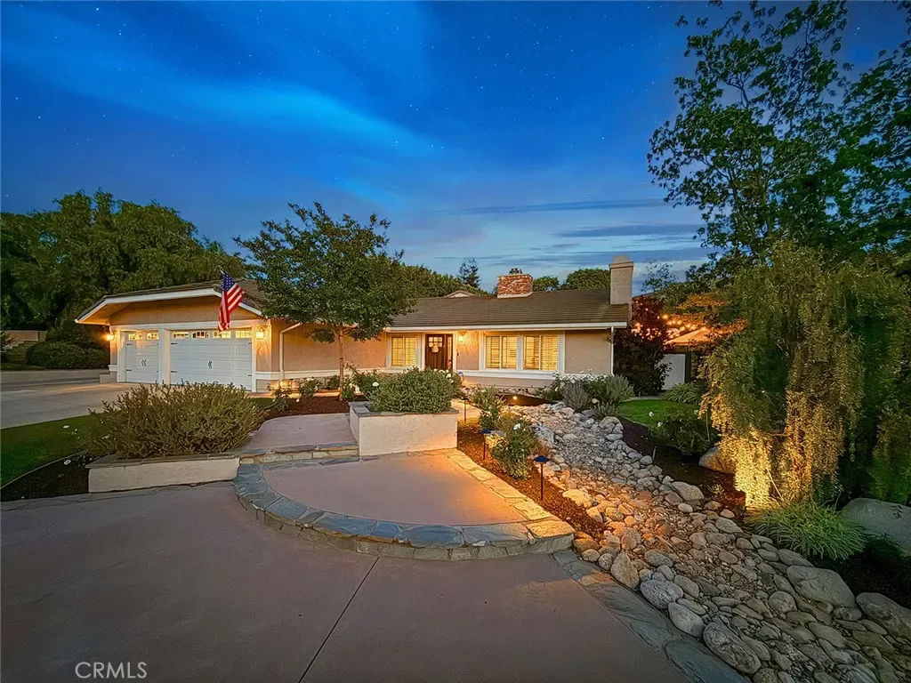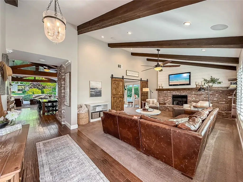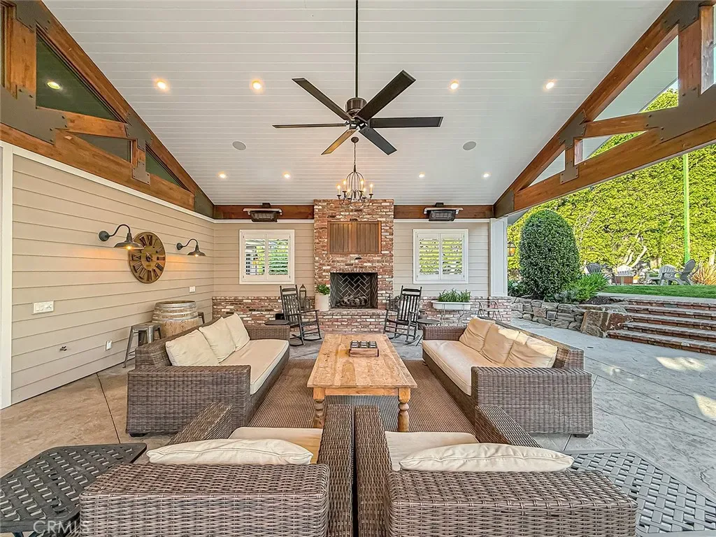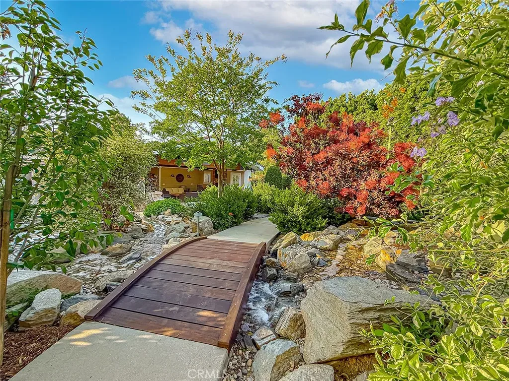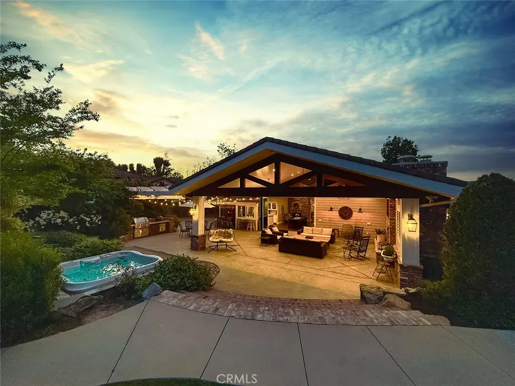 From the moment you arrive, the front yard makes a lasting impression with dry river rock, blooming roses, and mature trees. Inside, vaulted ceilings, natural light, and a striking red brick fireplace define the main living space. Expansive folding glass doors open fully, creating a seamless indoor outdoor connection. The kitchen offers stunning upgrades, a butcher block island, and a farmhouse sink beneath a window overlooking the yard. Adjacent library with built-in cabinetry and side yard access. Solid core doors, recessed LED lighting, and numerous upgrades run throughout. Both bathrooms have been fully renovated, most recently in 2025. The backyard is designed for year-round enjoyment with an incredible sense of space, lush green grass, and room to truly spread out. A spectacular covered patio of approximately 780 sq ft features a hardwood tongue and groove ceiling, chandeliers, recessed LED lighting, an industrial fan, and four gas heaters, along with an outdoor fireplace and TV, with the vaulted ceiling continuing from inside to out. Additional outdoor features include a lattice patio cover off the kitchen, built in BBQs, above ground jacuzzi spa, pondless water feature, DG and concrete pathways, master bedroom courtyard, and extensive landscape lighting.