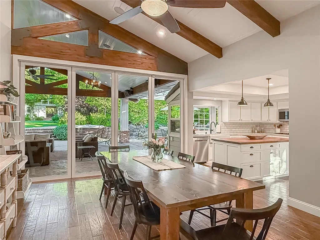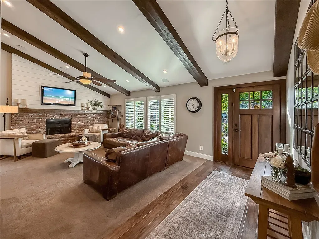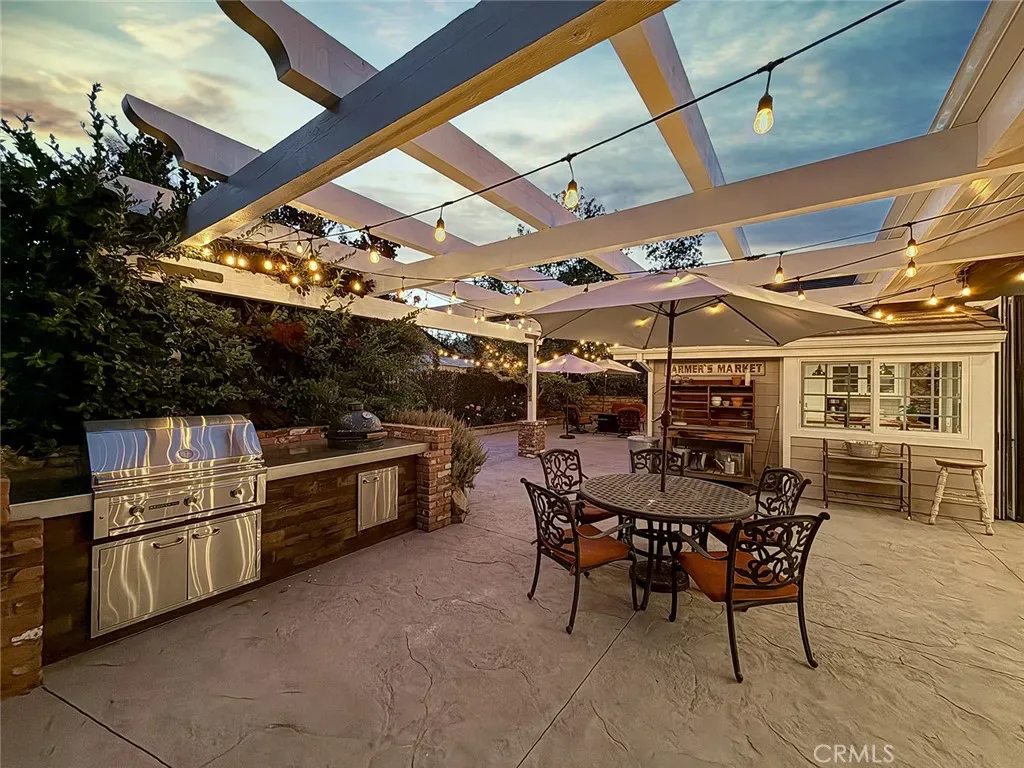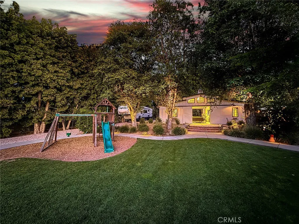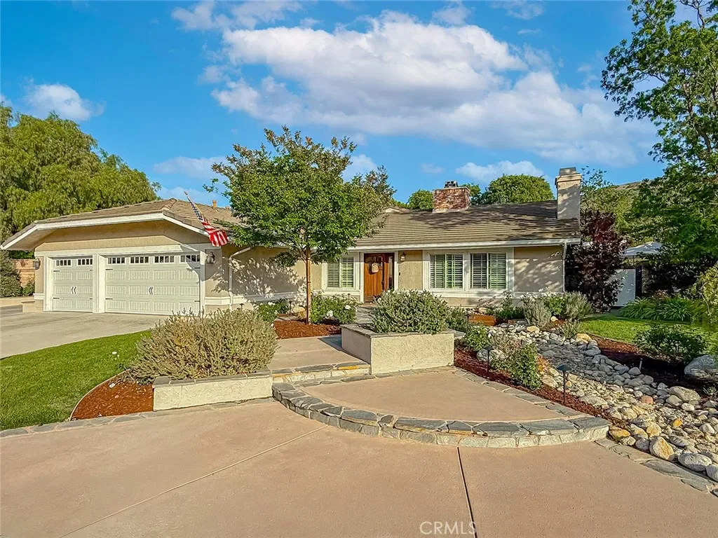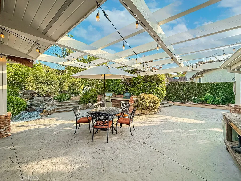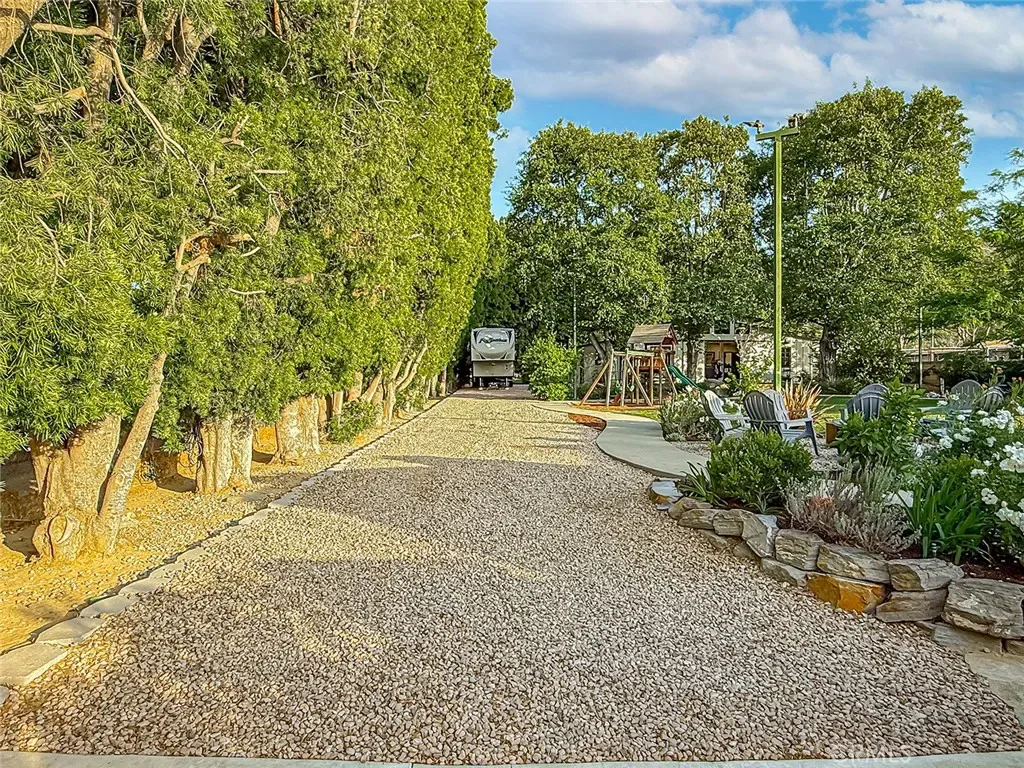 From the moment you arrive, the front yard makes a lasting impression with dry river rock, blooming roses, and mature trees. Inside, vaulted ceilings, natural light, and a striking red brick fireplace define the main living space. Expansive folding glass doors open fully, creating a seamless indoor outdoor connection. The kitchen offers stunning upgrades, a butcher block island, and a farmhouse sink beneath a window overlooking the yard. Adjacent library with built-in cabinetry and side yard access. Solid core doors, recessed LED lighting, and numerous upgrades run throughout. Both bathrooms have been fully renovated, most recently in 2025. The backyard is designed for year-round enjoyment with an incredible sense of space, lush green grass, and room to truly spread out. A spectacular covered patio of approximately 780 sq ft features a hardwood tongue and groove ceiling, chandeliers, recessed LED lighting, an industrial fan, and four gas heaters, along with an outdoor fireplace and TV, with the vaulted ceiling continuing from inside to out. Additional outdoor features include a lattice patio cover off the kitchen, built in BBQs, above ground jacuzzi spa, pondless water feature, DG and concrete pathways, master bedroom courtyard, and extensive landscape lighting.