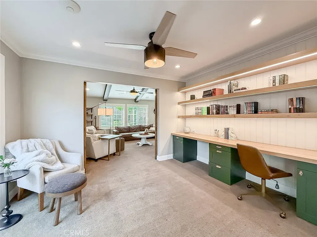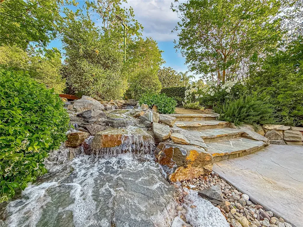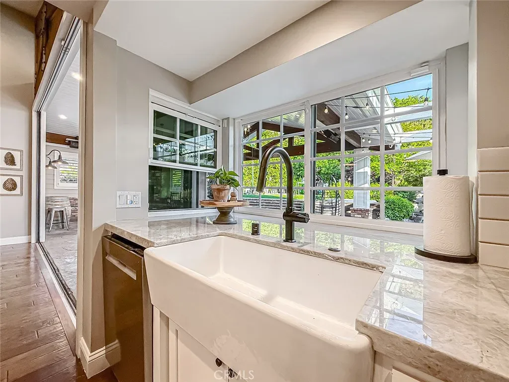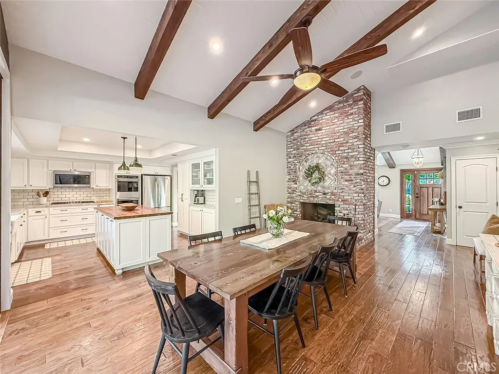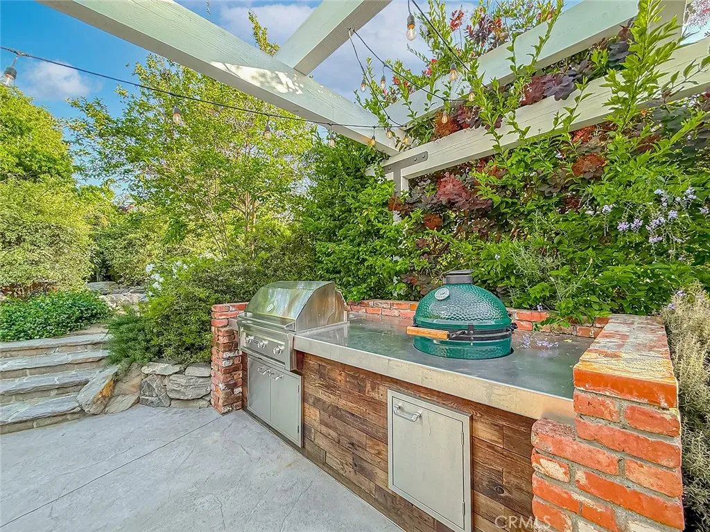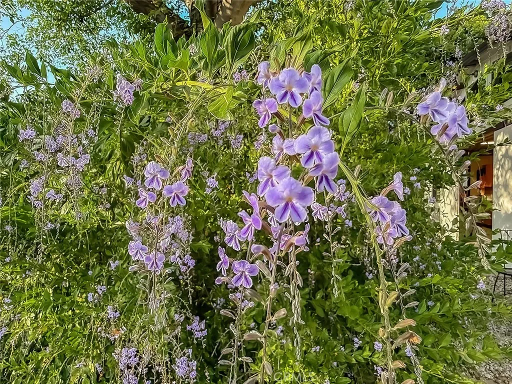 From the moment you arrive, the front yard makes a lasting impression with dry river rock, blooming roses, and mature trees. Inside, vaulted ceilings, natural light, and a striking red brick fireplace define the main living space. Expansive folding glass doors open fully, creating a seamless indoor outdoor connection. The kitchen offers stunning upgrades, a butcher block island, and a farmhouse sink beneath a window overlooking the yard. Adjacent library with built-in cabinetry and side yard access. Solid core doors, recessed LED lighting, and numerous upgrades run throughout. Both bathrooms have been fully renovated, most recently in 2025. The backyard is designed for year-round enjoyment with an incredible sense of space, lush green grass, and room to truly spread out. A spectacular covered patio of approximately 780 sq ft features a hardwood tongue and groove ceiling, chandeliers, recessed LED lighting, an industrial fan, and four gas heaters, along with an outdoor fireplace and TV, with the vaulted ceiling continuing from inside to out. Additional outdoor features include a lattice patio cover off the kitchen, built in BBQs, above ground jacuzzi spa, pondless water feature, DG and concrete pathways, master bedroom courtyard, and extensive landscape lighting.
