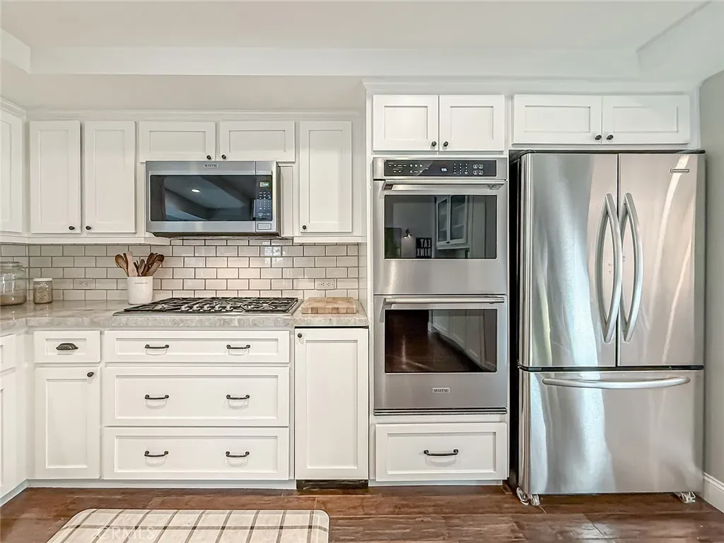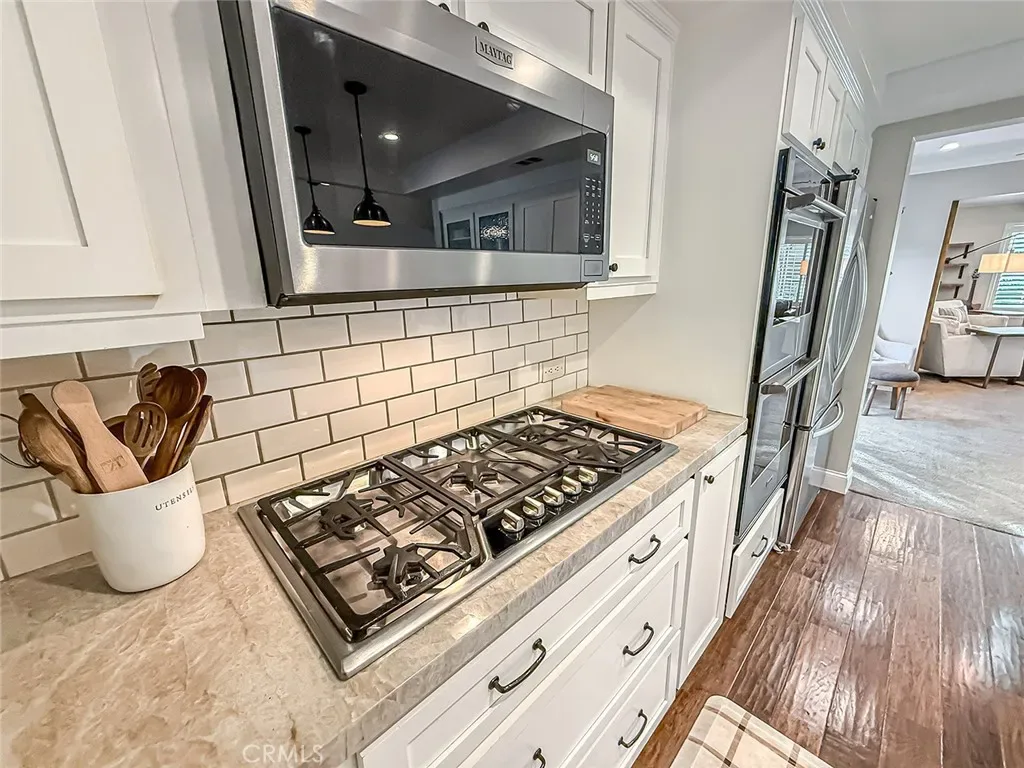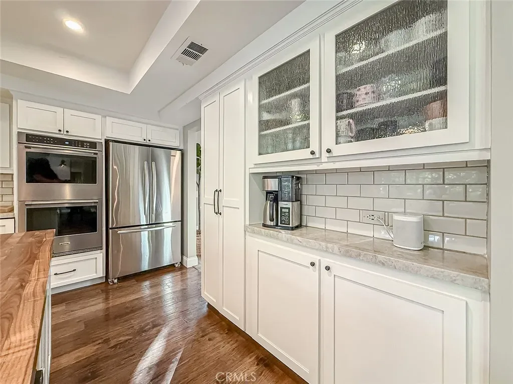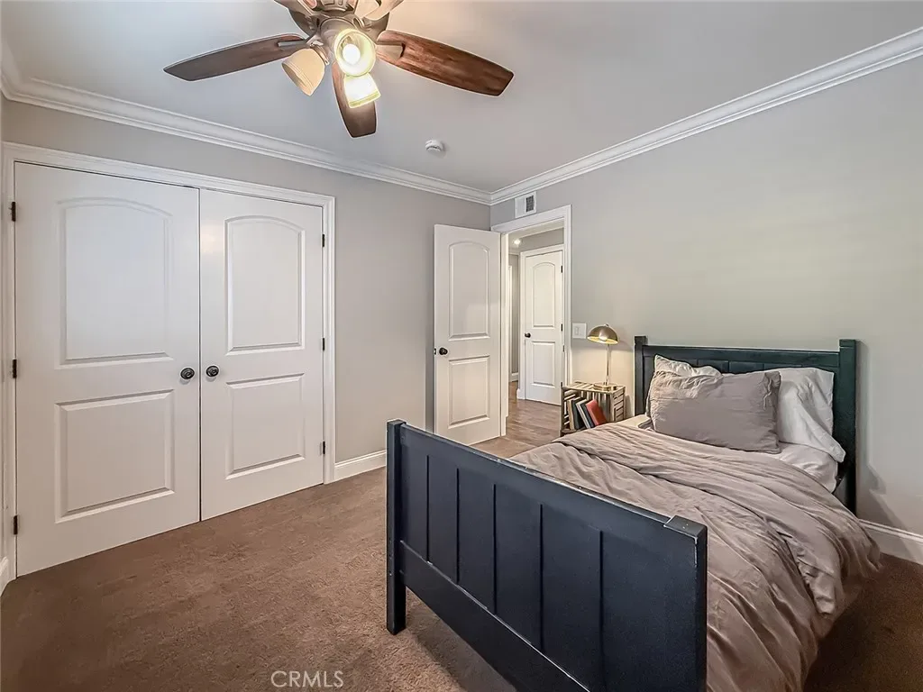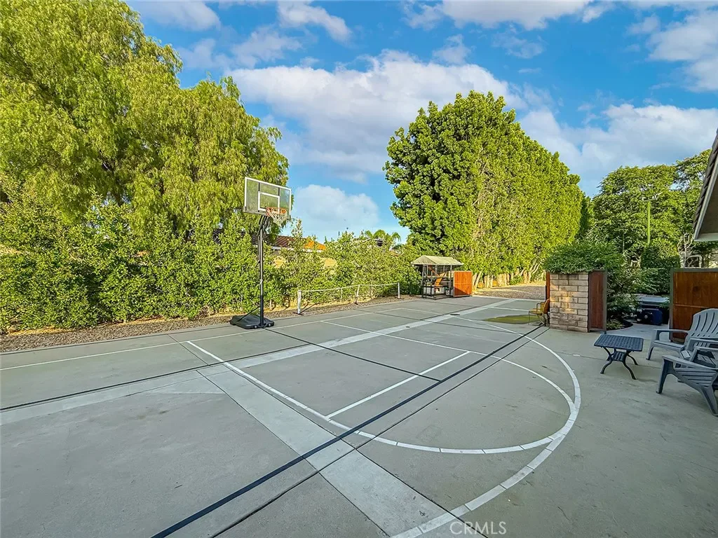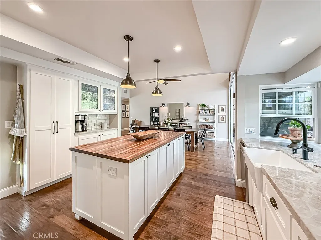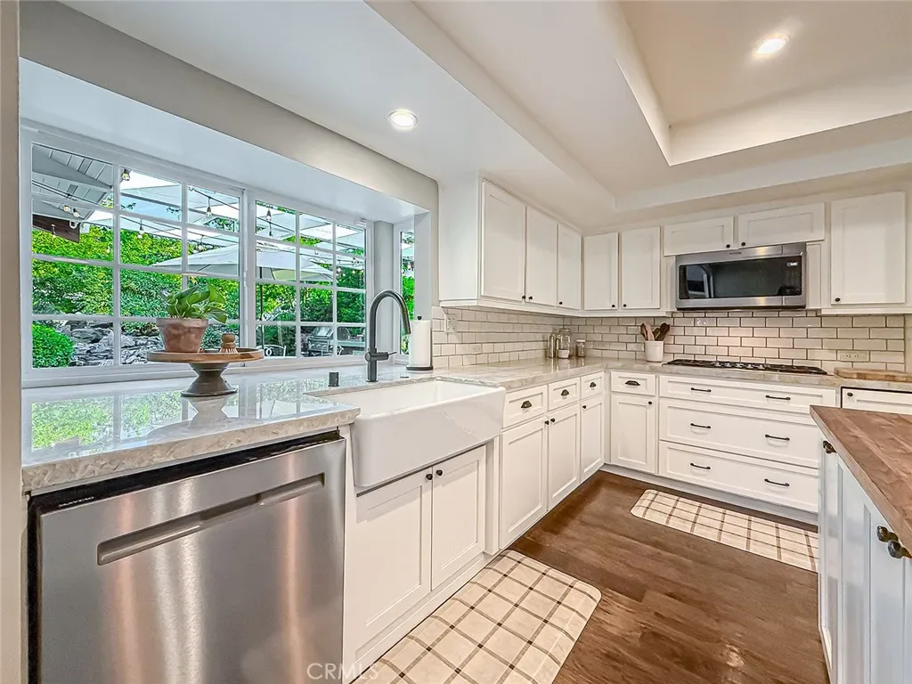 From the moment you arrive, the front yard makes a lasting impression with dry river rock, blooming roses, and mature trees. Inside, vaulted ceilings, natural light, and a striking red brick fireplace define the main living space. Expansive folding glass doors open fully, creating a seamless indoor outdoor connection. The kitchen offers stunning upgrades, a butcher block island, and a farmhouse sink beneath a window overlooking the yard. Adjacent library with built-in cabinetry and side yard access. Solid core doors, recessed LED lighting, and numerous upgrades run throughout. Both bathrooms have been fully renovated, most recently in 2025. The backyard is designed for year-round enjoyment with an incredible sense of space, lush green grass, and room to truly spread out. A spectacular covered patio of approximately 780 sq ft features a hardwood tongue and groove ceiling, chandeliers, recessed LED lighting, an industrial fan, and four gas heaters, along with an outdoor fireplace and TV, with the vaulted ceiling continuing from inside to out. Additional outdoor features include a lattice patio cover off the kitchen, built in BBQs, above ground jacuzzi spa, pondless water feature, DG and concrete pathways, master bedroom courtyard, and extensive landscape lighting.