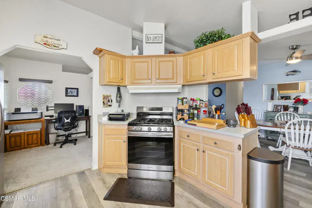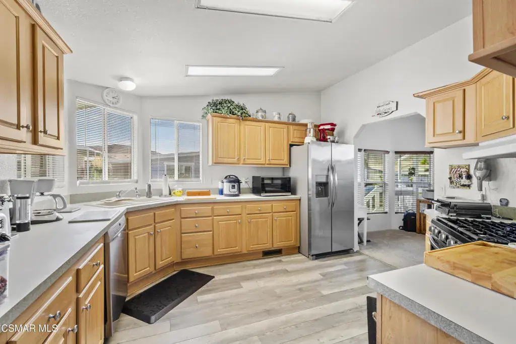 Welcome to this beautifully maintained, move-in ready home located in the highly desirable Friendly Village senior community of Simi Valley. Built in 2002, this spacious 3 bedroom, 2 bathroom home offers peaceful mountain views and a bright, open floor plan. Step inside to find vaulted ceilings, all new paint and flooring, dual pane windows, and central air & heat throughout. The expansive living room flows seamlessly into a well-equipped cook’s kitchen, featuring ample cabinet and counter space, newer stainless steel appliances, and a charming in-kitchen dining area. A versatile flex space nearby is perfect for a formal dining room, home office, or hobby area. The private primary suite boasts a walk-in closet and a large ensuite bath with dual sinks, a soaking tub, and a separate shower. Two additional bedrooms and a full hall bath are perfect for guests or visiting family. You won’t be left in the dark here! Peace of mind will be yours during emergency situations with the back-up power generator system. In addition, you will also enjoy the convenience of an indoor laundry room with extra storage. Outside, the home includes covered parking for two cars, a storage shed/workshop, and a patio area with fire pit and BBQ–ideal for relaxing or entertaining. Residents of Friendly Village enjoy fantastic amenities including a clubhouse with kitchen area, pool & spa, putting green, dog run, library, fitness center, RV storage (extra fee), and ample guest parking. Conveniently located near shopping, dining, hiking trails, parks, the Reagan Library, and the 118 Freeway – this is your opportunity to enjoy the best of 55+ living in the prestigious Friendly Village.